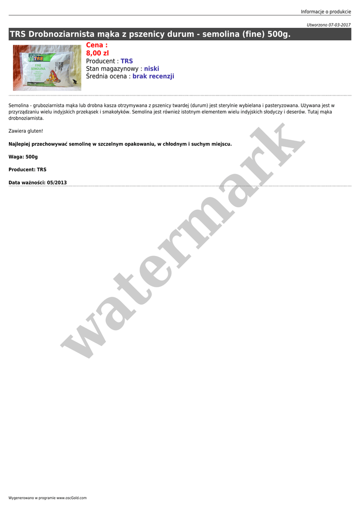 Informacje o produkcie Utworzono 07-03-2017 TRS Drobnoziarnista mąka z pszenicy durum - semolina (fine) 500g. Cena : 8,00 zl Producent : TRS Stan magazynowy : niski Średnia ocena : brak recenzji Semolina - gruboziarnista mąka lub drobna kasza otrzymywana z pszenicy twardej (durum) jest sterylnie wybielana i pasteryzowana. Używana jest w przyrządzaniu wielu indyjskich przekąsek i smakołyków. Semolina jest również istotnym elementem wielu indyjskich słodyczy i deserów. Tutaj mąka drobnoziarnista. Zawiera gluten! Waga: 500g Producent: TRS w at Data ważności: 05/2013 er m ar k Najlepiej przechowywać semolinę w szczelnym opakowaniu, w chłodnym i suchym miejscu. Wygenerowano w programie www.oscGold.com