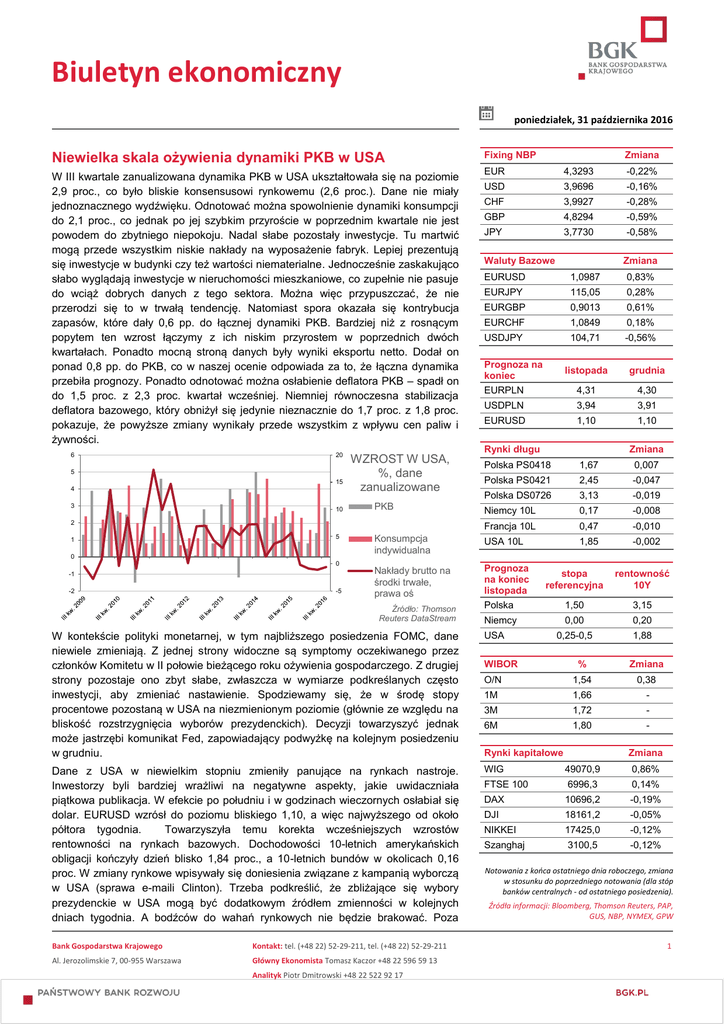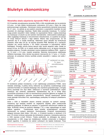 Biuletyn ekonomiczny poniedziałek, 31 października 2016 Niewielka skala ożywienia dynamiki PKB w USA Fixing NBP W III kwartale zanualizowana dynamika PKB w USA ukształtowała się na poziomie 2,9 proc., co było bliskie konsensusowi rynkowemu (2,6 proc.). Dane nie miały jednoznacznego wydźwięku. Odnotować można spowolnienie dynamiki konsumpcji do 2,1 proc., co jednak po jej szybkim przyroście w poprzednim kwartale nie jest powodem do zbytniego niepokoju. Nadal słabe pozostały inwestycje. Tu martwić mogą przede wszystkim niskie nakłady na wyposażenie fabryk. Lepiej prezentują się inwestycje w budynki czy też wartości niematerialne. Jednocześnie zaskakująco słabo wyglądają inwestycje w nieruchomości mieszkaniowe, co zupełnie nie pasuje do wciąż dobrych danych z tego sektora. Można więc przypuszczać, że nie przerodzi się to w trwałą tendencję. Natomiast spora okazała się kontrybucja zapasów, które dały 0,6 pp. do łącznej dynamiki PKB. Bardziej niż z rosnącym popytem ten wzrost łączymy z ich niskim przyrostem w poprzednich dwóch kwartałach. Ponadto mocną stroną danych były wyniki eksportu netto. Dodał on ponad 0,8 pp. do PKB, co w naszej ocenie odpowiada za to, że łączna dynamika przebiła prognozy. Ponadto odnotować można osłabienie deflatora PKB – spadł on do 1,5 proc. z 2,3 proc. kwartał wcześniej. Niemniej równoczesna stabilizacja deflatora bazowego, który obniżył się jedynie nieznacznie do 1,7 proc. z 1,8 proc. pokazuje, że powyższe zmiany wynikały przede wszystkim z wpływu cen paliw i żywności. EUR 4,3293 -0,22% USD 3,9696 -0,16% CHF 3,9927 -0,28% GBP 4,8294 -0,59% JPY 3,7730 -0,58% 6 20 5 15 4 3 10 WZROST W USA, %, dane zanualizowane 5 0 0 -1 -2 -5 Waluty Bazowe Zmiana EURUSD 1,0987 0,83% EURJPY 115,05 0,28% EURGBP 0,9013 0,61% EURCHF 1,0849 0,18% USDJPY 104,71 -0,56% Prognoza na koniec EURPLN listopada grudnia 4,31 4,30 USDPLN 3,94 3,91 EURUSD 1,10 1,10 Rynki długu Zmiana Polska PS0418 1,67 0,007 Polska PS0421 2,45 -0,047 Polska DS0726 3,13 -0,019 Niemcy 10L 0,17 -0,008 Francja 10L 0,47 -0,010 Konsumpcja indywidualna USA 10L 1,85 -0,002 Nakłady brutto na środki trwałe, prawa oś Prognoza na koniec listopada Polska PKB 2 1 Zmiana Źródło: Thomson Reuters DataStream stopa referencyjna rentowność 10Y 1,50 3,15 0,00 0,20 0,25-0,5 1,88 Niemcy W kontekście polityki monetarnej, w tym najbliższego posiedzenia FOMC, dane niewiele zmieniają. Z jednej strony widoczne są symptomy oczekiwanego przez członków Komitetu w II połowie bieżącego roku ożywienia gospodarczego. Z drugiej strony pozostaje ono zbyt słabe, zwłaszcza w wymiarze podkreślanych często inwestycji, aby zmieniać nastawienie. Spodziewamy się, że w środę stopy procentowe pozostaną w USA na niezmienionym poziomie (głównie ze względu na bliskość rozstrzygnięcia wyborów prezydenckich). Decyzji towarzyszyć jednak może jastrzębi komunikat Fed, zapowiadający podwyżkę na kolejnym posiedzeniu w grudniu. USA Dane z USA w niewielkim stopniu zmieniły panujące na rynkach nastroje. Inwestorzy byli bardziej wrażliwi na negatywne aspekty, jakie uwidaczniała piątkowa publikacja. W efekcie po południu i w godzinach wieczornych osłabiał się dolar. EURUSD wzrósł do poziomu bliskiego 1,10, a więc najwyższego od około półtora tygodnia. Towarzyszyła temu korekta wcześniejszych wzrostów rentowności na rynkach bazowych. Dochodowości 10-letnich amerykańskich obligacji kończyły dzień blisko 1,84 proc., a 10-letnich bundów w okolicach 0,16 proc. W zmiany rynkowe wpisywały się doniesienia związane z kampanią wyborczą w USA (sprawa e-maili Clinton). Trzeba podkreślić, że zbliżające się wybory prezydenckie w USA mogą być dodatkowym źródłem zmienności w kolejnych dniach tygodnia. A bodźców do wahań rynkowych nie będzie brakować. Poza WIG 49070,9 0,86% FTSE 100 6996,3 0,14% DAX 10696,2 -0,19% DJI 18161,2 -0,05% NIKKEI 17425,0 -0,12% Szanghaj 3100,5 -0,12% Bank Gospodarstwa Krajowego Kontakt: tel. (+48 22) 52-29-211, tel. (+48 22) 52-29-211 Al. Jerozolimskie 7, 00-955 Warszawa Główny Ekonomista Tomasz Kaczor +48 22 596 59 13 Analityk Piotr Dmitrowski +48 22 522 92 17 WIBOR % Zmiana O/N 1,54 0,38 1M 1,66 - 3M 1,72 - 6M 1,80 - Rynki kapitałowe Zmiana Notowania z końca ostatniego dnia roboczego, zmiana w stosunku do poprzedniego notowania (dla stóp banków centralnych - od ostatniego posiedzenia). Źródła informacji: Bloomberg, Thomson Reuters, PAP, GUS, NBP, NYMEX, GPW 1 Biuletyn ekonomiczny poniedziałek, 31 października 2016 roczny indeks CPI wzrośnie do poziomu minus 0,2 proc. z minus 0,5 proc. we wrześniu, co jest poziomem wyższym niż zakłada mediana prognoz rynkowych (minus 0,3 proc.). Zakładamy, że publikacji GUS będą towarzyszyć solidne dane ze strefy euro, co powinno rozjaśnić obraz krajowego wzrostu gospodarczego i tym samym oddziaływać korzystnie na wycenę złotego. Spodziewamy się więc przesunięcia w kierunku 4,30. wspomnianym posiedzeniem FOMC w tym względzie wymienić można wyniki posiedzenia BoE oraz dane z amerykańskiego rynku pracy. Natomiast dzisiaj najważniejszym wydarzeniem będzie publikacja danych o wzroście gospodarczym w strefie euro za III kwartał. Odczyt zapewne nie będzie imponujący, blisko 0,3 proc. kdk. Niemniej trudno sytuacji w Eurolandzie nie rozpatrywać przez pryzmat ostatniej poprawy indeksów wyprzedzających. Pasuje do tego piątkowa publikacja indeksu ESI publikowanego przez KE. Ten z poziomem 106,3 pkt. znajduje się blisko 5-letnich szczytów. Trzeba przy tym odnotować szeroki geograficznie, jak i sektorowo charakter poprawy danych. Tak więc pod koniec bieżącego roku gospodarka strefy euro zapewne przyspieszy. Jeżeli połączymy to z rosnącą inflacją – dziś Eurostat zaprezentuje wstępny odczyt HICP za październik (prawdopodobny wzrost do 0,5 proc. rdr) – to obraz koniunktury w Eurolandzie, choć nadal daleki od huraopty