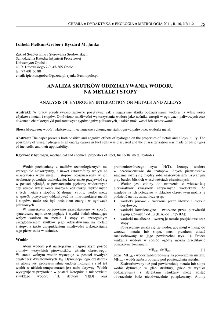 CHEMIA ● DYDAKTYKA ● EKOLOGIA ● METROLOGIA 2011, R. 16, NR 1-2 75 Izabela Pietkun-Greber i Ryszard M. Janka Zakład Sozotechniki i Sterowania Środowiskiem Samodzielna Katedra Inżynierii Procesowej Uniwersytet Opolski ul. R. Dmowskiego 7-9, 45-365 Opole tel. 77 401 66 80 email: [email protected], [email protected] ANALIZA SKUTKÓW ODDZIAŁYWANIA WODORU NA METALE I STOPY ANALYSIS OF HYDROGEN INTERACTION ON METALS AND ALLOYS Abstrakt: W pracy przedstawiono zarówno pozytywne, jak i negatywne skutki oddziaływania wodoru na właściwości użytkowe metali i stopów. Omówiono możliwości wykorzystania wodoru jako nośnika energii w ogniwach paliwowych oraz dokonano charakterystyki podstawowych typów ogniw paliwowych, a także możliwości ich zastosowania. Słowa kluczowe: wodór, właściwości mechaniczne i chemiczne stali, ogniwa paliwowe, wodorki metali Abstract: The paper presents both positive and negative effects of hydrogen on the properties of metals and alloys utility. The possibility of using hydrogen as an energy carrier in fuel cells was discussed and the characterization was made of basic types of fuel cells, and their applicability. Keywords: hydrogen, mechanical and chemical properties of steel, fuel cells, metal hydrides Wodór pochłaniany z mediów technologicznych ma szczególnie niekorzystny, a nawet katastrofalny wpływ na właściwości wielu metali i stopów. Rozpuszczony w ich strukturze powoduje uszkodzenie, które może przejawiać się w postaci pęknięć, w powstawaniu pęcherzy wodorowych czy utracie właściwości nośnych konstrukcji wykonanych z tych metali i stopów. Z drugiej strony, wodór może w sposób pozytywny oddziaływać na mikrostrukturę metali i stopów, może też być nośnikiem energii w ogniwach paliwowych. W niniejszym opracowaniu przedstawiono w sposób syntetyczny najnowsze poglądy i wyniki badań obrazujące wpływ wodoru na metale i stopy ze szczególnym uwzględnieniem skutków jego oddziaływania na metale i stopy, a także uwypukleniem możliwości wykorzystania tego pierwiastka w technice. Wodór Atom wodoru jest najlżejszym i najprostszym pośród atomów wszystkich pierwiastków układu okresowego. W stanie wolnym wodór występuje w postaci trwałych cząsteczek dwuatomowych H2. Dysocjacja jego cząsteczek na atomy jest procesem silnie endotermicznym i stąd też wodór w niskich temperaturach jest mało aktywny. Wodór występuje w przyrodzie w postaci izotopów, a mianowicie: 1 2 zwykłego wodoru H, deuteru H(D) oraz promieniotwórczego trytu 3H(T). Izotopy wodoru w przeciwieństwie do izotopów innych pierwiastków znacznie różnią się między sobą właściwościami fizycznymi przy bardzo bliskich właściwościach chemicznych. Wodór jest zdolny do tworzenia z większością pierwiastków związków nazywanych wodorkami. Ze względu na ich położenie w układzie okresowym można je podzielić na trzy zasadnicze grup: • wodorki jonowe - tworzone przez litowce i ciężkie berylowce; • wodorki kowalencyjne - tworzone przez pierwiastki z grup głównych od 13 (IIIA) do 17 (VIIA); • wodorki metaliczne - tworzą je metale przejściowe oraz stopy. Powszechnie uważa się, że wodór, aby mógł wniknąć do wnętrza metalu lub stopu, musi przedtem zostać zaadsorbowany na jego powierzchni (rys. 1). Proces wnikania wodoru w sposób ogólny można przedstawić poniższym równaniem: (1) MHads→MHabs gdzie: MHads - wodór zaadsorbowany na powierzchni metalu, MHabs - wodór zaabsorbowany pod powierzchnią metalu. Zaabsorbowany tuż pod powierzchnią metalu lub stopu wodór dyfunduje w głąb struktury, gdzie w wyniku oddziaływania z defektami struktury może zostać odwracalnie bądź nieodwracalnie pułapkowany. Atomy 76 CHEMIA ● DYDAKTYKA ● EKOLOGIA ● METROLOGIA 2011, R. 16, NR 1-2 wodoru nieuwięzione w pułapkach po pewnym czasie dyfundują w kierunku powierzchni zewnętrznej, na której następuje proces jego rekombinacji, a następnie desorpcji. względnie proces ich adsorpcji może być efektem dyfuzji molekuł wodoru (5) z roztworów zasadowych lub obojętnych (5) H2 + M + e →MHads + OH+ Z przeprowadzonych dotychczas badań wynika [4, 5], że podczas przeprowadzania katodowej polaryzacji stali Cr23Ni5Mo3 w roztworach zasadowych wraz z upływem czasu wnika do niej więcej wodoru aniżeli z roztworów kwaśnych (rys. 1). Z kolei pochłanianie wodoru przez metal w roztworach kwaśnych jest intensywniejsze niż w roztworach obojętnych i zasadowych. Zaobserwowane różnice w ilości pochłanianego wodoru są spowodowane prawdopodobnie różnymi stanami aktywacji powierzchni próbek do wnikania wodoru. Przyczynia się to do występowania różnic w ilości wodoru zaadsorbowanego na powierzchni i w warstwach podpowierzchniowych oraz przenikającego do struktury stali, tj. tzw. wodoru dyfuzyjnego (rys. 2). Rys. 1. Schemat przenikania wodoru przez metale i stopy Fig. 1. Diagram of hydrogen permeation through metals and alloys Wodór do wnętrza metalu może być wprowadzany z fazy gazowej, w wyniku wyładowań elektrycznych w gazie rozrzedzonym, elektrochemicznie, a także w wyniku bombardowania protonami. Wnikanie wodoru z fazy gazowej musi być poprzedzone dysocjacją jego molekuł H2 → 2H (2) w warunkach występowania wysokiej temperatury i ciśnienia zgodnie z prawem Sivertsa. Niewielkie ilości wodoru atomowego występują także w normalnych warunkach ciśnienia i temperatur. Wnikanie wodoru z fazy gazowej do metali i stopów można przedstawić równaniem H2 + 2M → 2MHads (3) Przyjmuje się, że wnikanie wodoru z fazy gazowej do metali i stopów jest prawdopodobnie główną przyczyną kruchości m.in. stali o wysokiej wytrzymałości w środowiskach zawierających siarkowodór oraz wodę. Występuje to m.in. przy eksploatacji gazu ziemnego i ropy naftowej oraz w przemyśle rafineryjnym i petrochemicznym [1-3]. Nawodorowanie metali i ich stopów wodorem wydzielanym elektrolitycznie ma miejsce