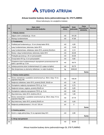 Arkusz kosztów budowy domu jednorodzinnego GL 378 FLAMING Arkusz kalkulacyjny nie uwzględnia instalacji. Opis robót Opis elementów budynku Lp Cena Jednostka Ilość jednostkowa miary jednostek elementu 1. Roboty ziemne 1 Zdjęcie ziemi urodzajnej gr. 15 cm m2 181,00 2 Wykopy fundamentowe m3 47,90 2. Fundamenty 3 Podkład pod fundamenty gr. 10 cm (chudy beton B10) m3 4,20 4 Ławy fundamentowe, betonowe, beton B15 m3 14,45 5 Ławy fundamentowe, żelbetowe, beton B15, przekrój 50x40cm m3 2,10 6 Ściany i słupy fundamentowe, betonowe, beton B15 m3 23,35 7 Podsypka gruzowa gr. 20 cm pod posadzki m3 24,00 8 Chudy beton B10 gr. 8 cm pod posadzki m3 9,60 9 Ocieplenie ścian fundamentowych styropianem przeznaczonym do styku z gruntem gr. 5 cm m2 59,70 10 Izolacja pozioma ścian fundamentowych (2 x papa na lepiku) m2 20,75 11 Stal zbrojeniowa na elementy żelbetowe ( w całym budynku) kg 2049,00 Suma 3. Ściany nośne parteru 12 Ściany zewnętrzne z pustaków ceramicznych gr. 30cm, klasy 15 na zaprawie klasy M5 m2 106,40 13 Nadproża żelbetowe, beton B15, przekrój 25x25, 25x22 cm m3 1,45 14 Docieplenie nadproży styropianem FS15, gr. 5 cm m2 5,75 15 Nadproże łukowe, ceglane, przekrój 25x25 cm m3 0,25 16 Docieplenie nadproża styropianem FS15, gr. 5 cm m2 0,90 17 Słup betonowy, beton B15, średnica 38 cm m3 1,00 18 Ściany wewnętrzne z pustaków ceramicznych gr. 25cm, klasy 15 na zaprawie klasy M5 m2 27,70 19 Słup betonowy, beton B15, przekrój 25x25 cm m3 0,20 20 Nadproża prefabrykowane L-19 o dł. 120 cm szt 2 Suma 4. Kominy parteru 21 Komin z cegły pełnej klasy 15 na zaprawie klasy M 5 m3 2,95 Suma 5. Strop nad parterem 22 m2 90,90 Arkusz kosztów budowy domu jednorodzinnego GL 378 FLAMING Wartość Strop gęstożebrowy "POROTHERM" o rozpiętości 233, 300, 365, 390, 525 cm 23 Płyta żelbetowa, beton B20, gr. 10-8 cm m2 6,75 24 Wieńce żelbetowe, beton B20, przekrój 25x27, 30x27 cm m3 4,10 25 Docieplenie wieńców styropianem FS15, gr. 5 cm m2 12,60 26 Belki żelbetowe, beton B20, przekrój 25x23, 25x30, 25x33, 25x42, 30x40, 34x40, 45x23, 38x42 cm m3 4,60 27 Docieplenie belek styropianem FS15, gr. 2 cm m2 1,20 28 Docieplenie belek styropianem FS15, gr. 5 cm m2 1,40 29 Schody płytowe, żelbetowe, beton B20, gr. 12 cm m2 4,75 Suma 6. Ściany nośne poddasza 30 Ściany zewnętrzne z pustaków ceramicznych gr. 30cm klasy 15 na zaprawie klasy M5 m2 31,40 31 Nadproże łukowe, ceglane, przekrój 25x25 cm m3 0,25 32 Docieplenie nadproża styropianem FS15, gr. 5 cm m2 0,90 33 Wieńce opaskowe żelbetowe, beton B15 przekrój 25x20, 25x25 cm m3 2,70 34 Docieplenie wieńców styropianem FS15, gr. 5 cm m2 11,20 35 Słupki kotwiące żelbetowe, beton B15, przekrój 25x25 cm m3 1,00 36 Docieplenie słupków kotwiących styropianem FS15, gr. 5 cm m2 4,00 Suma 7. Kominy poddasza 37 Komin z cegły pełnej klasy 15 na zaprawie klasy M5 m3 4,40 38 Komin z cegły klinkierowej klasy 20 na zaprawie klasy M5 ( nad dachem) m3 1,30 39 Komin z pustaków wentylacyjnych (2 kanały) mb 3,45 40 Nakrywy betonowe kominów, beton B15 m3 0,30 Suma 8. Więźba 41 Drewno konstrukcyjne więźby klasy C30 m3 17,05 42 Konstrukcja dachu ( w rozwinięciu) m2 279,00 Suma 9. Dach 43 Krycie dachówką m2 279,00 44 Folia wiatroizolacyjna m2 279,00 45 Rynny f 125 mb 58,60 46 Rynny f 70 mb 18,75 47 Rury spustowe f 100 mb 16,00 48 Wyłaz dachowy o wymiarach min. 80 x 80 cm szt 2 49 Okna połaciowe o wymiarach ościeżnicy 78x140 cm szt 3 50 Podbitka drewniana, heblowana gr. 2 cm m2 70,20 Suma Arkusz kosztów budowy domu jednorodzinnego GL 378 FLAMING 10. Ściany działowe parteru 51 Ściana gr. 12 cm z cegły pełnej klasy 10 na zaprawie klasy M2 m2 51,90 52 Nadproże łukowe, ceglane, przekrój 12x25 cm m3 0,15 53 Nadproża prefabrykowane L-19 o dł. 120 cm szt 3 Suma 11. Podłoga na parterze 54 Izolacja pozioma przeciwwilgociowa (2 x papa na lepiku) m2 120,00 55 Wełna mineralna twarda, gr. 10 cm m2 118,45 56 Wylewka betonowa, beton B15, gr. 6, 5 cm, zatarta na gładko m3 7,70 Suma 12. Ściany działowe poddasza 57 Ściana gr. 12 cm z cegły dziurawki klasy 5 na zaprawie klasy M2 m2 69,70 58 Nadproża prefabrykowane L-19 o dł. 120 cm szt 6 Suma 13. Podłoga na poddaszu 59 Styropian FS 20 gr. 3 cm m2 100,00 60 Wylewka betonowa, beton B15, gr. 3, 5 cm, zatarta na gładko m3 3,50 61 Ścianki lukarny 62 Płyta gipsowo-włóknowa na ruszcie stalowym gr. 1, 0 cm m2 22,10 63 Wełna mineralna gr. 12 cm m2 22,10 64 Płyta wiórowo-cementowa gr. 2 cm m2 22,10 65 Styropian FS15, gr. 2 cm m2 22,10 66 Suma 14. Roboty wykończeniowe Tynki 67 Tynk cementowo-wapienny na ścianach od wewnątrz m2 515,00 68 Tynk cementowo-wapienny na sufitach m2 97,00 69 Tynk cem. -wap. + cienkowarstwowy na belkach i słupach m2 17,80 70 Tynk cienkowarstwowy na cokole m2 13,00 Docieplenie ścian zewnętrznych 71 Ocieplenie ścian zewnętrznych wełną mineralną twardą , gr. 10 cm + tynk mineralny cienkowarstwowy m2 193,00 72 Oboknia z wełny mineralnej, gr. 3 cm m2 4,20 Sufit podwieszany + skosy poddasza 73 Wełna mineralna gr. 12 cm m2 158,50 74 Wełna mineralna gr. 5 cm m2 134,80 75 Płyta gipsowo-włóknowa gr. 1, 0 cm na ruszcie stalowym m2 134,80 Posadzki 76 Posadzka z płytek gresowych m2 53,00 77 Posadzka z paneli podłogowych m2 165,50 Arkusz kosztów budowy domu jednorodzinnego GL 378 FLAMING 78 Trepy dębowe na schodach m2 4,25 Taras 79 Izolacja pozioma przeciwwilgociowa (2 x papa na lepiku) m2 7,20 80 Styropian FS 20 gr. 15 cm m2 7,00 81 Folia budowlana (3 warstwy) m2 7,20 82 Wylewka betonowa, beton B15, gr. 4 cm, zatarta na gładko m3 0,30 83 Posadzka z płytek gresowych m2 8,20 Balustrady 84 Balustrada na tarasie wysokości 100 cm mb 6,70 85 Balustrada na schodach wysokości 90 cm mb 5,50 Suma 15. Okna i drzwi 86 Okna do otworu o wymiarach 90x120 cm szt 4 87 Okna do otworu o wymiarach 120x150 cm szt 3 88 Okna do otworu o wymiarach 150x150 cm szt 1 89 Okna do otworu o wymiarach 180x150 cm szt 5 90 Drzwi wewnętrzne pokojowe do otworu o wy