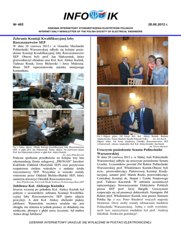 INFO IK Nr 465 28.06.2012 r. DZIENNIK INTERNETOWY STOWARZYSZENIA ELEKTRYKÓW POLSKICH INTERNET DAILY NEWSLETTER OF THE POLISH SOCIETY OF ELECTRICAL ENGINEERS • Zebranie Komisji Kwalifikacyjnej Izby Rzeczoznawców SEP W dniu 26 czerwca 2012 r. w Gmachu Mechaniki Politechniki Warszawskiej odbyło się kolejne posiedzenie Komisji Kwalifikacyjnej Izby Rzeczoznawców SEP. Obecni byli: prof. Jan Maksymiuk, który przewodniczył obradom oraz Kol. Kol. Aleksy Kuźnik, Tadeusz Rosak, Jerzy Bielawski i Jerzy Mukosiej. Biuro SEP reprezentowała autorka niniejszego komunikatu. Fot. 1. Górne zdjęcie: Obrady Komisji Kwalifikacyjnej Izby Rzeczoznawców SEP, w głębi prof. Jan Maksymiuk. Dolne zdjęcie: Na pierwszym planie Prof. Jan Maksymiuk (tyłem), w głębi Kol. Aleksy Kuźnik. fot. Anna Wójcikowska Podczas spotkania przedłużono na kolejne trzy lata rekomendację firmie usługowej „PRONAD” Jarosław Kukliński (Oddział Olsztyński SEP) oraz pozytywnie rozpatrzono siedem wniosków o nadanie tytułu rzeczoznawcy SEP. Wszystkie te wnioski zostały wniesione przez Oddział Bielsko-Bialski SEP, który zamierza utworzyć Ośrodek Rzeczoznawstwa. Anna Wójcikowska, kierownik Dzialu Naukowo-Technicznego Biura SEP Jubileusz Kol. Aleksego Kuźnika Jeszcze wczoraj po południu Kol. Aleksy Kuźnik był jednym z uczestników zebrania Komisji Kwalifikacyjnej Izby Rzeczoznawców SEP (patrz zdjęcie powyżej). A dziś Kol. Aleksy obchodzi piękny jubileusz. Wprawdzie rocznica urodzin nie jest okrągła, nie zmienia to jednak postaci, że składamy mu serdeczne, płynące z głębi serca życzenia. Ad multos Annos drogi Jubilacie! Fot. 2. Zdjęcie górne. Od lewej: Kol. Kol. Aleksy Kuźnik, Barbara Adamczewska, Teresa Machoń, Kaudia Pańczyk-Tytko. fot. Jan Kurek Zdjęcie dolne. Od lewej: dyrektorzy Ośrodka Rzeczoznawstwa SEP w Katowicach - obecny i poprzedni: Kol. Kol. Aleksy Kuźnik i Jan Kurek fot. Teresa Machoń. Uroczyste posiedzenie Senatu Politechniki Warszawskiej W dniu 26 czerwca 2012 r. w Małej Auli Politechniki Warszawskiej odbyło się uroczyste posiedzenie Senatu Uczelni. Uczestników powitał JM Rektor Politechniki Warszawskiej prof. Włodzimierz Kurnik.Obecni byli m.in.: przewodniczący Państwowej Komisji Kredytacyjnej, senator prof. Marek Rocki, przewodniczący Centralnej Komisji ds. Stopni i Tytułu Naukowego prof. Tadeusz Kaczorek. W zebraniu uczestniczył reprezentujący Stowarzyszenie Elektryków Polskich prezes SEP prof. Jerzy Barglik. Uroczystość rozpoczęła się od promocji doktorskich. Następnie JM Rektor prof. Włodzimierz Kurnik oraz prezes Siemens Polska Sp. z o.o. Peter Baudrexl wręczyli nagrody Siemensa. Dwie osoby zostały odznaczone medalem Politechniki Warszawskiej. Jedną z osób wyróżnionych tym zaszczytnym medalem był prof. Andrzej Jakubiak. Serdeczne gratulacje! DZIENNIK INTERNETOWY UKAZUJE SIĘ WYŁĄCZNIE W POSTACI ELEKTRONICZNEJ.