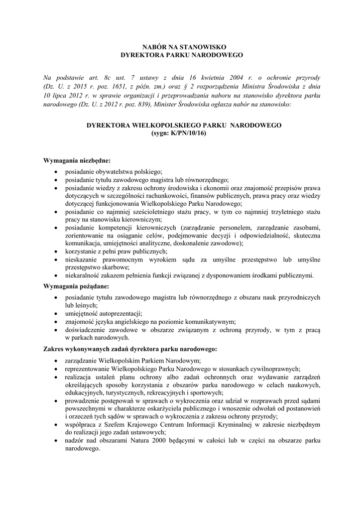 NABÓR NA STANOWISKO DYREKTORA PARKU NARODOWEGO Na podstawie art. 8c ust. 7 ustawy z dnia 16 kwietnia 2004 r. o ochronie przyrody (Dz. U. z 2015 r. poz. 1651, z późn. zm.) oraz § 2 rozporządzenia Ministra Środowiska z dnia 10 lipca 2012 r. w sprawie organizacji i przeprowadzania naboru na stanowisko dyrektora parku narodowego (Dz. U. z 2012 r. poz. 839), Minister Środowiska ogłasza nabór na stanowisko: DYREKTORA WIELKOPOLSKIEGO PARKU NARODOWEGO (sygn: K/PN/10/16) Wymagania niezbędne: posiadanie obywatelstwa polskiego; posiadanie tytułu zawodowego magistra lub równorzędnego; posiadanie wiedzy z zakresu ochrony środowiska i ekonomii oraz znajomość przepisów prawa dotyczących w szczególności rachunkowości, finansów publicznych, prawa pracy oraz wiedzy dotyczącej funkcjonowania Wielkopolskiego Parku Narodowego; posiadanie co najmniej sześcioletniego stażu pracy, w tym co najmniej trzyletniego stażu pracy na stanowisku kierowniczym; posiadanie kompetencji kierowniczych (zarządzanie personelem, zarządzanie zasobami, zorientowanie na osiąganie celów, podejmowanie decyzji i odpowiedzialność, skuteczna komunikacja, umiejętności analityczne, doskonalenie zawodowe); korzystanie z pełni praw publicznych; nieskazanie prawomocnym wyrokiem sądu za umyślne przestępstwo lub umyślne przestępstwo skarbowe; niekaralność zakazem pełnienia funkcji związanej z dysponowaniem środkami publicznymi. Wymagania pożądane: posiadanie tytułu zawodowego magistra lub równorzędnego z obszaru nauk przyrodniczych lub leśnych; umiejętność autoprezentacji; znajomość języka angielskiego na poziomie komunikatywnym; doświadczenie zawodowe w obszarze związanym z ochroną przyrody, w tym z pracą w parkach narodowych. Zakres wykonywanych zadań dyrektora parku narodowego: zarządzanie Wielkopolskim Parkiem Narodowym; reprezentowanie Wielkopolskiego Parku Narodowego w stosunkach cywilnoprawnych; realizacja ustaleń planu ochrony albo zadań ochronnych oraz wydawanie zarządzeń określających sposoby korzystania z obszarów parku narodowego w celach naukowych, edukacyjnych, turystycznych, rekreacyjnych i sportowych; prowadzenie postępowań w sprawach o wykroczenia oraz udział w rozprawach przed sądami powszechnymi w charakterze oskarżyciela publicznego i wnoszenie odwołań od postanowień i orzeczeń tych sądów w sprawach o wykroczenia z zakresu ochrony przyrody; współpraca z Szefem Krajowego Centrum Informacji Kryminalnej w zakresie niezbędnym do realizacji jego zadań ustawowych; nadzór nad obszarami Natura 2000 będącymi w całości lub w części na obszarze parku narodowego. Wymagane dokumenty i oświadczenia: list motywacyjny; poświadczona za zgodność z oryginałem kopia dowodu osobistego lub innego dokumentu ze zdjęciem potwierdzającego obywatelstwo i tożsamość; życiorys wraz z informacją o dotychczasowym przebiegu pracy zawodowej, w tym o zakresie obowiązków związanych z zajmowanymi stanowiskami i pełnionymi funkcjami, okresie ich pełnienia, liczbie podległych pracowników oraz osiągnięciach zawodowych; poświadczone za zgodność z oryginałem kopie dokumentów potwierdzających wykształcenie tj. posiadanie tytułu zawodowego magistra lub równorzędnego; poświadczone za zgodność z oryginałem kopie dokumentów potwierdzające przebieg pracy zawodowej, poświadczające spełnienie wymagań dotyczących stażu pracy tj. sześcioletniego stażu pracy, w tym co najmniej trzyletniego stażu pracy na stanowisku kierowniczym; oświadczenie o korzystaniu z pełni praw publicznych; oświadczenie o tym, iż kandydat nie był skazany prawomocnym wyrokiem sądu za umyślne przestępstwo lub umyślne przestępstwo skarbowe; oświadczenie o niekaralności zakazem pełnienia funkcji związanych z dysponowaniem środkami publicznymi; oświadczenie o wyrażeniu zgody na przetwarzanie danych osobowych dla potrzeb przeprowadzenia naboru. Dodatkowe dokumenty i oświadczenia: kopie dokumentów potwierdzających posiadanie tytułu zawodowego magistra lub równorzędnego z obszaru nauk przyrodniczych lub leśnych; kopie dokumentów poświadczających znajomość języka angielskiego; kopie dokumentów poświadczających doświadczenie zawodowe w obszarze związanym z ochroną przyrody, w tym z pracą w parkach narodowych; kandydat może złożyć referencje dotyczące jego dotychczasowej działalności zawodowej. Informacje o metodach i technikach naboru: weryfikacja formalna nadesłanych aplikacji; ocena merytoryczna doświadczenia oraz kwalifikacji zawodowych kandydatów, niezbędnych do wykonywania zadań dyrektora parku narodowego; test wiedzy; prezentacja dotycząca koncepcji zarządzania parkiem narodowym, obejmująca zagadnienia realizacji celów parku narodowego, zagadnienia administracyjno-prawne oraz uwarunkowania ekonomiczne i społeczne funkcjonowania parku; rozmowa kwalifikacyjna. Miejsce składania dokumentów: Ministerstwo Środowiska Departament Ochrony Przyrody ul. Wawelska 52/54; 00-922 Warszawa Termin i sposób składania dokumentów: Termin składania dokumentów upływa z dniem 2 listopada 2016 r. Dokumenty należy dostarczyć bezpośrednio lub drogą pocztową (o zachowaniu terminu decyduje data nadania dokumentów) na adres: Ministerstwo Środowiska, Departament Ochrony Przyrody, ul. Wawelska 52/54, 00-922 Warszawa, pokój nr 378a, w zamkniętej kopercie oznaczonej numerem referencyjnym K/PN/10/16. Inne informacje w aplikacji należy podać dane kontaktowe - adres do korespondencji, adres e-mail, numer telefonu; kandydaci spełniający wymagania formalne, którzy po weryfikacji aplikacji, zostaną dopuszczeni do kolejnego etapu naboru, będą powiadomieni listem poleconym za zwrotnym potwierdzeniem odbioru lub pocztą elektroniczną o terminie, miejscu przeprowadzenia drugiego etapu naboru; bliższe informacje na temat naboru można uzyskać pod numerem telefonu (0-22) 36 92 479; dokumenty nieodebrane w terminie 3 miesięcy od dni