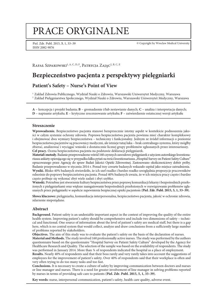 PRACE ORYGINALNE Piel. Zdr. Publ. 2015, 5, 1, 33–39 ISSN 2082-9876 © Copyright by Wroclaw Medical University Rafał Szpakowski1, A, C, D, F, Patrycja Zając2, B, C, E Bezpieczeństwo pacjenta z perspektywy pielęgniarki Patient’s Safety – Nurse’s Point of View 1 2 Zakład Zdrowia Publicznego, Wydział Nauki o Zdrowiu, Warszawski Uniwersytet Medyczny, Warszawa Zakład Pielęgniarstwa Społecznego, Wydział Nauki o Zdrowiu, Warszawski Uniwersytet Medyczny, Warszawa A – koncepcja i projekt badania; B – gromadzenie i/lub zestawianie danych; C – analiza i interpretacja danych; D – napisanie artykułu; E – krytyczne zrecenzowanie artykułu; F – zatwierdzenie ostatecznej wersji artykułu Streszczenie Wprowadzenie. Bezpieczeństwo pacjenta stanowi bezsprzecznie istotny aspekt w kontekście podnoszenia jakości w całym systemie ochrony zdrowia. Poprawa bezpieczeństwa pacjenta powinna mieć charakter kompleksowy i obejmować dwa wymiary bezpieczeństwa – techniczny i funkcjonalny. Jednym ze źródeł informacji o poziomie bezpieczeństwa pacjentów są pracownicy medyczni, ale istnieje tutaj luka – brak centralnego systemu, który mógłby zbierać, analizować i wyciągać wnioski z dostatecznie licznej grupy problemów zgłaszanych przez interesariuszy. Cel pracy. Ocena bezpieczeństwa pacjenta na podstawie deklaracji pielęgniarek. Materiał i metody. Badanie przeprowadzono wśród 160 czynnych zawodowo pielęgniarek z użyciem autorskiego kwestionariusza ankiety opierającego się w przypadku kilku pytań na treści kwestionariusza „Hospital Survey on Patient Safety Culture” opracowanego przez Agencję do spraw Badań Jakości Opieki Zdrowotnej. Zastosowano okolicznościowy dobór próby. Badanie przeprowadzono w styczniu 2014 r. Ponad trzy czwarte badanych wskazało szpital jako miejsce zatrudnienia. Wyniki. Blisko 40% badanych stwierdziło, że ich szef rzadko i bardzo rzadko uwzględnia propozycje pracowników odnośnie do poprawy bezpieczeństwa pacjenta. Ponad 40% badanych uważa, że w ich miejscu pracy często i bardzo często próbuje się wykonać zbyt wiele zadań i zbyt szybko. Wnioski. Potrzebne jest stworzenie kultury bezpieczeństwa przez poprawę komunikacji lekarzy i bezpośrednich przełożonych z pielęgniarkami oraz większe zaangażowanie bezpośrednich przełożonych w rozwiązywanie problemów zgłaszanych przez pielęgniarki w aspekcie zapewnienia bezpiecznej opieki pacjentom (Piel. Zdr. Publ. 2015, 5, 1, 33–39). Słowa kluczowe: pielęgniarka, komunikacja interpersonalna, bezpieczeństwo pacjenta, jakość w ochronie zdrowia, zdarzenie niepożądane. Abstract Background. Patient safety is an undeniable important aspect in the context of improving the quality of the entire health system. Improving patient’s safety should be comprehensive and include two dimensions of safety – technical and functional. One source of information about the level of patient’s safety are medical staff, but there is a gap here, which is no central system that would collect, analyze and draw conclusions from a sufficiently large number of problems reported by stakeholders. Objectives. The aim of this study was to evaluate the patient’s safety on the basis of the declaration of nurses. Material and Methods. The study involved 160 professionally active nurses. The study was performed by the authors questionnaire based on the questionnaire “Hospital Survey on Patient Safety Culture” developed by the Agency for Healthcare Research and Quality. The selection of the sample was based on the availability of respondents. The study was performed in January 2014. More than ¾ of respondents indicated the hospital as a place of employment. Results. Nearly 40% of respondents said that their boss rarely and very rarely takes into account the suggestions of employees for the improvement of patient’s safety. Over 40% of respondents said that their workplace is often and very often trying to do too many tasks and too fast. Conclusions. It is necessary to create a culture of safety by improving communication between doctors and nurses or line manager and nurses. There is a need for greater involvement of line manager in solving problems reported by nurses in terms of providing safe care to patients (Piel. Zdr. Publ. 2015, 5, 1, 33–39). Key words: nurse, interpersonal communication, patient’s safety, health care quality, adverse event. 34 Bezpieczeństwo pacjenta stanowi bezsprzecznie istotny aspekt w kontekście podnoszenia jakości w całym systemie ochrony zdrowia, szczególnie w obszarze szpitalnictwa, gdzie skutki niepożądanych zdarzeń z dużym prawdopodobieństwem są większym zagrożeniem dla zdrowia i życia pacjenta niż w opiece ambulatoryjnej [1]. Poprawa bezpieczeństwa pacjenta musi mieć charakter kompleksowy. W tym celu powinna obejmować dwa wymiary bezpieczeństwa – techniczny i funkcjonalny. Wymiar techniczny rozumiany jako profesjonalizm działania dotyczy takich składowych bezpieczeństwa, jak np.: kwalifikacje formalne, umiejętności praktyczne, doświadczenie pracowników medycznych, liczba personelu medycznego dostosowana do stanu zdrowia i liczby pacjentów, warunki sanitarno-higieniczne pomieszczeń, w których przebywają pacjenci, warunki przechowywania leków, stan techniczny aparatury i sprzętu medycznego. Zapewnienie bezpieczeństwa w tym wymiarze nie gwarantuje jednak, że pacjent nie dozna szkody. Równie ważne jest zapewnienie bezpieczeństwa w wymiarze funkcjonalnym, który jest rozumiany jako profesjonalizm relacji. Wymiar ten dotyczy szeroko rozumianej komunikacji z pacjentem i może obejmować takie składowe, jak: zrozumiałe przekazywanie informacji, okazywanie empatii i zrozumienia, poświęcenie pacjentowi czasu i uwagi lub też pytanie o jego potrzeby. Uwzględnienie tych dwóch wymiarów w zarządzaniu ryzykiem zdarzeń niepożądanych daje podstawy do osiągania znaczącej poprawy w tym szczególnym przypadku 
