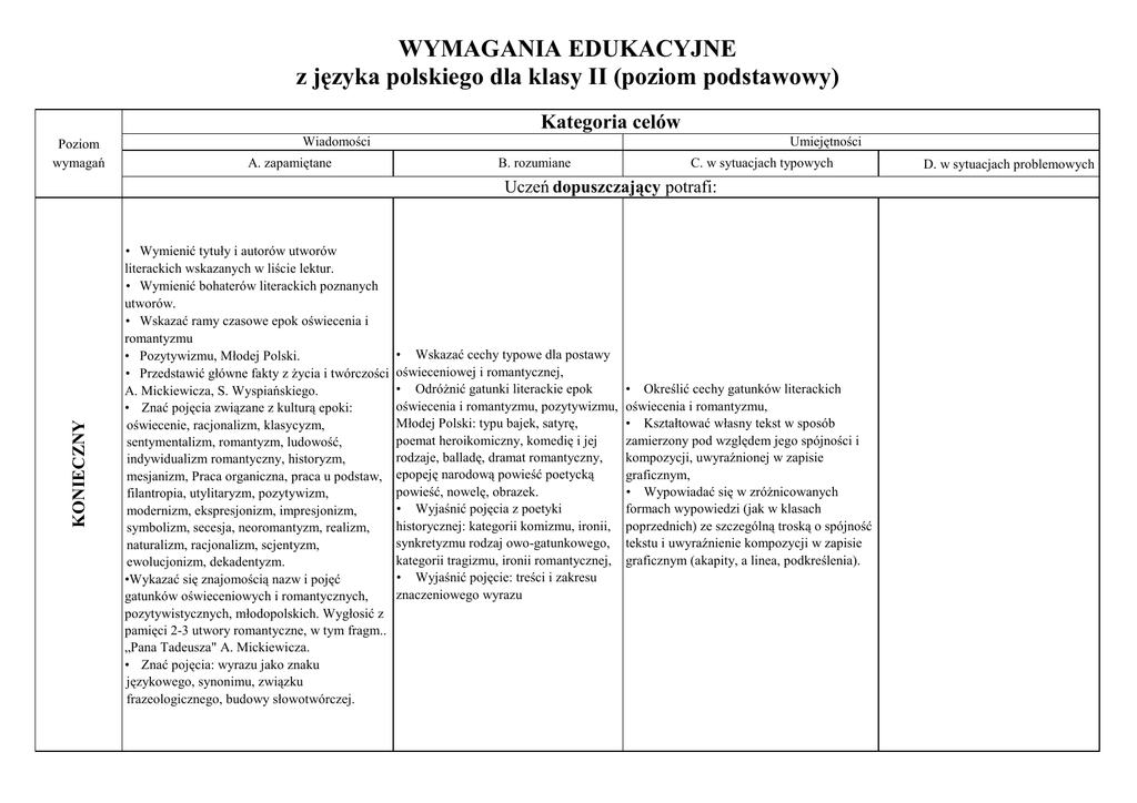 WYMAGANIA EDUKACYJNE z języka polskiego dla klasy II (poziom