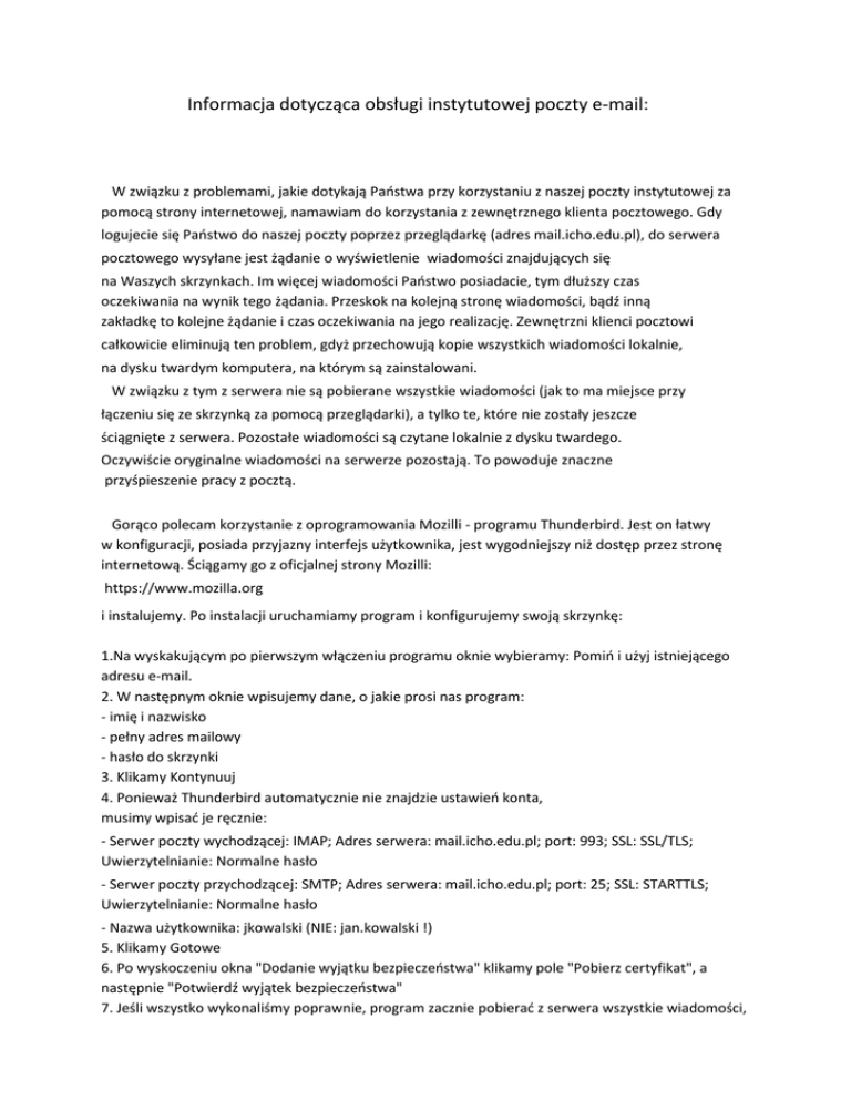 Informacja dotycząca obsługi instytutowej poczty e-mail: W związku z problemami, jakie dotykają Państwa przy korzystaniu z naszej poczty instytutowej za pomocą strony internetowej, namawiam do korzystania z zewnętrznego klienta pocztowego. Gdy logujecie się Państwo do naszej poczty poprzez przeglądarkę (adres mail.icho.edu.pl), do serwera pocztowego wysyłane jest żądanie o wyświetlenie wiadomości znajdujących się na Waszych skrzynkach. Im więcej wiadomości Państwo posiadacie, tym dłuższy czas oczekiwania na wynik tego żądania. Przeskok na kolejną stronę wiadomości, bądź inną zakładkę to kolejne żądanie i czas oczekiwania na jego realizację. Zewnętrzni klienci pocztowi całkowicie eliminują ten problem, gdyż przechowują kopie wszystkich wiadomości lokalnie, na dysku twardym komputera, na którym są zainstalowani. W związku z tym z serwera nie są pobierane wszystkie wiadomości (jak to ma miejsce przy łączeniu się ze skrzynką za pomocą przeglądarki), a tylko te, które nie zostały jeszcze ściągnięte z serwera. Pozostałe wiadomości są czytane lokalnie z dysku twardego. Oczywiście oryginalne wiadomości na serwerze pozostają. To powoduje znaczne przyśpieszenie pracy z pocztą. Gorąco polecam korzystanie z oprogramowania Mozilli - programu Thunderbird. Jest on łatwy w konfiguracji, posiada przyjazny interfejs użytkownika, jest wygodniejszy niż dostęp przez stronę internetową. Ściągamy go z oficjalnej strony Mozilli: https://www.mozilla.org i instalujemy. Po instalacji uruchamiamy program i konfigurujemy swoją skrzynkę: 1.Na wyskakującym po pierwszym włączeniu programu oknie wybieramy: Pomiń i użyj istniejącego adresu e-mail. 2. W następnym oknie wpisujemy dane, o jakie prosi nas program: - imię i nazwisko - pełny adres mailowy - hasło do skrzynki 3. Klikamy Kontynuuj 4. Ponieważ Thunderbird automatycznie nie znajdzie ustawień konta, musimy wpisać je ręcznie: - Serwer poczty wychodzącej: IMAP; Adres serwera: mail.icho.edu.pl; port: 993; SSL: SSL/TLS; Uwierzytelnianie: Normalne hasło - Serwer poczty przychodzącej: SMTP; Adres serwera: mail.icho.edu.pl; port: 25; SSL: STARTTLS; Uwierzytelnianie: Normalne hasło - Nazwa użytkownika: jkowalski (NIE: jan.kowalski !) 5. Klikamy Gotowe 6. Po wyskoczeniu okna "Dodanie wyjątku bezpieczeństwa" klikamy pole "Pobierz certyfikat", a następnie "Potwierdź wyjątek bezpieczeństwa" 7. Jeśli wszystko wykonaliśmy poprawnie, program zacznie pobierać z serwera wszystkie wiadomości, zachowując strukturę i zawartość katalogów, jaką mieliśmy utworzoną na swoim koncie. Jest to długotrwała operacja, ale, co najważniejsze, jest jednorazowa. 8. W międzyczasie testujemy wysyłanie i odbieranie maili poprzez wysłanie do siebie zwrotnego maila. Tworzymy nową wiadomość i w polu adresata podajemy swój adres mailowy. Za pierwszym razem wiadomość się nie wyśle i wyskoczy ponownie okienko, jak w pkt. 6. Klikamy pole "Pobierz certyfikat", a następnie "Potwierdź wyjątek bezpieczeństwa". Zamykamy okienko z błędem informującym, że wiadomość się nie wysłała i wysyłamy wiadomość jeszcze raz. 9. Na górnym pasku znajdujemy zakładkę "Narzędzia" i wybieramy ją, a następnie "Konfiguracja kont". W zakładce "Niechciana poczta" zaznaczamy pole "Ufaj nagłówkom niechcianej poczty dołączonym przez:" i z menu obok wybieramy: SpamAssassin Przenoszenie kontaktów z Roundcube do Thunderbirda: 1. Logujemy się do swojej skrzynki poprzez stronę internetową mail.icho.edu.pl 2. Wybieramy książkę adresową (prawy górny róg) 3. Będąc w książce adresowej wybieramy "Eksport kontaktów w formacie vcard" 4. Wskazujemy miejsce na dysku, gdzie chcemy zapisać kontakty 5. Włączamy klienta pocztowego Thunderbird 6. Wybieramy z zakładki Narzędzia pole Książka adresowa (skrót Ctrl+Shift+B) 7. W nowym oknie ponownie z zakładki Narzędzia wybieramy Importuj 8. Na stronie kreatora importu wybieramy importowanie Książek adresowych 9. W kolejnym oknie wybieramy Plik vCard (.vcf) 10. Wskazujemy plik zapisany w punkcie 4. Niestety Roundcube nie pozwala na wyeksportowanie list dystrybucyjnych, więc listy te należy samodzielnie stworzyć w Thunderbirdzie.