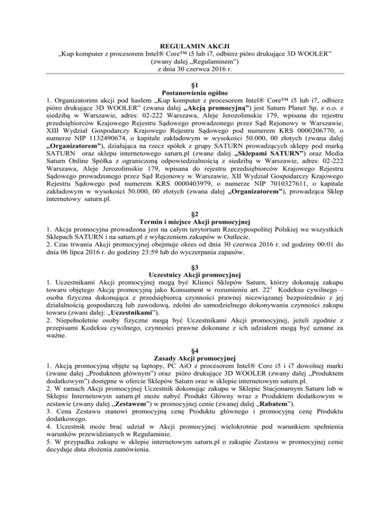 REGULAMIN AKCJI „Kup komputer z procesorem Intel® Core™ i5 lub i7, odbierz pióro drukujące 3D WOOLER” (zwany dalej „Regulaminem”) z dnia 30 czerwca 2016 r. §1 Postanowienia ogólne 1. Organizatorem akcji pod hasłem „Kup komputer z procesorem Intel® Core™ i5 lub i7, odbierz pióro drukujące 3D WOOLER” (zwana dalej „Akcją promocyjną”) jest Saturn Planet Sp. z o.o. z siedzibą w Warszawie, adres: 02-222 Warszawa, Aleje Jerozolimskie 179, wpisana do rejestru przedsiębiorców Krajowego Rejestru Sądowego prowadzonego przez Sąd Rejonowy w Warszawie, XIII Wydział Gospodarczy Krajowego Rejestru Sądowego pod numerem KRS 0000206770, o numerze NIP 1132490674, o kapitale zakładowym w wysokości 50.000, 00 złotych (zwana dalej „Organizatorem”), działająca na rzecz spółek z grupy SATURN prowadzących sklepy pod marką SATURN oraz sklepu internetowego saturn.pl (zwane dalej „Sklepami SATURN”) oraz Media Saturn Online Spółka z ograniczoną odpowiedzialnością z siedzibą w Warszawie, adres: 02-222 Warszawa, Aleje Jerozolimskie 179, wpisana do rejestru przedsiębiorców Krajowego Rejestru Sądowego prowadzonego przez Sąd Rejonowy w Warszawie, XII Wydział Gospodarczy Krajowego Rejestru Sądowego pod numerem KRS 0000403979, o numerze NIP 7010327611, o kapitale zakładowym w wysokości 50.000, 00 złotych (zwana dalej „Organizatorem”), prowadząca Sklep internetowy saturn.pl. §2 Termin i miejsce Akcji promocyjnej 1. Akcja promocyjna prowadzona jest na całym terytorium Rzeczypospolitej Polskiej we wszystkich Sklepach SATURN i na saturn.pl z wyłączeniem zakupów w Outlecie. 2. Czas trwania Akcji promocyjnej obejmuje okres od dnia 30 czerwca 2016 r. od godziny 00:01 do dnia 06 lipca 2016 r. do godziny 23:59 lub do wyczerpania zapasów. §3 Uczestnicy Akcji promocyjnej 1. Uczestnikami Akcji promocyjnej mogą być Klienci Sklepów Saturn, którzy dokonają zakupu towaru objętego Akcją promocyjną jako Konsument w rozumieniu art. 221 Kodeksu cywilnego – osoba fizyczna dokonująca z przedsiębiorcą czynności prawnej niezwiązanej bezpośrednio z jej działalnością gospodarczą lub zawodową, zdolni do samodzielnego dokonywania czynności zakupu towaru (zwani dalej: „Uczestnikami”). 2. Niepełnoletnie osoby fizyczne mogą być Uczestnikami Akcji promocyjnej, jeżeli zgodnie z przepisami Kodeksu cywilnego, czynności prawne dokonane z ich udziałem mogą być uznane za ważne. §4 Zasady Akcji promocyjnej 1. Akcją promocyjną objęte są laptopy, PC AiO z procesorem Intel® Core i5 i i7 dowolnej marki (zwane dalej „Produktem głównym”) oraz pióro drukujące 3D WOOLER (zwany dalej „Produktem dodatkowym”) dostępne w ofercie Sklepów Saturn oraz w sklepie internetowym saturn.pl. 2. W ramach Akcji promocyjnej Uczestnik dokonując zakupu w Sklepie Stacjonarnym Saturn lub w Sklepie Internetowym saturn.pl może nabyć Produkt Główny wraz z Produktem dodatkowym w zestawie (zwany dalej „Zestawem”) w promocyjnej cenie (zwanej dalej „Rabatem”). 3. Cena Zestawu stanowi promocyjną cenę Produktu głównego i promocyjną cenę Produktu dodatkowego. 4. Uczestnik może brać udział w Akcji promocyjnej wielokrotnie pod warunkiem spełnienia warunków przewidzianych w Regulaminie. 5. W przypadku zakupu w sklepie internetowym saturn.pl o zakupie Zestawu w promocyjnej cenie decyduje data złożenia zamówienia. 6. Uczestnikom nie przysługuje prawo do zastrzeżenia szczególnych cech Zestawów objętych Akcją promocyjną. 7. Rabat odliczany jest od ceny brutto towaru i będzie naliczany jednorazowo. Rabaty nie mogą być dzielone. 8. Uczestnikom Akcji promocyjnej nie przysługuje prawo do otrzymania ekwiwalentu pieniężnego w wysokości Rabatu. 9. Akcja promocyjna nie może być łączona z innymi Akcjami promocyjnymi, w tym kodami rabatowymi otrzymanymi w ramach programu Konto Plus. §5 Odpowiedzialność 1. Odpowiedzialność Organizatora wobec Uczestnika z tytułu roszczeń związanych z uprawnieniami przyznanymi Uczestnikowi w Regulaminie ograniczona jest do wysokości ceny Zestawu w trakcie Akcji promocyjnej, którego to roszczenie dotyczy. 2. Powyższe ograniczenie nie wyłącza uprawnień przyznanych Uczestnikom na mocy odrębnych przepisów prawnych. §6 Reklamacje i wymiana towarów 1. Reklamacje Uczestników dotyczące sposobu przeprowadzenia Akcji promocyjnej powinny być zgłaszane w trakcie trwania Akcji promocyjnej oraz przez 21 (dwadzieścia jeden) dni od jej zakończenia w Sklepie Saturn, w którym Uczestnik dokonał zakupu Zestawu, lub pod adresem email: [email protected] z tematem wiadomości "Reklamacja – Kup komputer z procesorem Intel® Core™ i5 lub i7, odbierz pióro drukujące 3D WOOLER” lub pod numerem Infolinii : 799 37 37 37 * (* opłata zgodnie z taryfą operatora). 2. Reklamacje składane w formie pisemnej w Sklepie SATURN, w którym dokonano zakupu Zestawu powinny zawierać dopisek „Kup komputer z procesorem Intel® Core™ i5 lub i7, odbierz pióro drukujące 3D WOOLER” oraz powinny zawierać imię i nazwisko Uczestnika, Jego adres zamieszkania, kopię dowodu zakupu oraz dokładny opis stanu faktycznego będącego przyczyną złożenia reklamacji. 3. Postępowanie reklamacyjne, o którym mowa w §6 ust. 1 i 2 Regulaminu, trwa 14 (czternaście) dni od daty wpłynięcia reklamacji. Uczestnik zostanie powiadomiony o rozpatrzeniu reklamacji przez Organizatora listem poleconym wysłanym na adres wskazany przez Uczestnika, telefonicznie lub za pośrednictwem drogi elektronicznej w zależności od formy, w jakiej Uczestnik złożył reklamację. Po wyczerpaniu postępowania reklamacyjnego Uczestnik jest uprawniony do dochodzenia swoich roszczeń na drodze postępowania sądowego. 4. Organizator nie ponosi odpowiedzialności za zmianę miejsca zamieszkania lub zmianę podanego przez Uczestnika adresu do korespondencji, jak również za zmiany innych danych uniemożliwiające prawidłowe zawiadomienie Uczestn
