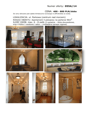Numer oferty: 055A/14 CENA: 400 - 800 PLN/doba Do ceny doliczana jest opłata klimatyczna wynosząca 4,30PLN/doba za osobę LOKALIZACJA: ul. Parkowa (centrum nad morzem) RODZAJ OBIEKTU: Apartament 4 pokojowy na parterze 96m 2 ILOŚĆ OSÓB: max. 6 - 8 osób (3 sypialnie – łóżko dwuosobowe, oraz 4 łóżka 1 osobowe i salon – rozkładana kanapa rogowa) Numer oferty: 055A/14 LOKALIZACJA: ul. Parkowa (Centrum nad morzem) Lp. PRZEDMIOT OCENY UWAGI 1. Nowe/stare budownictwo Przedwojenna kamienica wyremontowana 2. Nowe/stare meble Nowe meble 3. Parking na posesji/GaraŜ Na posesji parking dla 2 samochodów 4. Balkon / taras / ogródek 3 balkony 5. Telewizor (Kablówka, TV Sat), Radio TV Kablowa 6. Dostęp do telefonu Nie 7. Dostęp do internetu tak Kuchnia Kuchnia w pełni wyposażona w: lodówkę, kuchenkę gazową, czajnik bezprzewodowy, zmywarkę do naczyń, pralkę sztućce, zastawę i garnki. Łazienka Łazienka z kabina prysznicową oraz WC 10. Pościel, ręczniki Tak 11. Dostęp do szafy / półek Tak 12. Pobyt ze zwierzątkiem Do uzgodnienia 14. Niepełnosprawni (winda, podjazd) Obiekt nie przystosowany 15. Plac zabaw dla dzieci W pobliżu plac zabaw dla dzieci 16. 17. Lokalizacja Centrum – Dworzec PKP Plaża, park Dzielnica Komunikacja miejska Osoby palące 18. Piwnica/schowek Tak 19. Faktura VAT lub Rachunek Faktura VAT 20. Inne 8. 9. Spokojna okolica w centrum w parku południowym. Ok. 100 metrów do plaży i ok. 200 metrów do molo Nie