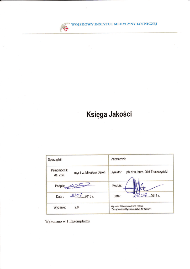 1. POSTANOWIENIA OGÓLNE Definicje, pojęcia i skróty Obowiązują wszystkie definicje, pojęcia i skróty wymienione w normie PN – EN ISO 9001 „Terminologia”, publikacji AQAP 2120 „Terminologia", oraz: - Firma – Wojskowy Instytut Medycyny Lotniczej (WIML) – komórki organizacyjne: Ośrodek Badań Orzecznictwa Lotniczo-Lekarskiego i Medycyny Pracy (OBOLLiMP), Zakład Techniczny Badań Lotniczo-Lekarskich i Symulatorów Lotniczych (ZTBLLiSL), Centralna Sterylizatornia (CS), Poradnia Diagnostyki Laboratoryjnej (Laboratorium Kliniczne) oraz Zakład Szkolenia i Treningu Lotniczo-Lekarskiego (ZSiTLL), - System – System Zarządzania Jakością, oparty o wymagania PN-EN ISO 9001:09 i AQAP 2120:09, wdrożony, utrzymywany i doskonalony w Firmie, - Księga – niniejsza Księga Systemu Zarządzania Jakością. 1.2 Prezentacja Księgi Jakości Niniejsza Księga Jakości jest własnością Wojskowego Instytutu Medycyny Lotniczej z siedzibą w Warszawie przy ul. Krasińskiego 54/56, Księga została opracowana przez Pełnomocnika ds. Zintegrowanego Systemu Zarządzania i zawiera istotne elementy naszego Systemu zgodnego z wymaganiami Polskiej Normy PN- EN ISO 9001:2009 i publikacji standaryzacyjnej NATO AQAP 2120:2009. Księga jest dokumentem określającym ogólne działania podjęte przez kierownictwo i pracowników WIML, w tym OBOLLiMP, ZTBLLiSL, CS, Laboratorium Kliniczne, ZSiTLL, w celu uzyskania odpowiedniej jakości usług oferowanych klientom. Opisuje cele, wymagania i politykę WIML, w tym OBOLLiMP, ZTBLLiSL, CS, Laboratorium Kliniczne, ZSiTLL,. Stanowi materiał źródłowy dla dokumentów z nią związanych, takich jak procedury, instrukcje i inne wymagane przez normę dla objętych Systemem OBOLLiMP, ZTBLLiSL, CS, Laboratorium Kliniczne, ZSiTLL. Przedstawiony w Księdze materiał przeznaczony jest dla pracowników, dla przedstawicieli jednostki certyfikującej oraz dla klientów WIML, w szczególności dla klientów OBOLLiMP, ZTBLLiSL, CS, Laboratorium Klinicznego, ZSiTLL. 1.3 Zasady udostępniania Księgi Jakości Księga wydana jest w formie egzemplarza nadzorowanego i egzemplarzy nienadzorowanych. Egzemplarz nadzorowany jest oznaczony jako „Egzemplarz nadzorowany”. Dodatkowo sporządzona jest kopia Księgi Jakości w formie elektronicznej, znajdująca się na serwerze WIML. Kopie Księgi Jakości, jako egzemplarz nienadzorowane, mogą otrzymać klienci WIML, w szczególności klienci OBOLLiMP, ZTBLLiSL, CS, Laboratorium Klinicznego oraz ZSiTLL. 2 1.4 Wprowadzanie zmian do Księgi Jakości Za aktualizację Księgi Jakości odpowiada Pełnomocnik ds. Zintegrowanego Systemu Zarządzania. Wszystkie zmiany wynikające z aktualizacji Księgi, dokonywane są przez Pełnomocnika ds. Zintegrowanego Systemu Zarządzania, po wcześniejszej akceptacji przez Dyrektora. Wnioski dotyczące wprowadzania zmian w Księdze mogą być zgłaszane przez wszystkich zainteresowanych. Wniosek o wprowadzenie zmiany należy składać do Pełnomocnika ds. Zintegrowanego Systemu Zarządzania w formie pisemnej, z podaniem jego uzasadnienia. Zmiany zatwierdzane są przez Dyrektora i odnotowywane w wykazie zmian (Załącznik nr 1). Ze względu na przyjęty w Księdze kompleksowy system numeracji stron, wszystkie zmiany wprowadzane są jako kolejne wydanie całej Księgi. Nieaktualne wydania są oznaczane napisem „Wersja archiwalna” i przechowywane przez okres, co najmniej 3 lat. Niezależnie od dokonywanych w miarę potrzeb zmian bieżących, pełnomocnik ds. Zintegrowanego Systemu Zarządzania jest zobowiązany do przeprowadzania raz w roku przeglądu i weryfikacji Księgi Jakości. 3 2. PREZENTACJA FIRMY 2.1 Wprowadzenie Wojskowy Instytut Medycyny Lotniczej w Warszawie jest placówką, której głównym zadaniem jest szeroko pojęta opieka medyczna obejmująca między innymi problematykę oceny stanu zdrowia pilotów samolotów i personelu lotniczego, szeroko pojętą profilaktykę oraz szkolenie w zakresie medycyny lotniczej. Przedmiot działania WIML obejmuje między innymi: - badania lotniczo-lekarskie i psychologiczne personelu lotniczego, - orzecznictwo lotniczo-lekarskie, - orzecznictwo w zakresie medycyny pracy, - szkolenie w zakresie medycyny lotniczej oraz treningu lotniczego, prowadzonych na bazie naziemnych symulatorów lotniczych, - uczestniczenie w systemie ochrony zdrowia, - prowadzenie w sposób ciągły badań naukowych i prac rozwojowych. Kompletna oferta usług objętych Systemem: Oferujemy: 1. Wykonywanie badań diagnostycznych : - wojskowego i cywilnego personelu lotniczego, - pracowników ochrony fizycznej, - kierowców i kandydatów na kierowców, - ubiegających się lub posiadających pozwolenie na broń - ubiegających się o licencję detektywa, - osób kierujących działalnością gospodarczą albo bezpośrednio zatrudnionych przy wytwarzaniu i obrocie materiałami wybuchowymi, bronią, amunicją oraz wyrobami o przeznaczeniu wojskowym lub policyjnym, - kandydatów do objęcia urzędu sędziego, - osób ubiegających się lub posiadających pozwolenie na nabywanie oraz przechowywanie materiałów wybuchowych przeznaczonych do użytku cywilnego (pirotechnicy). 2. Orzecznictwo medyczne w zakresie lotnictwa cywilnego. 3. Orzecznictwo w zakresie medycyny pracy w zakresie podstawowym i odwoławcze. 4. Szkolenie w zakresie medycyny lotniczej. 5. Symulatorowy trening lotniczy w warunkach stacjonarnych i dynamicznych. 6. Badania medyczne w zakresie diagnostyki laboratoryjnej. 7. Sterylizację narzędzi i materiałów. Zapewniamy: - Dostęp do laboratoriów badawczych oraz pracowni diagnostycznych wyposażonych w specjalistyczną aparaturę badawczą oraz unikatowe, w skali Polski i Europy, symulatory lotnicze i stanowiska diagnostyczno-treningowe. Bezpieczeństwo i niezawodność WIML świadcząc usługi na rzecz Sił Zbrojnych RP i lotnictwa państwowego wypracował metody pracy gwarantujące wysoki stopień bezpieczeństwa. Nadążając za zmianami wymagań dotychczasowy