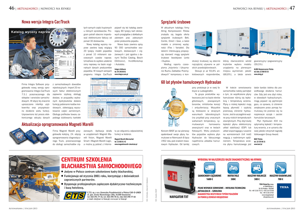 46 | AKTUALNOŚCI | NOWOŚCI NA RYNKU NOWOŚCI NA RYNKU | AKTUALNOŚCI | Nowa wersja Integra Car/Truck Sprężarki śrubowe tych samych części kupionych u różnych sprzedawców. Pro gram potrafi obecnie importo wać elektroniczne faktury od ponad 30 dostawców. Nowy katalog wyceny na praw zawiera bazę wiążącą 20 tysięcy modeli pojazdów z ponad 10 milionami sza cowanych czasów napraw. Umożliwia to szybkie ustalenie ceny naprawy na bazie orygi nalnych danych producentów pojazdów. W nowych wersjach programu Integra Car/Truck Firma Integra Software przy gotowała nową wersję opro gramowania Integra Car/Truck 7.5.1 przeznaczonego dla sklepów i serwisów samocho dowych. W edycji tej znacznie uproszczono interfejs użyt kownika oraz przyspieszo no działanie wielu funkcji. Usprawniono też proces elek tronicznego odczytu danych W aktualnym katalogu firmy Almig Kompressoren Polska znalazła się bogata oferta sprężarek śrubowych Belt, Combi, Direct i Gear, a także modele o zmiennej wydaj ności (Flex i Variable). Dla lakierni interesującą propozy cję stanowić mogą sprężarki śrubowe bezolejowe Lento i Duplexx. Według raportu czaso pisma „Inżynieria i Utrzyma nie Ruchu Zakładów Przemy słowych” kompresory o kon pojawił się też katalog zawie rający 80 tysięcy kart okreso wych przeglądów z dokładnym zakresem prac zalecanych przez producenta pojazdu. Nowa baza zawiera opisy 90 000 samochodów oso bowych, dostawczych i cię żarowych i jest zgodna z da nymi TecDoc Catalog, Bosch ESI[tronic], VividWorkshop i Autodata. Integra Software tel. 94 348 80 01 www.integra.com.pl strukcji śrubowej są obecnie najczęściej używane w pol skich przedsiębiorstwach. Stosuje je aż 93,8% an kietowanych respondentów, którzy równocześnie wśród kryteriów wyboru modelu urządzenia na pierwszym miejscu wymieniali: jakość (68,8%), a także serwis gwarancyjny i pogwarancyjny (59,5%). ALMiG Kompressoren Polska tel./faks 22 868 03 53 www.almig.pl 60 lat płynów hamulcowych Hydraulan z samochodowych dowodów rejestracyjnych. Import 20 no wych faktur elektronicznych zapewnia szybszą obsługę dostaw; w przypadku wybra nych dystrybutorów dodano funkcję pobieranie kodów kre skowych, ułatwiającą wyszu kiwanie części zamiennych. Obsługa prefiksów towaru za pobiega dublowaniu kartotek Aktualizacja oprogramowania Magneti Marelli Firma Magneti Marelli przy gotowała kolejną, 24. edycję oprogramowania diagnostycz nego Truck, przeznaczonego do obsługi samochodów cię 47 żarowych. Aplikacja działa w urządzeniach Magneti Ma relli Vision, Magneti Marelli Smart i Magneti Marelli Logic, a można ją pobrać z Interne tu po włączeniu odpowiedniej funkcji w testerze. Koncern BASF po raz pierwszy opatentował swoje płyny ha mulcowe w Niemczech 8 lipca 1952 roku pod znakiem towa rowym Hydraulan. Od tamtej Magneti Marelli Aftermarket tel. 32 603 61 42 www.magnetimarelli-checkstar.pl pory produkuje je w swej fa bryce w Ludwigshafen. Ta grupa produktów wy twarzana jest na bazie eterów glikolowych, powiązanych boranów, inhibitorów korozji i antyutleniaczy. Wszystkie są testowane w skrajnych warunkach laboratoryjnych (na przykład przy znacznych wahaniach temperatury, sy mulowanym hamowaniu awaryjnym) oraz w testach flotowych). Wielu producen tów pojazdów wybiera płyn Hydraulan do fabrycznego napełnienia układów hamul cowych. W trakcie serwisowania samochodów należy pamiętać o tym, że współczesne płyny hamulcowe różnią się lepko ścią i temperaturą wrzenia. Płyny o niskiej lepkości mają lepszą płynność i szybciej przenoszą ciśnienie hydrau liczne. Jest to szczególnie waż ne przy niskich temperaturach zewnętrznych. Przy zbyt dużej lepkości płynu elektroniczny układ stabilizacji (ESP) lub układ wspomagający ruszanie na wzniesieniach (hill hold) reagują z nadmiernym opóź nieniem. Temperatura wrze nia płynu hamulcowego jest także bardzo istotna dla pra widłowego działania hamul ców. Gdy jest ona zbyt niska, w obwodach hydraulicznych, mogą pojawić się pęcherzyki gazu, co sprawia, iż ciśnienie zwiększane przez pompę ha mulcową nie przenosi się na rozpieracze szczęk i zaciski hamulców tarczowych. Płyn Hydraulan 404 ma optymalną lepkość i tempera turę wrzenia, a w uznaniu dla swej jakości otrzymał nagrodę Volkswagen Group Award. BASF Polska tel. 22 570 98 31 www.basf.pl Autonaprawa | Styczeń 2013 SAMOCHODY CIĘŻAROWE 1600 € Fot. Almig, BASF Fot. Integra, Magneti Marelli WYBIERAJ W NAJSZERSZEJ BAZIE DIAGNOSTYCZNEJ NA RYNKU NAVIGATOR TXT MOTOCYKLE 500€ PEŁNE WSPARCIE SERWISOWE – INFOLINIA TECHNICZNA AKTUALIZACJE – SZKOLENIA DIAGNOSTYKA WSZYSTKICH TYPÓW POJAZDÓW ZA POMOCĄ JEDNEGO URZĄDZENIA! MASZYNY ROLNICZE 500 € MASZYNY BUDOWLANE 700 € TEXA Poland Sp. z o.o. ul. Babińskiego 4, 30-393 Kraków - POLAND Tel. +48 12 263-10-12; +48 12 617 05 00 Fax. +48 12 263-29-85 www.texapoland.pl [email protected] Autonaprawa | Styczeń 2013