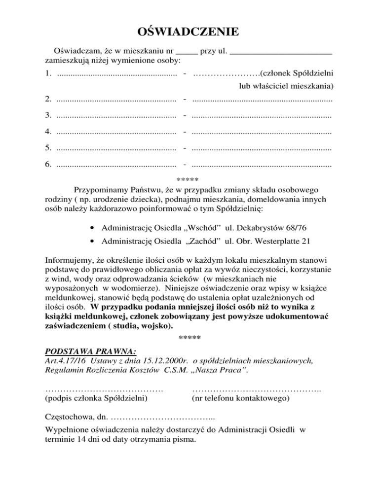 OŚWIADCZENIE Oświadczam, że w mieszkaniu nr _____ przy ul. _______________________ zamieszkują niżej wymienione osoby: 1. ...................................................... - .………………….(członek Spółdzielni lub właściciel mieszkania) 2. ...................................................... - ............................................................... 3. ...................................................... - ............................................................... 4. ...................................................... - ............................................................... 5. ...................................................... - ............................................................... 6. ...................................................... - ............................................................... ***** Przypominamy Państwu, że w przypadku zmiany składu osobowego rodziny ( np. urodzenie dziecka), podnajmu mieszkania, domeldowania innych osób należy każdorazowo poinformować o tym Spółdzielnię: • Administrację Osiedla „Wschód” ul. Dekabrystów 68/76 • Administrację Osiedla „Zachód” ul. Obr. Westerplatte 21 Informujemy, że określenie ilości osób w każdym lokalu mieszkalnym stanowi podstawę do prawidłowego obliczania opłat za wywóz nieczystości, korzystanie z wind, wody oraz odprowadzania ścieków (w mieszkaniach nie wyposażonych w wodomierze). Niniejsze oświadczenie oraz wpisy w książce meldunkowej, stanowić będą podstawę do ustalenia opłat uzależnionych od ilości osób. W przypadku podania mniejszej ilości osób niż to wynika z książki meldunkowej, członek zobowiązany jest powyższe udokumentować zaświadczeniem ( studia, wojsko). ***** PODSTAWA PRAWNA: Art.4.17/16 Ustawy z dnia 15.12.2000r. o spółdzielniach mieszkaniowych, Regulamin Rozliczenia Kosztów C.S.M. „Nasza Praca”. …………………………………. (podpis członka Spółdzielni) …………………………………….. (nr telefonu kontaktowego) Częstochowa, dn. ……………………………... Wypełnione oświadczenia należy dostarczyć do Administracji Osiedli w terminie 14 dni od daty otrzymania pisma.