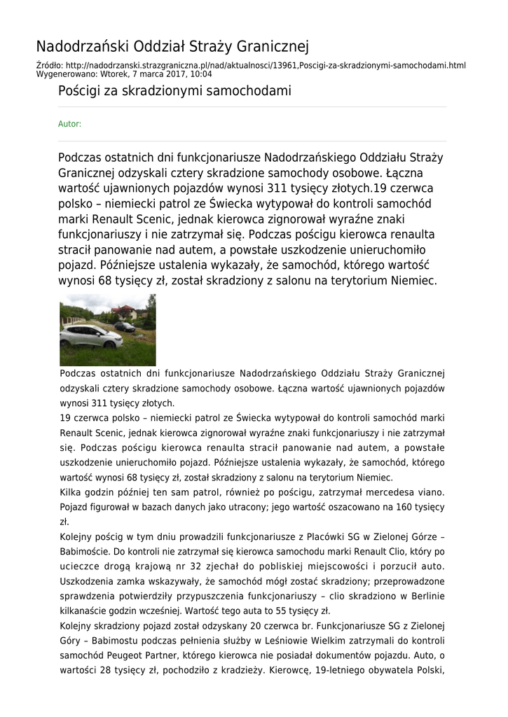 Nadodrzański Oddział Straży Granicznej Źródło: http://nadodrzanski.strazgraniczna.pl/nad/aktualnosci/13961,Poscigi-za-skradzionymi-samochodami.html Wygenerowano: Wtorek, 7 marca 2017, 10:04 Pościgi za skradzionymi samochodami Autor: Podczas ostatnich dni funkcjonariusze Nadodrzańskiego Oddziału Straży Granicznej odzyskali cztery skradzione samochody osobowe. Łączna wartość ujawnionych pojazdów wynosi 311 tysięcy złotych.19 czerwca polsko – niemiecki patrol ze Świecka wytypował do kontroli samochód marki Renault Scenic, jednak kierowca zignorował wyraźne znaki funkcjonariuszy i nie zatrzymał się. Podczas pościgu kierowca renaulta stracił panowanie nad autem, a powstałe uszkodzenie unieruchomiło pojazd. Późniejsze ustalenia wykazały, że samochód, którego wartość wynosi 68 tysięcy zł, został skradziony z salonu na terytorium Niemiec. Podczas ostatnich dni funkcjonariusze Nadodrzańskiego Oddziału Straży Granicznej odzyskali cztery skradzione samochody osobowe. Łączna wartość ujawnionych pojazdów wynosi 311 tysięcy złotych. 19 czerwca polsko – niemiecki patrol ze Świecka wytypował do kontroli samochód marki Renault Scenic, jednak kierowca zignorował wyraźne znaki funkcjonariuszy i nie zatrzymał się. Podczas pościgu kierowca renaulta stracił panowanie nad autem, a powstałe uszkodzenie unieruchomiło pojazd. Późniejsze ustalenia wykazały, że samochód, którego wartość wynosi 68 tysięcy zł, został skradziony z salonu na terytorium Niemiec. Kilka godzin później ten sam patrol, również po pościgu, zatrzymał mercedesa viano. Pojazd figurował w bazach danych jako utracony; jego wartość oszacowano na 160 tysięcy zł. Kolejny pościg w tym dniu prowadzili funkcjonariusze z Placówki SG w Zielonej Górze – Babimoście. Do kontroli nie zatrzymał się kierowca samochodu marki Renault Clio, który po ucieczce drogą krajową nr 32 zjechał do pobliskiej miejscowości i porzucił auto. Uszkodzenia zamka wskazywały, że samochód mógł zostać skradziony; przeprowadzone sprawdzenia potwierdziły przypuszczenia funkcjonariuszy – clio skradziono w Berlinie kilkanaście godzin wcześniej. Wartość tego auta to 55 tysięcy zł. Kolejny skradziony pojazd został odzyskany 20 czerwca br. Funkcjonariusze SG z Zielonej Góry – Babimostu podczas pełnienia służby w Leśniowie Wielkim zatrzymali do kontroli samochód Peugeot Partner, którego kierowca nie posiadał dokumentów pojazdu. Auto, o wartości 28 tysięcy zł, pochodziło z kradzieży. Kierowcę, 19-letniego obywatela Polski, zatrzymano, a następnie przekazano zielonogórskim policjantom. Postępowanie w sprawie odzyskanych samochodów prowadzi Policja.