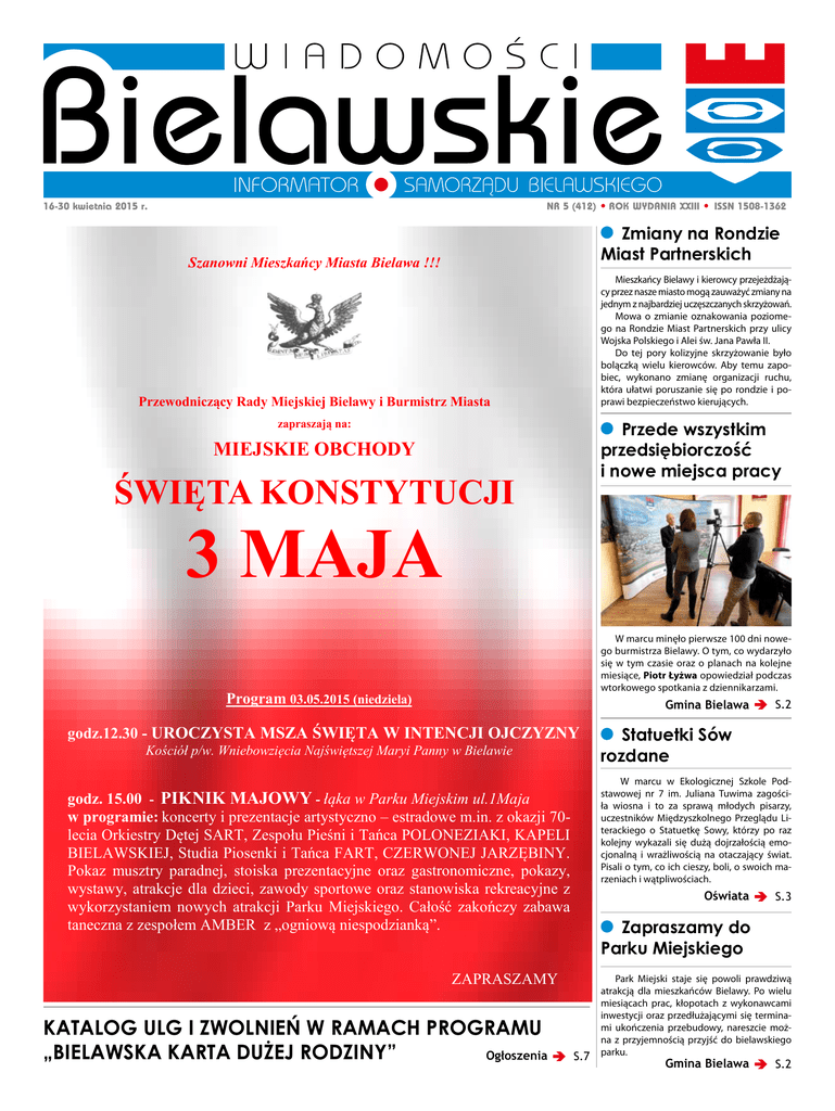16-30 kwietnia 2015 r. NR 5 (412) ROK WYDANIA XXIII ISSN 1508-1362 Zmiany na Rondzie Miast Partnerskich Szanowni Mieszkańcy Miasta Bielawa !!! Mieszkańcy Bielawy i kierowcy przejeżdżający przez nasze miasto mogą zauważyć zmiany na jednym z najbardziej uczęszczanych skrzyżowań. Mowa o zmianie oznakowania poziomego na Rondzie Miast Partnerskich przy ulicy Wojska Polskiego i Alei św. Jana Pawła II. Do tej pory kolizyjne skrzyżowanie było bolączką wielu kierowców. Aby temu zapobiec, wykonano zmianę organizacji ruchu, która ułatwi poruszanie się po rondzie i poprawi bezpieczeństwo kierujących. Przewodniczący Rady Miejskiej Bielawy i Burmistrz Miasta zapraszają na: Przede wszystkim przedsiębiorczość i nowe miejsca pracy MIEJSKIE OBCHODY ŚWIĘTA KONSTYTUCJI 3 MAJA W marcu minęło pierwsze 100 dni nowego burmistrza Bielawy. O tym, co wydarzyło się w tym czasie oraz o planach na kolejne miesiące, Piotr Łyżwa opowiedział podczas wtorkowego spotkania z dziennikarzami. Program 03.05.2015 (niedziela) Gmina Bielawa S.2 godz.12.30 - UROCZYSTA MSZA ŚWIĘTA W INTENCJI OJCZYZNY Kościół p/w. Wniebowzięcia Najświętszej Maryi Panny w Bielawie W marcu w Ekologicznej Szkole Podstawowej nr 7 im. Juliana Tuwima zagościła wiosna i to za sprawą młodych pisarzy, uczestników Międzyszkolnego Przeglądu Literackiego o Statuetkę Sowy, którzy po raz kolejny wykazali się dużą dojrzałością emocjonalną i wrażliwością na otaczający świat. Pisali o tym, co ich cieszy, boli, o swoich marzeniach i wątpliwościach. godz. 15.00 - PIKNIK MAJOWY - łąka w Parku Miejskim ul.1Maja w programie: koncerty i prezentacje artystyczno – estradowe m.in. z okazji 70lecia Orkiestry Dętej SART, Zespołu Pieśni i Tańca POLONEZIAKI, KAPELI BIELAWSKIEJ, Studia Piosenki i Tańca FART, CZERWONEJ JARZĘBINY. Pokaz musztry paradnej, stoiska prezentacyjne oraz gastronomiczne, pokazy, wystawy, atrakcje dla dzieci, zawody sportowe oraz stanowiska rekreacyjne z wykorzystaniem nowych atrakcji Parku Miejskiego. Całość zakończy zabawa taneczna z zespołem AMBER z „ogniową niespodzianką”. Oświata S.3 Zapraszamy do Parku Miejskiego ZAPRASZAMY KATALOG ULG I ZWOLNIEŃ W RAMACH PROGRAMU „BIELAWSKA KARTA DUŻEJ RODZINY” Ogłoszenia Statuetki Sów rozdane S.7 Park Miejski staje się powoli prawdziwą atrakcją dla mieszkańców Bielawy. Po wielu miesiącach prac, kłopotach z wykonawcami inwestycji oraz przedłużającymi się terminami ukończenia przebudowy, nareszcie można z przyjemnością przyjść do bielawskiego parku. Gmina Bielawa S.2 2 Gmina Bielawa Podwórko Nivea Bielawa przystąpiła do konkursu pod hasłem „Podwórko NIVEA”. Nagrodą w konkursie jest wybudowanie placu zabaw w mieście, które będzie laureatem akcji. Prosimy mieszkańców o wsparcie Bielawy w konkursie, ponieważ jest szansa, aby nowy plac zabaw powstał w górnej części miasta przy ulicy Polnej. Szczegóły na temat konkursu i głosowania znaleźć można na stronie www.nivea.pl/podworko. Tam też znajdują się informacje o uczestnikach konkursu, którzy skutecznie dokonali zgłoszenia. Rywalizacja polega na aktywnym głosowaniu na zgłoszoną lokalizację (ul. Polna), za pośrednictwem strony internetowej: www. nivea.pl/podworko. Codziennie każdy mieszkaniec ma możliwość oddania jednego głosu, a im więcej głosów, tym większa szansa na wygraną i wspólną zabawę. Pierwsza tura głosowania trwa od 1 do 30 kwietnia i ma na celu wyłonienie 20 zwycięskich lokalizacji Druga tura głosowania od 1 do 31 maja i ma na celu wyłonienie kolejnych 20 lokalizacji. S.1 Zapraszamy do Parku Miejskiego Burmistrz Bielawy Piotr Łyżwa podsumował pierwsze sto dni urzędowania S.1 Przede wszystkim przedsiębiorczość i nowe miejsca pracy W marcu minęło pierwsze 100 dni nowego burmistrza Bielawy. O tym, co wydarzyło się w tym Po wykonaniu nasadzeń park będzie bardziej atrakcyjny czasie oraz o planach na kolejne miesiące, Piotr Łyżwa opowiedział podczas wtorkowego spotkania z dziennikarzami. Park Miejski staje się powoli że przystań dla łódek i kajaków, z prawdziwą atrakcją dla mieszkań- których będzie można korzystać - Nie ukrywam, że moim naj- głoby ubiegać się o środki ze- ców Bielawy. Po wielu miesiącach jeszcze w tym roku. Jak zaznaczył burmistrz, pierwsze miesiące wykorzystał ważniejszym celem jest pozyskiwa- wnętrzne, rozpoczęcie prac nad prac, kłopotach z wykonawcami Obecnie miasto rozpoczęło między innymi na wprowadze- nie dla miasta zewnętrznych inwe- „Polityką Mieszkaniową Miasta”, inwestycji oraz przedłużającymi prace związane z uporządkowasię terminami ukończenia przenie własnych pomysłów na funk- storów, którzy dadzą mieszkańcom z uwzględnieniem budowy mieszniem terenów zielonych na terebudowy, nareszcie można z przycjonowanie Urzędu Miejskiego, nowe miejsca pracy. Niewątpliwie kań komunalnych i wsparcie Karty nie parku i dokonaniem nasadzeń jemnością przyjść do bielawskiespółek gminnych, a także Straży właśnie tego obecnie najbardziej Dużej Rodziny. różnego rodzaju roślinności. Po go parku. - Moją ambicją jest włączenie Miejskiej czy Ośrodka Sportu i Re- potrzebują bielawianie – podkreich zakończeniu park będzie jeszKażdy kto odwiedzi to miejmieszkańców w zarządzanie miakreacji. Wszystko po to, aby każ- ślił Piotr Łyżwa. Warto zaznaczyć, że oprócz stem. Chciałbym, aby pomysły do- sce zobaczy m.in. nowe alejki, cze bardziej atrakcyjny. da instytucja działała sprawniej i spełniała oczekiwania miesz- pozyskiwania do miasta nowych tyczące rozwoju naszego miasta oświetlenie i ławki. Dużą popularNależy wspomnieć, że inwekańców. Wspomniany czas to tak- inwestorów, priorytetem dla bur- realizowane były przy udziale i po- nością wśród spacerujących ciestycja, którą współfinansowała szą się mostki nad odnowionymi że rozpoznanie realnej sytuacji mistrza jest r