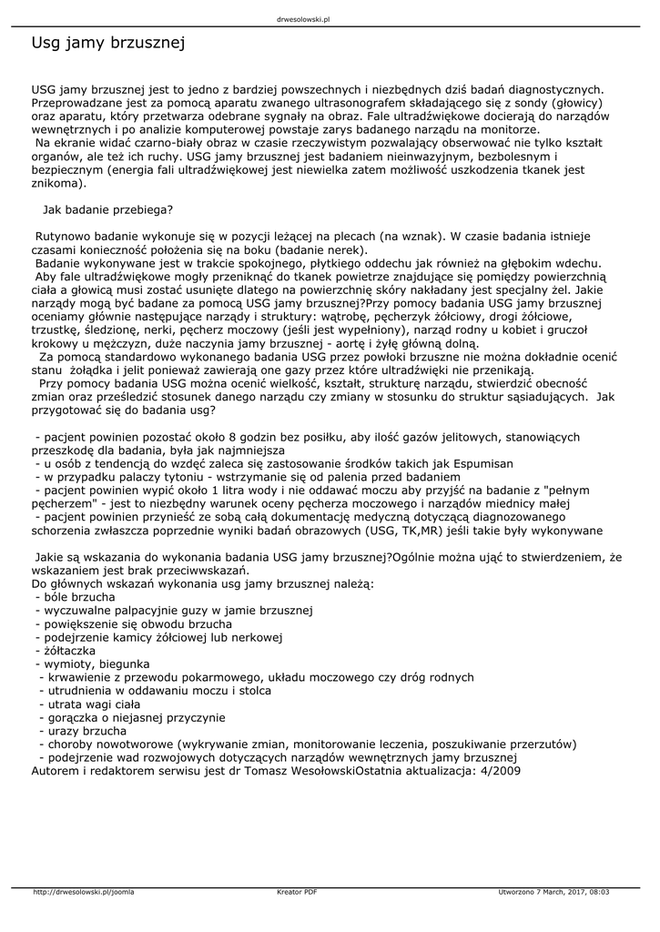 drwesolowski.pl Usg jamy brzusznej USG jamy brzusznej jest to jedno z bardziej powszechnych i niezbędnych dziś badań diagnostycznych. Przeprowadzane jest za pomocą aparatu zwanego ultrasonografem składającego się z sondy (głowicy) oraz aparatu, który przetwarza odebrane sygnały na obraz. Fale ultradźwiękowe docierają do narządów wewnętrznych i po analizie komputerowej powstaje zarys badanego narządu na monitorze. Na ekranie widać czarno-biały obraz w czasie rzeczywistym pozwalający obserwować nie tylko kształt organów, ale też ich ruchy. USG jamy brzusznej jest badaniem nieinwazyjnym, bezbolesnym i bezpiecznym (energia fali ultradźwiękowej jest niewielka zatem możliwość uszkodzenia tkanek jest znikoma). Jak badanie przebiega? Rutynowo badanie wykonuje się w pozycji leżącej na plecach (na wznak). W czasie badania istnieje czasami konieczność położenia się na boku (badanie nerek). Badanie wykonywane jest w trakcie spokojnego, płytkiego oddechu jak również na głębokim wdechu. Aby fale ultradźwiękowe mogły przeniknąć do tkanek powietrze znajdujące się pomiędzy powierzchnią ciała a głowicą musi zostać usunięte dlatego na powierzchnię skóry nakładany jest specjalny żel. Jakie narządy mogą być badane za pomocą USG jamy brzusznej?Przy pomocy badania USG jamy brzusznej oceniamy głównie następujące narządy i struktury: wątrobę, pęcherzyk żółciowy, drogi żółciowe, trzustkę, śledzionę, nerki, pęcherz moczowy (jeśli jest wypełniony), narząd rodny u kobiet i gruczoł krokowy u mężczyzn, duże naczynia jamy brzusznej - aortę i żyłę główną dolną. Za pomocą standardowo wykonanego badania USG przez powłoki brzuszne nie można dokładnie ocenić stanu żołądka i jelit ponieważ zawierają one gazy przez które ultradźwięki nie przenikają. Przy pomocy badania USG można ocenić wielkość, kształt, strukturę narządu, stwierdzić obecność zmian oraz prześledzić stosunek danego narządu czy zmiany w stosunku do struktur sąsiadujących. Jak przygotować się do badania usg? - pacjent powinien pozostać około 8 godzin bez posiłku, aby ilość gazów jelitowych, stanowiących przeszkodę dla badania, była jak najmniejsza - u osób z tendencją do wzdęć zaleca się zastosowanie środków takich jak Espumisan - w przypadku palaczy tytoniu - wstrzymanie się od palenia przed badaniem - pacjent powinien wypić około 1 litra wody i nie oddawać moczu aby przyjść na badanie z "pełnym pęcherzem" - jest to niezbędny warunek oceny pęcherza moczowego i narządów miednicy małej - pacjent powinien przynieść ze sobą całą dokumentację medyczną dotyczącą diagnozowanego schorzenia zwłaszcza poprzednie wyniki badań obrazowych (USG, TK,MR) jeśli takie były wykonywane Jakie są wskazania do wykonania badania USG jamy brzusznej?Ogólnie można ująć to stwierdzeniem, że wskazaniem jest brak przeciwwskazań. Do głównych wskazań wykonania usg jamy brzusznej należą: - bóle brzucha - wyczuwalne palpacyjnie guzy w jamie brzusznej - powiększenie się obwodu brzucha - podejrzenie kamicy żółciowej lub nerkowej - żółtaczka - wymioty, biegunka - krwawienie z przewodu pokarmowego, układu moczowego czy dróg rodnych - utrudnienia w oddawaniu moczu i stolca - utrata wagi ciała - gorączka o niejasnej przyczynie - urazy brzucha - choroby nowotworowe (wykrywanie zmian, monitorowanie leczenia, poszukiwanie przerzutów) - podejrzenie wad rozwojowych dotyczących narządów wewnętrznych jamy brzusznej Autorem i redaktorem serwisu jest dr Tomasz WesołowskiOstatnia aktualizacja: 4/2009 http://drwesolowski.pl/joomla Kreator PDF Utworzono 7 March, 2017, 08:03