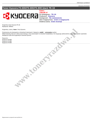 Informacje o produkcie Utworzono 07-03-2017 Toner Kyocera FS-600/FS-680/FS-800 black TK-16 Cena : 158,00 zł Nr katalogowy : TK-16 Producent : Kyocera Dostępność : Na zamówienie Stan magazynowy : brak w magazynie Średnia ocena : brak recenzji Oryginalny toner Kyocera TK-16 Wydajność: 6000str Oryginalny, czarny toner firmy Kyocera. a. pl Przeznaczony do stosowania w drukarkach laserowych. Zapewnia szybki i precyzyjny wydruk. Wkład laserowy dla tych, którzy dużo drukują i chcą zaoszczędzić na kosztach eksploatacji, nie rezygnując jednocześnie z najwyższej jakości wydruków dostępnych tylko dla oryginalnych tonerów Kyocera. w w w .t on er y ra zd w Pasuje do: Kyopcera FS-600 Kyopcera FS-680 Kyopcera FS-800 Wygenerowano w programie www.oscGold.com