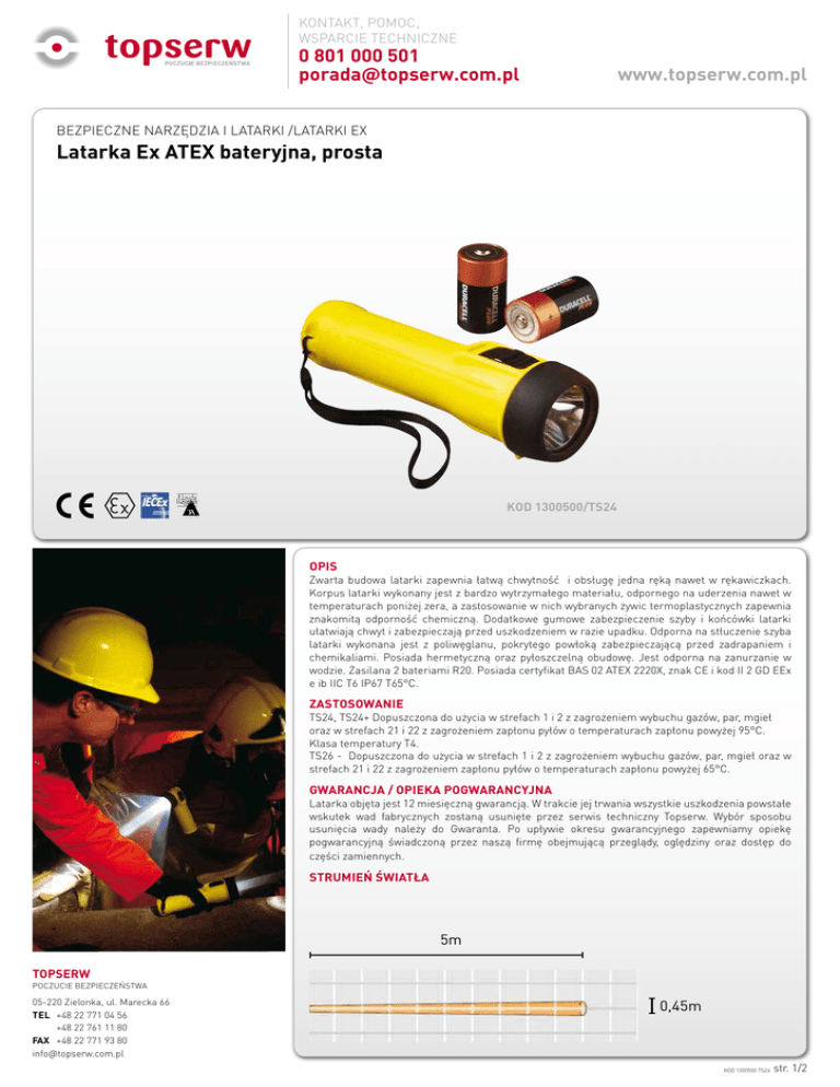 KONTAKT, POMOC, WSPARCIE TECHNICZNE 0 801 000 501 [email protected] www.topserw.com.pl BEZPIECZNE NARZĘDZIA I LATARKI /LATARKI EX Latarka Ex ATEX bateryjna, prosta KOD 1300500/TS24 OPIS Zwarta budowa latarki zapewnia łatwą chwytność i obsługę jedna ręką nawet w rękawiczkach. Korpus latarki wykonany jest z bardzo wytrzymałego materiału, odpornego na uderzenia nawet w temperaturach poniżej zera, a zastosowanie w nich wybranych żywic termoplastycznych zapewnia znakomitą odporność chemiczną. Dodatkowe gumowe zabezpieczenie szyby i końcówki latarki ułatwiają chwyt i zabezpieczają przed uszkodzeniem w razie upadku. Odporna na stłuczenie szyba latarki wykonana jest z poliwęglanu, pokrytego powłoką zabezpieczającą przed zadrapaniem i chemikaliami. Posiada hermetyczną oraz pyłoszczelną obudowę. Jest odporna na zanurzanie w wodzie. Zasilana 2 bateriami R20. Posiada certyfikat BAS 02 ATEX 2220X, znak CE i kod II 2 GD EEx e ib IIC T6 IP67 T65°C. ZASTOSOWANIE TS24, TS24+ Dopuszczona do użycia w strefach 1 i 2 z zagrożeniem wybuchu gazów, par, mgieł oraz w strefach 21 i 22 z zagrożeniem zapłonu pyłów o temperaturach zapłonu powyżej 95°C. Klasa temperatury T4. TS26 - Dopuszczona do użycia w strefach 1 i 2 z zagrożeniem wybuchu gazów, par, mgieł oraz w strefach 21 i 22 z zagrożeniem zapłonu pyłów o temperaturach zapłonu powyżej 65°C. GWARANCJA / OPIEKA POGWARANCYJNA Latarka objęta jest 12 miesięczną gwarancją. W trakcie jej trwania wszystkie uszkodzenia powstałe wskutek wad fabrycznych zostaną usunięte przez serwis techniczny Topserw. Wybór sposobu usunięcia wady należy do Gwaranta. Po upływie okresu gwarancyjnego zapewniamy opiekę pogwarancyjną świadczoną przez naszą firmę obejmującą przeglądy, oględziny oraz dostęp do części zamiennych. STRUMIEŃ ŚWIATŁA 5m TOPSERW POCZUCIE BEZPIECZEŃSTWA 05-220 Zielonka, ul. Marecka 66 TEL +48 22 771 04 56 +48 22 761 11 80 FAX +48 22 771 93 80 [email protected] 0,45m KOD 1300500 TS24 str. 1/2 KONTAKT, POMOC, WSPARCIE TECHNICZNE 0 801 000 501 [email protected] www.topserw.com.pl BEZPIECZNE NARZĘDZIA I LATARKI /LATARKI EX Latarka Ex ATEX bateryjna, prosta DANE TECHNICZNE Kod produktu Numer artykułu 1300500 1300035 1300031 TS-24 TS-24+ TS-26 Bezpieczna latarka, zasilanie bateryjne, prosta Opis produktu prosta T4 prosta T4+ ze wskaźn. prosta T6 II 2 GD EEx e ib IIC T4 (Totocz. = 40/55°C) IP67 T95°C (Totocz. = 55°C) Kod II 2 GD EEx e ib IIC T6 IP67 T65°C Kategoria sprzętu 2 GD Standard aparatu EN50014, EN60079-7 (+EN50019), EN50020, EN50281-1-1, IEC60079-0, IEC60079-7, IEC60079-11, IEC61241-0, IEC61241-1 Rodzaj ochrony Obszary klasyfikacji (gazy) Zwiększone bezpieczeństwo „e”, bezpieczeństwo wewnętrzne „ib” Strefy 1 i 2, Grupy gazów IIA, IIB, IIC Strefy 1 i 2, Grupy gazów IIA, IIB, IIC T4 T6 Klasyfikacja temperat. (gazy) Obszar klasyfikacji (pyły) Strefy 21 i 22 Maks. temp. powierzchni Temperatura otoczenia 95°C 65°C -20°C do +40°C/55°C -20°C do +40°C Certyfikacja BAS 02 ATEX 2220X, IECEx TSA 05.0017X Obudowa Tworzywo termoplastyczne odporne na uderzenia, bezpieczne elektrostatycznie Soczewka Poliwęglan, odporne na uderzenia z twardą powłoką Typ strumienia Nr produktu Źródło światła Średni punkt TP-404 TP-402 TP-406 Typ Żarówka żarowa ksenon. Żarówka żarowa, halogen. Żarówka żarowa próżn. Moc 2,4 V, 0,7 A 2,4 V, 0,83 A 2,4 V, 0,5 A Światłość 15 lm (przy nap.znam.) 23 lm (przy nap.znam.) 11,4 lm (przy nap.znam.) Czas pracy 50 godz. 30 godz. 15 godz. Żar. zapas. TP-404 TP-404 TP-406 Nr produktu Źródło zasilania Typ H-20 T-20 Baterie R20/LR20 IEC60086 Baterie R20 IEC60086 Napięcie Czas świecenia Stopień ochrony 2 x 1,5 V do 12 godzin 2 x 1,5 V do 10 godzin do 5 godz. IP67 wg EN60529: 1992 Waga (bez baterii) 150 g 60 mm TOPSERW POCZUCIE BEZPIECZEŃSTWA 200 mm 05-220 Zielonka, ul. Marecka 66 TEL +48 22 771 04 56 +48 22 761 11 80 FAX +48 22 771 93 80 [email protected] KOD 1300500 TS24 str. 2/2