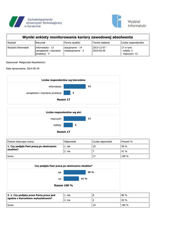 Wyniki ankiety monitorowania kariery zawodowej absolwenta Wydział Kierunek Forma studiów Termin badania Liczba respondentów Wydział Informatyki informatyka - 13 zarządzanie i inżynieria produkcji - 4 stacjonarne - 14 niestacjonarne - 3 2013-12-07 2014-02-05 17 w tym: - kobiet: 5 - mężczyzn: 12 Opracował: Małgorzata Nazarkiewicz Data opracowania: 2014-05-29 Liczba respondentów wg kierunków 13 informatyka 4 zarządzanie i inżynieria produkcji Razem 17 Liczba respondentów wg płci 12 mężczyźni 5 kobiety Razem 17 Pytanie dotyczące oceny: Odpowiedź Liczba odpowiedzi Procent % 1. Czy podjęła Pani pracę po ukończeniu studiów? 1. tak 10 59 % 2. nie 7 41 % 17 100 % Suma Czy podjęła Pani pracę po ukończeniu studiów? 59 % tak 41 % nie Razem 100 % 2. 1. Czy podjęta przez Panią praca jest zgodna z kierunkiem wykształcenia? Suma 1. tak 8 80 % 2. nie 2 20 % 10 100 % 1. Czy podjęta przez Panią praca jest zgodna z kierunkiem wykształcenia? 80 % tak 20 % nie Razem 100 % 3. 2. Ile czasu zajęło Pani znalezienie pracy? 1. mniej niż miesiąc 7 70 % 2. od 1 do 2 miesięcy 2 20 % 3. od 2 do 3 miesięcy 0 0% 4. od 3 do 4 miesięcy 0 0% 5. od 4 do 6 miesięcy 1 10 % 6. więcej niż 6 miesięcy 0 0% 10 100 % Suma 2. Ile czasu zajęło Pani znalezienie pracy? 70 % mniej niż miesiąc 20 % od 1 do 2 miesięcy od 2 do 3 miesięcy 0% od 3 do 4 miesięcy 0% od 4 do 6 miesięcy więcej niż 6 miesięcy 10 % 0% Razem 100 % 4. 3. Jaka forma zatrudnienia obowiązuje Panią w aktualnej pracy? Suma 1. umowa o pracę (etat) 5 50 % 2. umowa zlecenie / o dzieło 3 30 % 3. własna działalność gospodarcza 1 10 % 4. kontrakt / projekt 1 10 % 5. wolontariat 0 0% 6. staż 0 0% 7. inne 0 0% 10 100 % 3. Jaka forma zatrudnienia obowiązuje Panią w aktualnej pracy? 50 % umowa o pracę (etat) 30 % umowa zlecenie / o dzieło własna działalność gospodarcza 10 % kontrakt / projekt 10 % wolontariat 0% staż 0% inne 0% Razem 100 % 5. 4. Jakie stanowisko zajmuje Pani w aktualnej pracy? 1. właściciel 1 10 % 2. stanowisko kierownicze 1 10 % 3. stanowisko wykonawcze 8 80 % 4. stanowisko niezależne 0 0% 5. inne 0 0% 10 100 % Suma 4. Jakie stanowisko zajmuje Pani w aktualnej pracy? właściciel 10 % stanowisko kierownicze 10 % 80 % stanowisko wykonawcze stanowisko niezależne 0% inne 0% Razem 100 % 6. 5. W jakiej miejscowości/kraju aktualnie Pani pracuje?: 1. kraj Indywidualne 6. 5. W jakiej miejscowości/kraju aktualnie Pani pracuje?: 2. województwo ( w Polsce) 6. 5. W jakiej miejscowości/kraju aktualnie Pani pracuje?: 3. miejscowość 7. 6. Proszę wskazać zasięg działalności firmy, w której aktualnie Pani pracuje? Suma Indywidualne Indywidualne 1. lokalny 2 20 % 2. wojewódzki 1 10 % 3. krajowy 2 20 % 4. międzynarodowy 5 50 % 10 100 % tabela nr 1 tabela nr 2 tabela nr 3 6. Proszę wskazać zasięg działalności firmy, w której aktualnie Pani pracuje? 20 % lokalny 10 % wojewódzki 20 % krajowy 50 % międzynarodowy Razem 100 % 8. 7. Proszę określić do jakiej branży należy firma w której aktualnie Pani pracuje?: 1. podaj 9. 8. Proszę wskazać sektor do jakiego można zaliczyć profil firmy, w której Pani aktualnie pracuje? Indywidualne tabela nr 4 1. sektor 1 (rolnictwo, leśnictwo, rybołówstwo) 0 0% 2. sektor 2 (budownictwo / przemysł) 0 0% 3. sektor 3 (usługi) 8 80 % 4. sektor 4 (zdobywanie, przetwarzanie i dostarczanie informacji) 2 20 % 10 100 % Suma 8. Proszę wskazać sektor do jakiego można zaliczyć profil firmy, w której Pani aktualnie pracuje? sektor 1 (rolnictwo, leśnictwo, rybołówstwo) 0% sektor 2 (budownictwo / przemysł) 0% 80 % sektor 3 (usługi) sektor 4 (zdobywanie, przetwarzanie i dostarczanie informacji) 20 % Razem 100 % 10.1. poziom satysfakcji 9. Proszę wskazać w skali od 1 do 5 Pani poziom satysfakcji z aktualnej pracy (gdzie: 1 - nie jestem zadowolony, 5 - jestem bardzo zadowolony): Suma 1 0 0% 2 0 0% 3 1 10 % 4 5 50 % 5 4 40 % 10 100 % poziom satysfakcji 1 0% 2 0% 10 % 3 50 % 4 40 % 5 Razem 100 % 11.1. specjalistyczne związane z kierunkiem studiów 10. W jakim stopniu wymienione poniżej umiejętności są przydatne na zajmowanym przez Panią stanowisku pracy? (gdzie : 1 – całkowicie nieprzydatne, 5 – bardzo przydatne) 1 0 0% 2 2 20 % 3 1 10 % 4 0 0% 5 7 70 % 10 100 % Suma specjalistyczne związane z kierunkiem studiów 0% 1 20 % 2 10 % 3 0% 4 70 % 5 Razem 100 % 11.2. informatyczne – stosowanie narzędzi komputerowych 10. W jakim stopniu wymienione poniżej umiejętności są przydatne na zajmowanym przez Panią stanowisku pracy? (gdzie : 1 – całkowicie nieprzydatne, 5 – bardzo przydatne) 1 0 0% 2 0 0% 3 1 10 % 4 1 10 % 5 8 80 % 10 100 % Suma informatyczne – stosowanie narzędzi komputerowych 1 0% 2 0% 3 10 % 4 10 % 80 % 5 Razem 100 % 11.3. interpersonalne 1 1 10 % 10. W jakim stopniu wymienione poniżej umiejętności są przydatne na zajmowanym przez Panią stanowisku pracy? (gdzie : 1 – całkowicie nieprzydatne, 5 – bardzo przydatne) 2 0 0% 3 3 30 % 4 4 40 % 5 2 20 % 10 100 % Suma interpersonalne 10 % 1 0% 2 30 % 3 40 % 4 20 % 5 Razem 100 % 11.4. ekonomiczne 10. W jakim stopniu wymienione poniżej umiejętności są przydatne na zajmowanym przez Panią stanowisku pracy? (gdzie : 1 – całkowicie nieprzydatne, 5 – bardzo przydatne) 1 3 30 % 2 3 30 % 3 3 30 % 4 1 10 % 5 0 0% 10 100 % Suma ekonomiczne 1 30 % 2 30 % 3 30 % 10 % 4 0% 5 Razem 100 % 11.5. znajomość języków obcych 10. W jakim stopniu wymienione poniżej umiejętności są przydatne na zajmowanym przez Panią stanowisku pracy? (gdzie : 1 – całkowicie nieprzydatne, 5 – bardzo przydatne) Suma 1 0 0% 2 0 0% 3 3 30 % 4 3 30 % 5 4 40 % 10 100 % znajomość języków obcych 1 0% 2 0% 3 30 % 4 30 % 40 % 5 Razem 100 % 12. 11. Jaka jest przyczyna nie podjęcia przez Panią pracy? 1. szukam pracy, ale nie 0 znalazłem firmy, która spełniłaby moje wymagania pod względem (zarobkowym, lokalizacyjnym, możliwości rozwoju zawodowego, inne – proszę wymienić jakie
