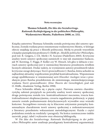 Nota recenzyjna Thomas Schmidt, Die Idee des Sozialvertrags. Rationale Rechtsfertigung in der politischen Philosophie, Wydawnictwo Mentis, Paderborn 2000, ss. 232. Książka autorstwa Thomasa Schmidta została poświęcona idei umowy społecznej. Została wydana przez renomowane wydawnictwo Mentis, w którego ofercie znajdują się prace z filozofii politycznej. Myślę tu przede wszystkim o księdze pamiątkowej profesora O. Höffe pt.: Modelle politischer Philosohpie, pod red. R. Geigera, J.-Ch. Merle i N. Scarano (Paderborn 2003). Krytyczne analizy teorii umowy społecznej zamieścili w niej tak znamienici badacze, jak W. Kersting, T. Pogge, P. Koller czy W. Hinsch. Ich głos w debacie o teoriach umowy społecznej jest w niemieckiej literaturze przedmiotu źródłem licznych odniesień. Dodać należy, że wymienieni autorzy przedstawili także krytyczne uwagi dotyczące Teorii sprawiedliwości J. Rawlsa, która uchodzi za najbardziej aktualny współcześnie przykład kontraktualizmu. Wspomniane uwagi opublikowano w renomowanej serii Klassiker Auslegen wraz z przesłanym przez Rawlsa przedsłowiem do zmienionego, niemieckojęzycznego wydania Teorii sprawiedliwości. (Eine Theorie der Gerechtigkeit, pod red. O. Höffe, Akademie Verlag, Berlin 1998). Praca Schmidta składa się z pięciu części. Pierwsza zawiera charakterystykę założeń przyjętych na potrzeby analizy teorii umowy społecznej, druga poświęcona została tzw. kontraktualizmowi mocnemu, trzecia kontraktualizmowi eksplanacyjnemu, czwarta zagadnieniu preferencji, w piątej zawarte zostało podsumowanie dotychczasowych wywodów oraz wnioski końcowe. Szczegółowo rozważa się tu kluczowe antynomie pomiędzy konsensualnym charakterem teorii umowy społecznej a zrekonstruowanymi z literatury przedmiotu wskazaniami metodologicznymi. Każda z części podzielona została na rozdziały i paragrafy. Na końcu zamieszczono indeks nazwisk, pojęć, tabel i wykresów oraz obszerną bibliografię. W Die Idee des Sozialvertrags. Rationale Rechtsfertigung in der politischen Philosophie autor analizuje paradygmaty kontraktowej argumentacji. 324 PRZEGLĄD PRAWA KONSTYTUCYJNEGO 2010/2–3 Ujawnia ograniczenia charakteryzujące klasyczne teorie umowy społecznej. Przyjmuje się w nich, że uzasadniona organizacja polityczna wspólnoty jest rezultatem zgody racjonalnych jednostek postępujących z dbałością o własne interesy. Schmidt dowodzi, że kategoria racjonalności jednostek określa moment zawarcia umowy. Nie przekonuje o trwałości organizacji politycznej wspólnoty. Klasyczne teorie umowy społecznej posiłkują się w tym zakresie argumentem sankcji wymierzanych przez podmiot zbiorowy. Wątpliwości dotyczące odnośnej argumentacji wynikają z tego, że koncepcja umowy społecznej zorientowana jest indywidualistycznie (podmioty umiejscowione w sytuacji pierwotnej to autonomiczne i kooperujące z sobą jednostki). Współczesne teorie umowy społecznej podejmują się znalezienia trafniejszej argumentacji w oparciu o analizę interakcji zachodzących pomiędzy racjonalnymi jednostkami. Zaanonsowany kierunek rozumowań pozwala na systematyzację teorii umowy społecznej. Schmidt przyjmuje podział na kontraktualizm decyzyjny oraz interakcyjny. Oba wspomniane typy zalicza do kontraktualizmu uzasadniającego, który przeciwstawiany jest kontraktualizmowi eksplanacyjnemu. Początkiem rozumowań jest w nim opis istniejących stosunków społecznych i politycznych. Kontraktualizm ten wyjaśnia kształt istniejącej organizacji politycznej oraz umożliwia prognozowanie zmian tworzących go instytucji. Przyjmuje także podział na kontraktualizm mocny i słaby. Pierwszy statuuje argumentacja oparta na wyłącznie na kategorii racjonalności podmiotów. Autor poprzedza analizę zasobów argumentacyjnych każdego z wyodrębnionych typów kontraktualizmu rekonstrukcją kategorii racjonalności praktycznej. Wskazuje na współczesne powiązania tej kategorii z teorią gier. Rekonstruuje znaczenie takich pojęć, jak słaba preferencja, refleksyjność czy funkcja korzyści. Wyjaśniając znaczenia takich pojęć jak te, Schmidt korzysta z przejrzystych wykresów i związanych z przykładami tabel. Ustalenia Schmidta, których wyrazem jest przedstawiana przez autora systematyzacja koncepcji uchodzących za przykłady teorii umowy społecznej, z tego właśnie względu zasługują na uwagę. Niewiele jest prac, w których w tak sprawny stylistycznie i przejrzysty argumentacyjnie sposób, zanalizowano teorię umowy społecznej. Paweł Polaczuk (Uniwersytet Warmińsko-Mazurski w Olsztynie)