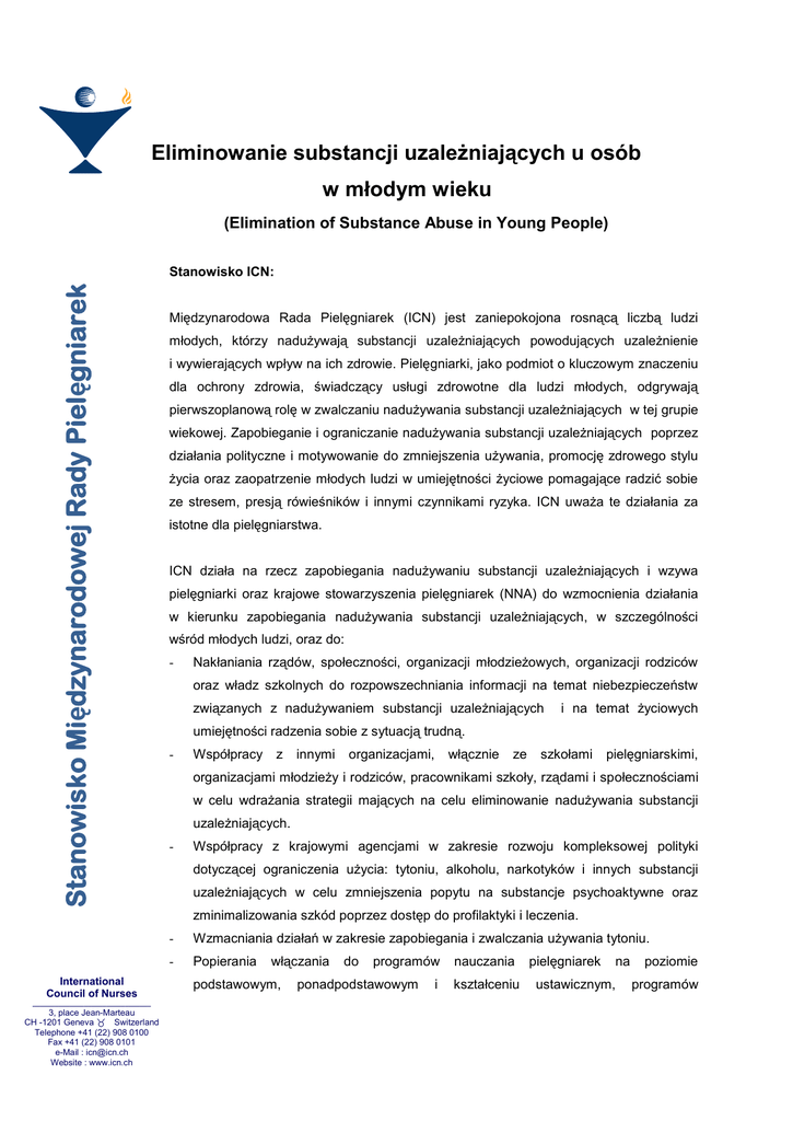 Eliminowanie substancji uzależniających u osób w młodym wieku (Elimination of Substance Abuse in Young People) Stanowisko Międzynarodowej Rady Pielęgniarek Stanowisko ICN: Międzynarodowa Rada Pielęgniarek (ICN) jest zaniepokojona rosnącą liczbą ludzi młodych, którzy nadużywają substancji uzależniających powodujących uzależnienie i wywierających wpływ na ich zdrowie. Pielęgniarki, jako podmiot o kluczowym znaczeniu dla ochrony zdrowia, świadczący usługi zdrowotne dla ludzi młodych, odgrywają pierwszoplanową rolę w zwalczaniu nadużywania substancji uzależniających w tej grupie wiekowej. Zapobieganie i ograniczanie nadużywania substancji uzależniających poprzez działania polityczne i motywowanie do zmniejszenia używania, promocję zdrowego stylu życia oraz zaopatrzenie młodych ludzi w umiejętności życiowe pomagające radzić sobie ze stresem, presją rówieśników i innymi czynnikami ryzyka. ICN uważa te działania za istotne dla pielęgniarstwa. ICN działa na rzecz zapobiegania nadużywaniu substancji uzależniających i wzywa pielęgniarki oraz krajowe stowarzyszenia pielęgniarek (NNA) do wzmocnienia działania w kierunku zapobiegania nadużywania substancji uzależniających, w szczególności wśród młodych ludzi, oraz do: - Nakłaniania rządów, społeczności, organizacji młodzieżowych, organizacji rodziców oraz władz szkolnych do rozpowszechniania informacji na temat niebezpieczeństw związanych z nadużywaniem substancji uzależniających i na temat życiowych umiejętności radzenia sobie z sytuacją trudną. - Współpracy z innymi organizacjami, włącznie ze szkołami pielęgniarskimi, organizacjami młodzieży i rodziców, pracownikami szkoły, rządami i społecznościami w celu wdrażania strategii mających na celu eliminowanie nadużywania substancji uzależniających. - Współpracy z krajowymi agencjami w zakresie rozwoju kompleksowej polityki dotyczącej ograniczenia użycia: tytoniu, alkoholu, narkotyków i innych substancji uzależniających w celu zmniejszenia popytu na substancje psychoaktywne oraz zminimalizowania szkód poprzez dostęp do profilaktyki i leczenia. International Council of Nurses ________________________________ 3, place Jean-Marteau CH -1201 Geneva Switzerland Telephone +41 (22) 908 0100 Fax +41 (22) 908 0101 e-Mail : [email protected] Website : www.icn.ch - Wzmacniania działań w zakresie zapobiegania i zwalczania używania tytoniu. - Popierania włączania podstawowym, do programów ponadpodstawowym i nauczania kształceniu pielęgniarek na ustawicznym, poziomie programów Stanowisko ICN „Eliminowanie substancji uzależniających u osób w młodym wieku” (Elimination of Substance Abuse in Young People) str. 2 profilaktycznych i zwalczających uzależnienia od tytoniu, alkoholu, narkotyków oraz innych nadużywanych substancji uzależniających . - Włączania się w badania: nad wskaźnikami, trendami i ciężarem chorób związanych z nadużywaniem substancji uzależniających uzależnieniem od nich przez osoby dorastające; nad skoncentrowanym na pacjencie podejściu do opieki i interwencjami farmakologicznymi; nad interwencjami dotyczącymi grup i jednostek wysokiego ryzyka oraz nad identyfikacją barier ograniczających wprowadzenie skutecznych działań profilaktycznych. - Zapewniania szerokiego zakresu środków ograniczających szkody, takich jak informowanie i doradzanie, szczepienia, wymianę igieł/strzykawek oraz kompleksowe zapobieganie i leczenie w sposób wyłączający dyskryminację. - Zwalczania uprzedzeń, stygmatów i dyskryminacji połączonych z nadużywaniem substancji uzależniających. - Wspierania interwencji politycznych w oparciu o prawa człowieka. Krajowe stowarzyszenia pielęgniarek i pielęgniarki muszą być zaangażowane w dyskusje na poziomie krajowym i kwestie polityczne związane z nadużywaniem substancji uzależniających. Tło: Tytoń, alkohol i zażywanie nielegalnych narkotyków przyjmuje postać znaczącego zagrożenia dla zdrowia, społecznych i ekonomicznych struktur rodziny, społeczności i narodów. Rosnąca liczba społecznych i ekonomicznych problemów połączona jest z zażywaniem tytoniu, alkoholu, narkotyków i innych substancji uzależniających . Skutki tych działań, często nie są ograniczone tylko do jednostek, ale dotykają również ich rodzin, przyjaciół, współpracowników i społeczeństwa jako całości. Ludzie młodzi mogą często nadużywać substancji uzależniających z powodu czynników rodzinnych, życiowych presji i wpływu rówieśników. Biologiczne zmiany w wieku dojrzewania wywołują niepewność i lęk, zaś narkotyki są często używane po to, bo sobie z tą sytuacją radzić. Obserwuje się wzrastające występowanie chorób przenoszonych drogą płciową: HIV, żółtaczki typu B i C oraz innych chorób wśród ludzi pijących alkohol i zażywających narkotyki i u tych, którzy dzielą się igłami do wstrzykiwania substancji uzależniających. Szacuje się, że palenie tytoniu powoduje około 5 1 milionów zgonów rocznie , dalej plasuje się alkohol, który jest sprawcą 2,3 miliona przedwczesnych zgonów lub 3,2% wszystkich zgonów na świecie oraz nielegalne narkotyki, powodujące 0,2% 2 wszystkich zgonów . Ważne jest rozróżnienie pomiędzy używaniem tytoniu i nadużywaniem innych substancji uzależniających . W przypadku tytoniu, każde „używanie” jest wielce niebezpieczne dla 1 2 WHO Report on the Global Tobacco Epidemics, 2008, The MPower package. Geneva WHO web site. www.who.int Stanowisko ICN „Eliminowanie substancji uzależniających u osób w młodym wieku” (Elimination of Substance Abuse in Young People) str. 3 młodzieży. Badania naukowe sugerują, że podatność na uzależnienie od nikotyny u dzieci zaczyna się niemal natychmiast w chwili, gdy zaczną palić. ICN wspiera globalne inicjatywy mające na celu ograniczenie lub wyeliminowanie używania tytoniu, takie jak Ramow