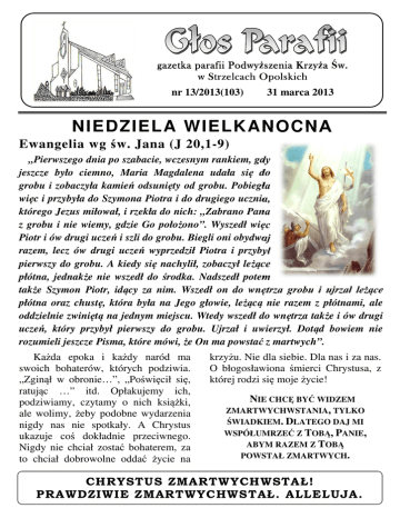 gazetka parafii Podwyższenia w. Podwy szenia Krzyża Krzy a Św. w Strzelcach Opolskich nr 13/2013(103) 31 marca 2013 NIEDZIELA WIELKANOCNA Ewangelia wg św. Jana (J 20,1-9) „Pierwszego dnia po szabacie, wczesnym rankiem, gdy jeszcze było ciemno, Maria Magdalena udała się do grobu i zobaczyła kamień odsunięty od grobu. Pobiegła więc i przybyła do Szymona Piotra i do drugiego ucznia, którego Jezus miłował, i rzekła do nich: „Zabrano Pana z grobu i nie wiemy, gdzie Go położono”. Wyszedł więc Piotr i ów drugi uczeń i szli do grobu. Biegli oni obydwaj razem, lecz ów drugi uczeń wyprzedził Piotra i przybył pierwszy do grobu. A kiedy się nachylił, zobaczył leżące płótna, jednakże nie wszedł do środka. Nadszedł potem także Szymon Piotr, idący za nim. Wszedł on do wnętrza grobu i ujrzał leżące płótna oraz chustę, która była na Jego głowie, leżącą nie razem z płótnami, ale oddzielnie zwiniętą na jednym miejscu. Wtedy wszedł do wnętrza także i ów drugi uczeń, który przybył pierwszy do grobu. Ujrzał i uwierzył. Dotąd bowiem nie rozumieli jeszcze Pisma, które mówi, że On ma powstać z martwych”. Każda epoka i każdy naród ma swoich bohaterów, których podziwia. „Zginął w obronie…”, „Poświęcił się, ratując …” itd. Opłakujemy ich, podziwiamy, czytamy o nich książki, ale wolimy, żeby podobne wydarzenia nigdy nas nie spotkały. A Chrystus ukazuje coś dokładnie przeciwnego. Nigdy nie chciał zostać bohaterem, za to chciał dobrowolne oddać życie na krzyżu. Nie dla siebie. Dla nas i za nas. O błogosławiona śmierci Chrystusa, z której rodzi się moje życie! NIE CHCĘ BYĆ WIDZEM ZMARTWYCHWSTANIA, TYLKO ŚWIADKIEM. DLATEGO DAJ MI WSPÓŁUMRZEĆ Z TOBĄ, PANIE, ABYM RAZEM Z TOBĄ POWSTAŁ ZMARTWYCH. CHRYSTUS ZMARTWYCHWSTAŁ! PRAWDZIWIE ZMARTWYCHWSTAŁ. ALLELUJA. 2 Gazetka Parafii Podwyższenia Krzyża Świętego w Strzelcach Opolskich PONIEDZIAŁEK W OKTAWIE WIELKANOCY – 1.04.2013 7.00 - Za + Gertrudę w rocz. śm., + Mariana, za wszystkich ++ z rodziny. - Za + Jana, ++ z rodzin Tarsa, Gurba i Chomicz oraz d. w cz. 8.30 - Do B. Op. i MB Fat... z ok. 35 rocz. ślubu Józefa i Renaty oraz o błog. Boże w rodzinie. 10.00 - Za + syna Adama, ++ rodziców z rodziny Wilczek i Zdobylak, + Damiana, siostrę Marię i d. w cz. - Do B. Op. i MB Fat... w int. Haliny z ok. 60 rocz. ur. oraz o błog. Boże dla całej rodziny 11.15 - Za + mamę Marię w rocz. śm., + ojca Edmunda oraz za ++ z rodziny. 15.00 - Do B. Op. i MB Fat... z ok. 70 rocz. ur. Jerzego i o błog. Boże dla dzieci z rodzinami. WTOREK W OKTAWIE WIELKANOCY – 2.04.2013 – ROCZ. ŚMIERCI BŁ. JANA PAWŁA II 7.00 - Za + Jana Gruszka, + matkę Amelię, + ojca Alfreda, ++ z rodzin Gruszka, Warzecha i Szlisz. 18.00 - Za + babcię Annę Firlit, jej + męża Jana i ++ rodziców z obu stron oraz + Kazimierza Łabęckiego. - Za ++ rodziców Stefana i Elżbietę Walczak oraz za ++ dziadków z tej rodziny. ŚRODA W OKTAWIE WIELKANOCY – 3.04.2013 7.00 - Za + mamę Helenę w 15 rocz. śm., ++ ojca Józefa, siostrę Dorotę oraz d. w cz. 8.00 - Msza św. szkolna. 17.00 - Za + mamę Annę oraz ++ z rodzin Grabowskich, Pacuchów i Przyborków. - Za ++ rodziców Karola i Magdalenę, Bronisława i Martę, + męża Reinharda i ++ z rodziny i pokrew. CZWARTEK W OKTAWIE WIELKANOCY – 4.04.2013 7.00 - Za kapłanów i o nowe powołania kapłańskie, zakonne i misyjne. - Za ++ rodziców Jakuba i Paulinę, + męża Alojzego, syna Joachima,++ rodzeństwo i ++ z pokrew. 18.00 - Za + Wiesława Kaniak w 1 rocz. śm. - Za ++ ojców Pawła i Franciszka, ++ rodzeństwo i ++ z rodziny Mroszczyk, Bul i Stryczek. PIĄTEK W OKTAWIE WIELKANOCY – 5.04.2013 7.00 - Za czcicieli NSP Jezusa, dobrodziejów parafii i budowniczych kościoła. - Za + ojca Alfreda Waloszek, mamę Klarę, siostrę, brata, teściów i ++ z rodziny i d. w cz. 18.00 - Do B. Op. i MB Fat... z ok. 55 rocz. ur. Urszuli oraz o błog. Boże dla rodziny. - Za ++ rodziców Józefa i Janinę, męża Jerzego, brata Józefa, ++ Mariannę i Aleksandra, teściów Mariana i Zofię, + Czesława Bloch, + ks. Nagadowskiego, ++ z pokrew. i d. w cz. SOBOTA W OKTAWIE WIELKANOCY – 6.04.2013 7.00 - Za czcicieli Matki Bożej i członków żywego różańca. - Za + córkę, żonę, mamę, babcię Danielę Lesiewicz z ok. rocz. ur. 18.00 - Za + Tadeusza Marciniak w 3 rocz. śm. i ++ z rodziny. - Za + Czesława Wojtanowskiego, rodziców Jana i Janinę oraz d. w cz. II NIEDZIELA WIELKANOCNA MIŁOSIERDZIA BOŻEGO – 7.04.2013 7.00 - Do B. Op. z podziękowaniem za otrzymane łaski z prośbą o zdrowie dusz i ciała w pewnej int. 8.30 - Do B. Op. i MB Fat... z ok. 55 rocz. ślubu Łucji i Edwarda Juszczak oraz o błog. Boże dla dzieci z rodzinami. - Za + żonę i matkę Genowefę Florek w 3 rocz. śm., ++ z rodziny Florek i Kuczyński 10.00 - Do Miłosierdzia Bożego o zdrowie i błog. Boże w rodzinie. - Do B. Op. i MB Fat... w int. Tomasza z ok. 30 rocz. ur. 11.15 - Do B. Op. i MB Fat... z ok. 50 rocz. ślubu Anieli i Aleksandra Gontarz oraz o Boże błog. dla dzieci i wnuków - Do B. Op. i MB Fat... z ok. 80 rocz. ur. Anny oraz o błog. Boże dla rodziny. 15.00 - Za + ojca Feliksa, mamę Aleksandrę, braci, siostrę, ++ z rodziny z obu stron, ++ z pokrew. i d. w c. - Do B. Op. i MB Fat... z prośbą o światło Ducha Świętego dla Łukasza z ok. 15 r. ur. oraz o zdrowie w rodz. - Do B. Op. i MB Fat... z ok. 60 rocz. ur. Moniki oraz o błog. Boże dla rodziny. 16.00 - NABOŻEŃSTWO DO MIŁOSIERDZIA BOŻEGO. Gazetka parafii pw. Podwyższenia Krzyża Świętego w Strzelcach Opolskich 3 ♦ NIEDZIELA WIELKANOCNA – ZMARTWYCHWSTANIE PAŃSKIE. Kościół żyje radością Zmartwychwstania naszego Pana Jezusa Chrystusa. Prawda o Zmartwychwstaniu Chrystusa jest najgłębszym fundamentem na którym opiera się chrześcijańska wiara. Dlatego Kościół śpieszy dziś do każdego człowieka z paschalnym życzeniem – budowania swo