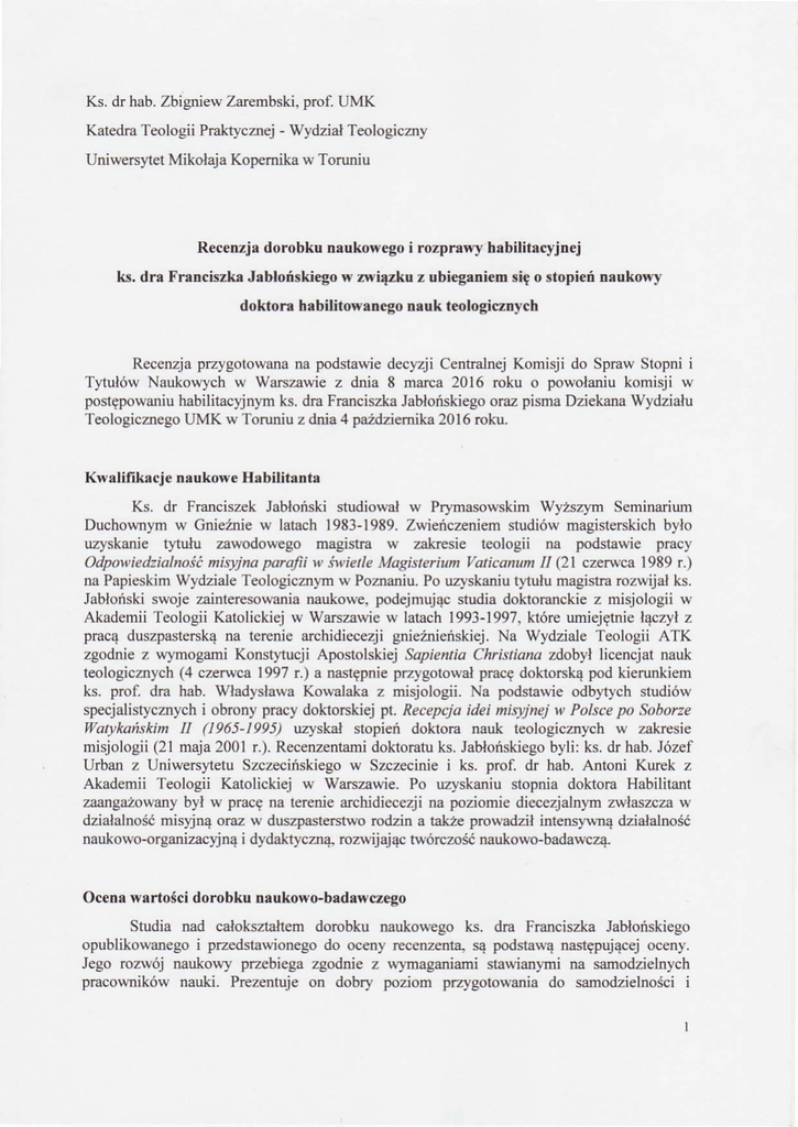 kontynuowaJrieprzewodu habilitacyjnego ks. dra Franciszka Jabłońskiegocelem uzyskania