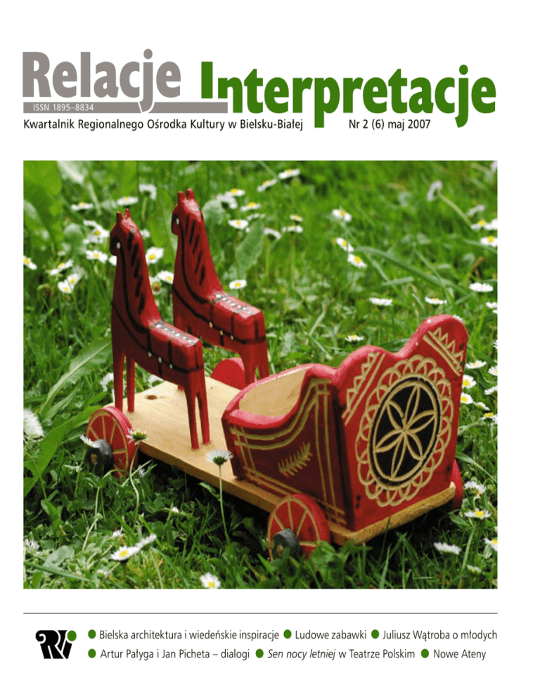 Relacje nterpretacje ISSN 1895–8834 Kwartalnik Regionalnego Ośrodka Kultury w Bielsku-Białej Bielska architektura i wiedeńskie inspiracje Artur Pałyga i Jan Picheta – dialogi Nr 2 (6) maj 2007 Ludowe zabawki Juliusz Wątroba o młodych Sen nocy letniej w Teatrze Polskim Nowe Ateny Beskidzkie Centrum Zabawkarstwa Ludowego Pod tym hasłem Regionalny Ośrodek Kultury w Bielsku-Białej prowadzi wiele różnorodnych działań. Bogata jest oferta na tegoroczne lato. Przypomnijmy, że w siedzibie ROK mieści się stała ekspozycja zabawek typowych dla ośrodków: myślenickiego, kieleckiego, rzeszowskiego i przede wszystkim żywieckiego. Obecnie trwają tu prace modernizacyjne, a ponownie Centrum zostanie oddane do dyspozycji zwiedzających 27 lipca. Tego samego dnia oficjalnie otwarta zostanie w Galerii Sztuki ROK międzynarodowa pokonkursowa wystawa zabawek tradycyjnych (potrwa do pierwszych dni września). Pokazane na niej będą prace twórców z krajów Grupy Wyszehradzkiej, a więc z Polski, Słowacji, Czech i Węgier. Przez trzy ostatnie dni tegorocznego Tygodnia Kultury Beskidzkiej – 3, 4 i 5 sierpnia – ROK zaprasza na warsztaty zabawkarskie. Poprowadzi je Tadeusz Leśniak ze Stryszawy i jak na stryszawską tradycję przystało, ich tematem będą ptaki – dziwaki. W warsztatach udział może wziąć każdy. Wystarczy przyjść na Targi Sztuki Ludowej w Żywcu – na dziedziniec Starego Zamku. Dwa ostatnie dni – 4 i 5 sierpnia – Targów w Żywcu upłyną pod znakiem prezentacji w ramach II Wyszehradzkich Dni Zabawki. Na zdjęciach zabawki ze stałej ekspozycji BCZL. Aleksander Dyl, Zbigniew Hojny, Marian Koim, Zbigniew Micherdziński (archiwum ROK) Relacje nterpretacje Folklor Kwartalnik Regionalnego Ośrodka Kultury w Bielsku-Białej Okładka/wkładka 1 Beskidzkie Centrum Zabawkarstwa Ludowego Góralskie dzieciństwo Rok II nr 2 (6) maj 2007 Adres redakcji ul. 1 Maja 8 43-300 Bielsko-Biała telefony 0-33-822-05-93 (centrala) 0-33-822-16-96 (redakcja) [email protected] www.rok.bielsko.pl Barbara Rosiek Felieton 3 W poszukiwaniu ducha miasta Katarzyna Sadowska Architek tura 4 Rynek niewykorzystanych szans Bożena Chorąży Bogusław Chorąży 8 Wiedeń, Hofburg Recenzje 19 Życie i ja Joanna Foryś Śladami Wiednia 20 Małgorzata Bujak Owoc widzenia Małgorzata Słonka 22 W ramionach osła Magdalena Legendź Nowe Ateny 29 Kuku pamięci Janusz Legoń Kar tka z podróż y 31 Jechać do Lwowa Marek Bernacki 33 36 Lwów, pomnik Nikifora M. Bernacki Literatura 14 Wiersze. Proza Aleksandra Kil Marta Maj Krzysztof Kurus 18 Młodzi! Utalentowani!? Juliusz Wątroba Rozmow y 24 Artur Pałyga czyta testament Z Arturem Pałygą rozmawiał Jan Picheta 26 Rozmaitości Rekomendacje Wychodzę z bagna Z Janem Pichetą rozmawiał Artur Pałyga Galeria Wkładka Moje krajobrazy – Maria Procyk © M. Bujak Redaktor naczelna Małgorzata Słonka Rada redakcyjna Ewa Bątkiewicz Lucyna Kozień Magdalena Legendź Janusz Legoń Leszek Miłoszewski Artur Pałyga Jan Picheta Maria Schejbal Agata Smalcerz Maria Trzeciak Juliusz Wątroba Urszula Witkowska Opracowanie graficzne, DTP Mirosław Baca Projekt logo Agata Tomiczek‑Wołonciej Wydawca Regionalny Ośrodek Kultury w Bielsku-Białej dyrektor Leszek Miłoszewski Nakład 900 egz. (dofinansowany przez Urząd Miejski w Bielsku-Białej) Naświetlanie Art-Line Plus Druk OW Augustana Czasopismo bezpłatne ISSN 1895–8834 Zrealizowano w ramach Programu Operacyjnego Promocja Czytelnictwa ogłoszonego przez Ministra Kultury i Dziedzictwa Narodowego Góralskie dzieciństwo Barbara Rosiek W lipcu i sierpniu Regionalny Ośrodek Kultury w Bielsku-Białej zaprasza do swojej galerii na międzynarodową pokonkursową wystawę zabawek. Dla jednych może ona być pretekstem do przywołania wspomnień z dzieciństwa, dla innych do głębszej refleksji nad współczesną kondycją tej dziedziny twórczości ludowej. Oba wątki łączą się w tekście Barbary Rosiek. Moje dzieci są już dorosłe. Wychowały się na plasti kowych konstruktorach i klockach lego. Ale pamiętam ich miny, gdy któregoś dnia przywiozłam do domu kle poka, bryczkę i koniki. I furorę, jaką te zabawki zrobiły w przedszkolu syna, gdzie zresztą pozostały. Wszystkie inne w tym momencie powędrowały do kąta. Dzieci ba wiły się ludowymi konikami. Dzisiaj rozmawiam z dziećmi odwiedzającymi mu zeum. Pokazuję im stare zabawki, pytam, czym się ba wią. Wymieniają mi jakieś gry komputerowe, lalki Barbi, transformersy itp. Niektóre, te do oglądania i podziwia nia, szybko je nudzą. Dziecko jest kreatywne, ma tyle po mysłów, chce tworzyć, niekoniecznie powielać. Potrze buje ruchu, jest pełne życia. Dawniej dzieci wiejskie nie nudziły się. Jeżeli nie miały akurat żadnych obowiąz ków, zawsze coś wymyśliły. Jakąś zabawę czy zabawkę. A dzieci żywieckich zabawkarzy pomagały w produk cji. Malowały koniki, bryczki czy ptaszki. Życie dzieci wiejskich nie było łatwe. Nie znaczy to, że się nie bawiły czy nie miały zabawek. Owszem – wy korzystywały każdą wolną chwilę, jaka się przydarzy ła. A nie było ich zbyt wiele. Przecież od najmłodszych lat pomagały w gospodarstwie i opiekowały się młod szym rodzeństwem. Jednak nie było w okolicy drzewa, jaru, wąwozu czy stawu, które nie byłyby spenetrowa ne. Z tego powodu krowy nieraz poszły w szkodę. Ale Karetki z ryzowaniem przecież wokół pastwiska wszystko było takie ciekawe. charakterystycznym Można było tyle podpatrzyć. Tyle się dowiedzieć. Gdy dla żywieckiego padał deszcz, trzeba było wymyślić jakiś prosty szałas. ośrodka zabawkarskiego Gdy prażyło słońce, nieraz wypełzały gady. W potoku (Teofil Szczygieł, Lachowice) rechotały żaby. Z pastwiska wracało się tyle razy z po Barbara Rosiek – etnograf Muzeum Miejskiego w Żywcu. Znawczyni zagadnień związanych z kulturą i sztuką ludową Beskidów, przede wszystkim Żywiecczyzny. Autorka licznych publikacji, kuratorka