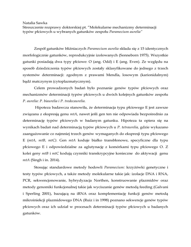 Natalia Sawka Streszczenie rozprawy doktorskiej pt. ”Molekularne mechanizmy determinacji typów płciowych u wybranych gatunków zespołu Paramecium aurelia” Zespół gatunków bliźniaczych Paramecium aurelia składa się z 15 identycznych morfologicznie gatunków, reprodukcyjnie izolowanych (Sonneborn 1975). Wszystkie gatunki posiadają dwa typy płciowe: O (ang. Odd) i E (ang. Even). Ze względu na sposób dziedziczenia typów płciowych zostały sklasyfikowane do jednego z trzech systemów determinacji: zgodnym z prawami Mendla, losowym (karionidalnym) bądź matczynym (cytoplazmatycznym). Celem prowadzonych badań było poznanie genów typów płciowych oraz mechanizmów determinacji typów płciowych u dwóch kolejnych gatunków zespołu P. aurelia: P. biaurelia i P. tredecaurelia. Hipoteza badawcza stanowiła, że determinacja typu płciowego E jest zawsze związana z ekspresją genu mtA, nawet jeśli gen ten nie odpowiada bezpośrednio za determinację typów płciowych w badanym gatunku. Hipoteza ta opiera się na wynikach badań nad determinacją typów płciowych u P. tetraurelia, gdzie wykazano zaangażowanie co najmniej trzech genów wymaganych do ekspresji typu płciowego E (mtA, mtB, mtC). Gen mtA koduje białko transbłonowe, specyficzne dla typu płciowego E i odpowiedzialne za aglutynację z komórkami typu płciowego O. Z kolei geny mtB i mtC kodują czynniki transkrypcyjne konieczne do aktywacji genu mtA (Singh i in. 2014). Stosując standardowe metody hodowli Paramecium: krzyżówki genetyczne i testy typów płciowych, a także metody molekularne takie jak: izolacje DNA i RNA, PCR, sekwencjonowanie, hybrydyzacja Northen, konstruowanie plazmidów oraz metody genomiki funkcjonalnej takie jak wyciszanie genów metodą feeding (Galvani i Sperling 2001), bazującą na iRNA oraz komplementację funkcji genów metodą mikroiniekcji plazmidowego DNA (Ruiz i in 1998) poznano sekwencje genów typów płciowych oraz ich udział w procesach determinacji typów płciowych u badanych gatunków. P. biaurelia charakteryzuje się matczynym dziedziczeniem typów płciowych. Po zajściu procesu płciowego, autogamii bądź koniugacji, typy płciowe w komórkach dziedziczone są zgodnie z typem płciowym komórki rodzicielskiej. W systemie tym, ich determinacja zachodzi poprzez procesy epigenetyczne w trakcie reorganizacji nowego genomu makrojądrowego przy udziale szlaku skanowania genomu. Przeprowadzone badania wykazały, że w sekwencji kodującej gen mtB występuje delecja 168 pz, co skutkuje brakiem kodowania funkcjonalnego białka. Brak kodowanego przez gen mtB czynnika transkrypcyjnego aktywującego gen mtA skutkuje ekspresją typu płciowego O. W komórkach typu płciowego E gen mtB koduje funkcjonalne białko, które aktywuje gen mtA, co z kolei skutkuje ekspresją typu płciowego E. P. tredecaurelia jest jedynym gatunkiem zespołu P. aurelia u którego typy płciowe dziedziczone są zgodnie z prawami Mendla, a za ich determinację odpowiedzialny jest jeden gen (Sonneborn 1974). Przeprowadzone badania wykazały, że gen mtA ulega ekspresji w typie płciowym E, jednak geny kodujące czynniki transkrypcyjne - mtB i mtC nie są zaangażowane w proces determinacji typów płciowych. Gen mtB w obu typach płciowych jest pseudogenem, z kolei wyciszanie genu mtC wykazało, że gen ten nie jest konieczny do ekspresji typu płciowego E. Przeprowadzone badania sugerują, że w proces aktywacji genu mtA jest zaangażowany nowy, nie opisany gen kodujący czynnik transkrypcyjny, który w typie płciowym O nie funkcjonuje. Przeprowadzone badania potwierdziły testowaną hipotezę, gdyż w obu gatunkach ekspresja genu mtA występuje tylko w reaktywnych komórkach typu płciowego E . Wyniki niniejszych badań w porównaniu z wynikami u P. tetraurelia, P. octaurelia, P. septaurelia (Singh i in. 2014) oraz wynikami badań wstępnych innych gatunków (Sawka nieopublikowane) sugerują, że w zespole gatunków P. aurelia doszło do ewolucji kilku mechanizmów determinacji typów płciowych, niezależnych od siebie.