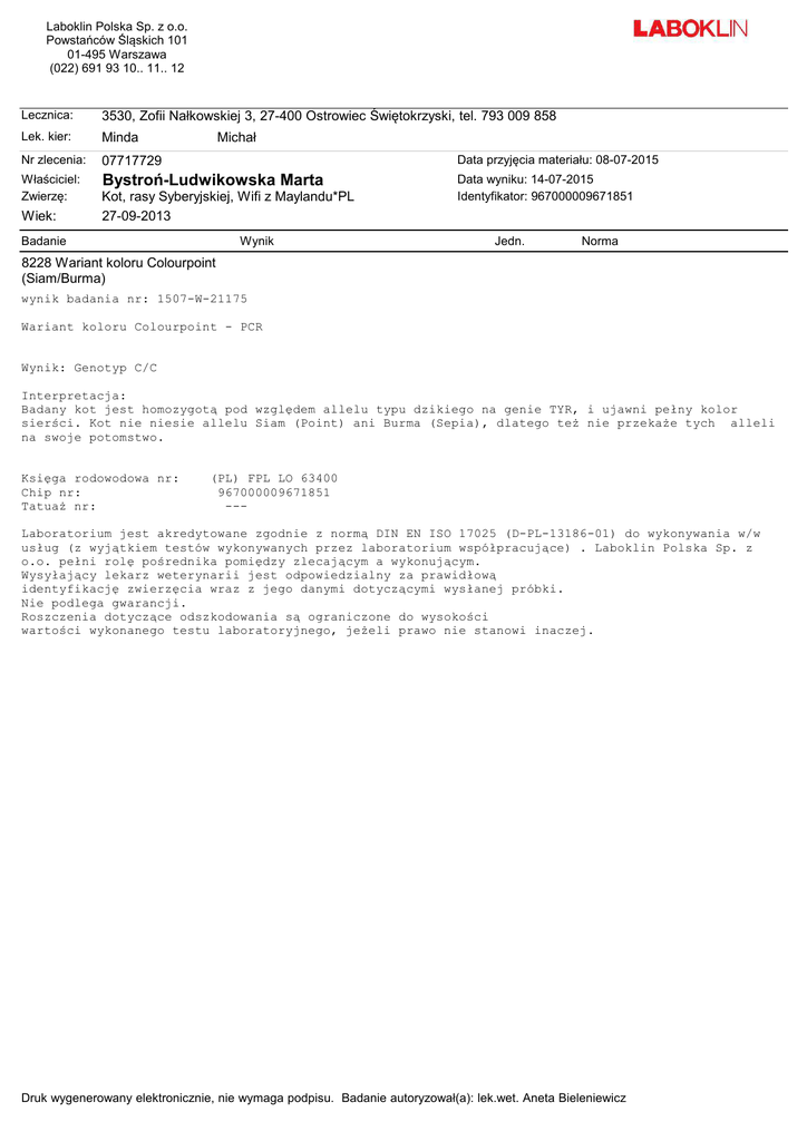 Laboklin Polska Sp. z o.o. Powstańców Śląskich 101 01-495 Warszawa (022) 691 93 10.. 11.. 12 Lecznica: 3530, Zofii Nałkowskiej 3, 27-400 Ostrowiec Świętokrzyski, tel. 793 009 858 Lek. kier: Minda Nr zlecenia: 07717729 Data przyjęcia materiału: 08-07-2015 Właściciel: Zwierzę: Bystroń-Ludwikowska Marta Data wyniku: 14-07-2015 Identyfikator: 967000009671851 Wiek: Michał Kot, rasy Syberyjskiej, Wifi z Maylandu*PL 27-09-2013 Badanie Wynik Jedn. Norma 8228 Wariant koloru Colourpoint (Siam/Burma) wynik badania nr: 1507-W-21175 Wariant koloru Colourpoint - PCR Wynik: Genotyp C/C Interpretacja: Badany kot jest homozygotą pod względem allelu typu dzikiego na genie TYR, i ujawni pełny kolor sierści. Kot nie niesie allelu Siam (Point) ani Burma (Sepia), dlatego też nie przekaże tych alleli na swoje potomstwo. Księga rodowodowa nr: Chip nr: Tatuaż nr: (PL) FPL LO 63400 967000009671851 --- Laboratorium jest akredytowane zgodnie z normą DIN EN ISO 17025 (D-PL-13186-01) do wykonywania w/w usług (z wyjątkiem testów wykonywanych przez laboratorium współpracujące) . Laboklin Polska Sp. z o.o. pełni rolę pośrednika pomiędzy zlecającym a wykonującym. Wysyłający lekarz weterynarii jest odpowiedzialny za prawidłową identyfikację zwierzęcia wraz z jego danymi dotyczącymi wysłanej próbki. Nie podlega gwarancji. Roszczenia dotyczące odszkodowania są ograniczone do wysokości wartości wykonanego testu laboratoryjnego, jeżeli prawo nie stanowi inaczej. Druk wygenerowany elektronicznie, nie wymaga podpisu. Badanie autoryzował(a): lek.wet. Aneta Bieleniewicz