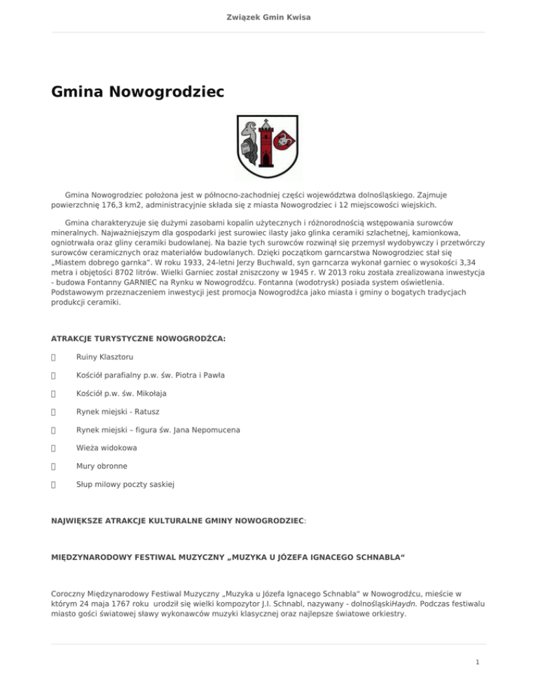 Związek Gmin Kwisa Gmina Nowogrodziec Gmina Nowogrodziec położona jest w północno-zachodniej części województwa dolnośląskiego. Zajmuje powierzchnię 176,3 km2, administracyjnie składa się z miasta Nowogrodziec i 12 miejscowości wiejskich. Gmina charakteryzuje się dużymi zasobami kopalin użytecznych i różnorodnością wstępowania surowców mineralnych. Najważniejszym dla gospodarki jest surowiec ilasty jako glinka ceramiki szlachetnej, kamionkowa, ogniotrwała oraz gliny ceramiki budowlanej. Na bazie tych surowców rozwinął się przemysł wydobywczy i przetwórczy surowców ceramicznych oraz materiałów budowlanych. Dzięki początkom garncarstwa Nowogrodziec stał się „Miastem dobrego garnka”. W roku 1933, 24-letni Jerzy Buchwald, syn garncarza wykonał garniec o wysokości 3,34 metra i objętości 8702 litrów. Wielki Garniec został zniszczony w 1945 r. W 2013 roku została zrealizowana inwestycja - budowa Fontanny GARNIEC na Rynku w Nowogrodźcu. Fontanna (wodotrysk) posiada system oświetlenia. Podstawowym przeznaczeniem inwestycji jest promocja Nowogrodźca jako miasta i gminy o bogatych tradycjach produkcji ceramiki. ATRAKCJE TURYSTYCZNE NOWOGRODŹCA: Ruiny Klasztoru Kościół parafialny p.w. św. Piotra i Pawła Kościół p.w. św. Mikołaja Rynek miejski - Ratusz Rynek miejski – figura św. Jana Nepomucena Wieża widokowa Mury obronne Słup milowy poczty saskiej NAJWIĘKSZE ATRAKCJE KULTURALNE GMINY NOWOGRODZIEC: MIĘDZYNARODOWY FESTIWAL MUZYCZNY „MUZYKA U JÓZEFA IGNACEGO SCHNABLA“ Coroczny Międzynarodowy Festiwal Muzyczny „Muzyka u Józefa Ignacego Schnabla“ w Nowogrodźcu, mieście w którym 24 maja 1767 roku urodził się wielki kompozytor J.I. Schnabl, nazywany - dolnośląskiHaydn. Podczas festiwalu miasto gości światowej sławy wykonawców muzyki klasycznej oraz najlepsze światowe orkiestry. 1 Związek Gmin Kwisa DNI GMINY I MIASTA NOWOGRODZIEC Nawiązując do historii i tradycji związanej z garncarstwem oraz dorobku kulturowego osadników, co roku podczas iprezy prezentowane są poszczególne miejscowości gminy przybliżając ich walory, tradycję, kulturę, folklor, tradycyjne potrawy regionalne, dawne zawody, rzemiosła ludowe i artystyczne. PIECZENICA Odbywa się co roku od 12 lat w miejscowości Gościszów, zamieszkałą prawie w całości przez repatriantów z gminy Srbac (Republika Serbska Bośni i Hercegowiny). Przywieźli ze sobą i pielęgnują do dziś tradycje i obrzędy, których przejawem jest właśnie Pieczenica, czyli pieczony prosiak. ŚWIĘTO CHLEBA Święto wspaniałych wypieków chlebowych, które organizowane jest cyklicznie w miejscowości Milików. NOWOGRODZIEC ZAPRASZA! 2