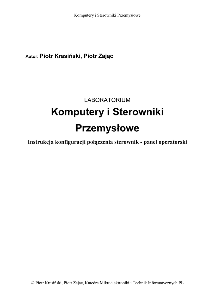 Komputery i Sterowniki Przemysłowe Autor: Piotr Krasiński, Piotr Zając LABORATORIUM Komputery i Sterowniki Przemysłowe Instrukcja konfiguracji połączenia sterownik - panel operatorski © Piotr Krasiński, Piotr Zając, Katedra Mikroelektroniki i Technik Informatycznych PŁ Komputery i Sterowniki Przemysłowe Konfigurację należy rozpocząć od wykonania odpowiednich ustawień w programie Proficy Machine Edition: W Navigatorze dwukrotnie klikamy na CPU. Otwiera się tabelka z ustawieniami sterownika. Na dole tabelki w polu Port 2 Configuration Wybieramy RS-485. Następnie w zakładce Port 2 (RS-485) w polu Port Mode wybieramy RTU oraz ustawiamy Station Adress na jakąś wartość np. 5. © Piotr Krasiński, Piotr Zając, Katedra Mikroelektroniki i Technik Informatycznych PŁ Komputery i Sterowniki Przemysłowe Program z takimi ustawieniami wgrywamy w sterownik i przechodzimy do konfiguracji w programie Astrada CFG. W Project Manager dwa razy klikamy na Link 1 (lub wybieramy Properties) i ustawiamy Modbus Device/Slave (RTU) oraz Link Port COM2 (Link 1). Następnie przechodzimy do zakładki Parameter. © Piotr Krasiński, Piotr Zając, Katedra Mikroelektroniki i Technik Informatycznych PŁ Komputery i Sterowniki Przemysłowe W zakładce Parameter ustawiamy takie same parametry transmisji jak były ustawione w Proficy. Jeśli nie zmienialiśmy domyslnych wartości w proficy musimy dokonać takich ustawień jak na obrazku poniżej: Powinno zadziałać... © Piotr Krasiński, Piotr Zając, Katedra Mikroelektroniki i Technik Informatycznych PŁ