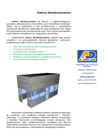 Kabina dźwiękoszczelna Kabiny dźwiękoszczelne są jednym z najskuteczniejszych sposobów zabezpieczenia pracowników przed szkodliwym działaniem hałasu. Są to wydzielone w hali pomieszczenia o odpowiedniej izolacyjności akustycznej. Odgrywają one dwie podstawowe role. Mogą być wykorzystane jako pomieszczenia ciche, które chronią pracowników przed hałasem zewnętrznym lub mogą pełnić rolę obudów. Projektowanie kabiny dźwiękoszczelnej związane jest przede wszystkim z ich przeznaczeniem. Warunki akustyczne i techniczne projektowanych kabin zależne są przede wszystkim od: • • • • • • chłonności akustycznej kabiny dźwiękoszczelnej, izolacyjności akustycznej, wymiarów kabiny dźwiękoszczelnej, klimatyzacji, wentylacji oraz odporności ogniowej, oświetlenia oraz wyposażenia w instalację elektryczną, widoczności kabiny dźwiękoszczelnej. Przedsiębiorstwo UsługowoHandlowe „DELĄG” Andrzej Deląg ul. Piekarska 24 34-325 Łodygowice tel/fax: +48 33 475 04 90 www.walkazhalasem.pl Warunkiem poprawnego działania obudowy dźwiękoszczelnej jest jej szczelność oraz wykonanie warstwy zewnętrznej z materiału odpornego na przenikanie dźwięku, natomiast warstwy wewnętrznej z materiału intensywnie pochłaniającego energię dźwiękową. Dla projektowanych kabin dźwiękoszczelnych wymagana jest również odpowiednia wentylacja maszyny oraz zastosowania zaprojektowanych filtrów dla doprowadzenia i odprowadzenia chłodzącego powietrza. Projektowane przez nas kabiny dźwiękoszczelne spełniają Polską Normę mówiącą o dopuszczalnych wartościach hałasu w środowisku pracy jak również Rozporządzenia Ministrów w sprawie dopuszczalnych poziomów hałasu w środowisku i ogólnych przepisów bezpieczeństwa i higieny pracy. Podczas prac związanych z projektowaniem kabin dźwiękoszczelnych wykonujemy pełny projekt wykonawczy z uwzględnieniem szczegółowych danych technicznych oraz symulacji akustycznych. Podczas odbycia wizji lokalnej przeprowadzamy pomiary hałasu i na tej podstawie powstaje wstępne opracowanie kabiny oraz symulacja akustyczna. Wynikami symulacji są: • • rozkład poziom dźwięku bezpośredniego rozkład poziom dźwięku całkowitego Komputerowa symulacja poziomu hałasu po wykonaniu kabiny dźwiękoszczelnej Kabiny dźwiękoszczelne projektujemy przy użyciu ciężkich materiałów konstrukcyjnych oraz profesjonalnych materiałów dźwiękochłonnych wyróżniających się bardzo dobrymi współczynnikami pochłaniania dźwięku. Zastosowane materiały pochodzą od profesjonalnych producentów, co skutkuje odpowiednią wytrzymałość i właściwości akustyczne. Efektywność projektowanych przez nas kabin, mierzona różnicą poziomu dźwięku A wokół maszyny lub urządzenia przed i po zamontowaniu kabiny dźwiękoszczelnej, zawiera się w przedziałach 10 ÷ 30dB.