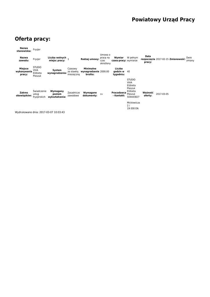 Powiatowy Urząd Pracy Oferta pracy: Nazwa Fryzjer stanowiska: Nazwa zawodu: Fryzjer STUDIO Miejsce VIVA wykonywania Elżbieta pracy: Pleszuk Liczba wolnych 1 miejsc pracy: Rodzaj umowy: Umowa o pracę na Wymiar W pełnym czas czasu pracy: wymiarze określony Czasowy Minimalne System ze stawką wynagrodzenie 2000.00 wynagrodzenia: miesięczną brutto: Świadczenie Wymagany Zakres Zasadnicze usług poziom obowiązków: zawodowe fryzjerskich wykształcenia: Wymagane dokumenty: cv Liczba godzin w tygodniu: 40 STUDIO VIVA Elżbieta Pleszuk Elżbieta Pracodawca Pleszuk - Kontakt: 504443827 Mickiewicza 2/ 19-300 Ełk Wydrukowano dnia: 2017-03-07 10:03:43 Data Dwie rozpoczęcia 2017-02-15 Zmianowość: zmiany pracy: Ważność oferty: 2017-03-05