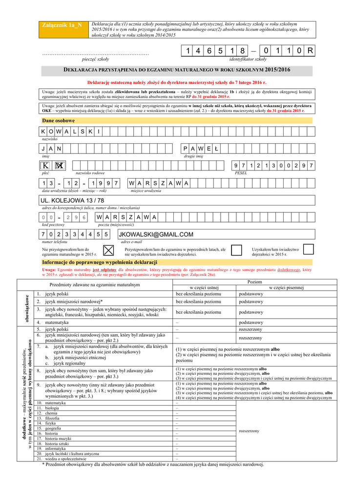 Deklaracja dla:(1) ucznia szkoły ponadgimnazjalnej lub artystycznej, który ukończy szkołę w roku szkolnym 2015/2016 i w tym roku przystąpi do egzaminu maturalnego oraz(2) absolwenta liceum ogólnokształcącego, który ukończył szkołę w roku szkolnym 2014/2015 Załącznik 1a_N 1 4 6 5 1 8 …………………………………………………… pieczęć szkoły – 0 1 1 0 R identyfikator szkoły DEKLARACJA PRZYSTĄPIENIA DO EGZAMINU MATURALNEGO W ROKU SZKOLNYM 2015/2016 Deklarację ostateczną należy złożyć do dyrektora macierzystej szkoły do 7 lutego 2016 r. Uwaga: jeżeli macierzysta szkoła została zlikwidowana lub przekształcona – należy wypełnić deklarację 1b i złożyć ją do dyrektora okręgowej komisji egzaminacyjnej właściwej ze względu na miejsce zamieszkania absolwenta na terenie RP do 31 grudnia 2015 r. Uwaga: jeżeli absolwent zamierza ubiegać się o możliwość przystąpienia do egzaminu w innej szkole niż szkoła, którą ukończył, wskazanej przez dyrektora OKE – wypełnia niniejszą deklarację (1a) i składa ją – wraz z wnioskiem i uzasadnieniem (zał. 2.) – do dyrektora macierzystej szkoły do 31 grudnia 2015 r. Dane osobowe K O W A L S K I nazwisko J A N P A W E Ł imię drugie imię K M 9 7 1 2 1 3 0 0 2 9 7 płeć nazwisko rodowe 1 3 - 1 2 - 1 9 9 7 data urodzenia (dzień – miesiąc – rok) PESEL W A R S Z A W A miejsce urodzenia UL. KOLEJOWA 13 / 78 adres do korespondencji (ulica, numer domu / mieszkania) 0 0 - 2 9 6 W A R S Z A W A kod pocztowy poczta (miejscowość) 7 0 2 3 3 4 4 5 5 numer telefonu Nie przystępowałem/łam do egzaminu maturalnego w 2015 r. [email protected] adres e-mail Przystępowałem/łam do egzaminu w poprzednich latach, ale nie uzyskałem/łam świadectwa dojrzałości. Uzyskałem/łam świadectwo dojrzałości w 2015 r. Informacje do poprawnego wypełnienia deklaracji Uwaga: Egzamin maturalny jest odpłatny dla absolwentów, którzy przystępują do egzaminu maturalnego z tego samego przedmiotu dodatkowego, który w 2015 r. zgłaszali w deklaracji, ale nie przystąpili do egzaminu z tego przedmiotu (por. Załącznik 26a). dodatkowe – maksymalnie sześć przedmiotów, w tym jeden w części pisemnej wybrany obowiązkowo obowiązkowe Przedmioty zdawane na egzaminie maturalnym Poziom 1. język polski w części ustnej bez określania poziomu 2. język mniejszości narodowej* bez określania poziomu podstawowy 3. język obcy nowożytny – jeden wybrany spośród następujących: angielski, francuski, hiszpański, niemiecki, rosyjski, włoski bez określania poziomu podstawowy 4. 5. 6. matematyka język polski język mniejszości narodowej (ten sam, który był zdawany jako przedmiot obowiązkowy – por. pkt 2.) a. język mniejszości narodowej (dla absolwentów, dla których egzamin z tego języka nie jest obowiązkowy) b. język mniejszości etnicznej c. język regionalny – – podstawowy rozszerzony – rozszerzony 8. język obcy nowożytny (ten sam, który był zdawany jako przedmiot obowiązkowy – por. pkt 3.) 9. język obcy nowożytny (inny niż zdawany jako przedmiot obowiązkowy – por. pkt. 3. i 8.; wybrany spośród języków wymienionych w pkt. 3.) 10. 11. 12. 13. 14. 15. 16. 17. 18. 19. 20. 21. matematyka biologia chemia filozofia fizyka geografia historia historia muzyki historia sztuki informatyka język łaciński i kultura antyczna wiedza o społeczeństwie (1) w części pisemnej na poziomie rozszerzonym albo (2) w części pisemnej na poziomie dwujęzycznym, albo (3) w części pisemnej na poziomie dwujęzycznym i części ustnej na poziomie dwujęzycznym (1) w części pisemnej na poziomie rozszerzonym albo (2) w części pisemnej na poziomie dwujęzycznym, albo (3) w części pisemnej na poziomie rozszerzonym i części ustnej bez określania poziomu, albo (4) w części pisemnej na poziomie dwujęzycznym i części ustnej na poziomie dwujęzycznym – – – – – – rozszerzony – – – – – – 7. w części pisemnej podstawowy (1) w części pisemnej na poziomie rozszerzonym albo (2) w części pisemnej na poziomie rozszerzonym i w części ustnej bez określania poziomu * Przedmiot obowiązkowy dla absolwentów szkół lub oddziałów z nauczaniem języka danej mniejszości narodowej. Deklaracja dla:(1) ucznia szkoły ponadgimnazjalnej lub artystycznej, który ukończy szkołę w roku szkolnym 2015/2016 i w tym roku przystąpi do egzaminu maturalnego oraz(2) absolwenta liceum ogólnokształcącego, który ukończył szkołę w roku szkolnym 2014/2015 Załącznik 1a_N 1. Deklaruję przystąpienie do egzaminów obowiązkowych z następujących przedmiotów (wpisać znak X w odpowiednie kratki): w części pisemnej 1.1. język polski 1.2. język angielski język obcy nowożytny (jaki?) ………………………………………………… 1.3. matematyka 1.4. -------------------język mniejszości narodowej (jaki?) …………………………………………… w części ustnej 2. Deklaruję przystąpienie do egzaminów dodatkowych z następujących przedmiotów (zgodnie z tabelą na str. 1.): Wybór egzaminu dodatkowego z jednego przedmiotu w części pisemnej jest obowiązkowy dla absolwenta, który przystępuje do egzaminu po raz pierwszy oraz dla absolwenta, który w roku szkolnym 2014/2015 nie przystąpił do egzaminu dodatkowego z żadnego przedmiotu lub egzamin z jedynego wybranego przedmiotu dodatkowego został mu unieważniony. Przedmiot Część pisemna (wpisać: rozszerzony / dwujęzyczny) Cześć ustna (wpisać: bez określania poziomu / dwujęzyczny / nie przystępuję) 2.1. matematyka rozszerzony nie przystępuję 2.2. geografia rozszerzony nie przystępuję 2.3. język francuski rozszerzony nie przystępuję 2.4. -------------------- ------------------------------- -------------------------------- 2.5. -------------------- ------------------------------- -------------------------------- 2.6. -------------------- ---------------------