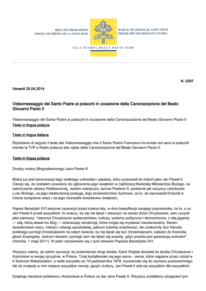 N. 0297 Venerdì 25.04.2014 Videomessaggio del Santo Padre ai polacchi in occasione della Canonizzazione del Beato Giovanni Paolo II Videomessaggio del Santo Padre ai polacchi in occasione della Canonizzazione del Beato Giovanni Paolo II Testo in lingua polacca Testo in lingua italiana Riportiamo di seguito il testo del Videomessaggio che il Santo Padre Francesco ha inviato ieri sera ai polacchi tramite la TVP e Radio polacca alla vigilia della Canonizzazione del Beato Giovanni Paolo II: Testo in lingua polacca Drodzy rodacy Błogosławionego Jana Pawła II! Bliska już jest kanonizacja tego wielkiego człowieka i papieża, który przeszedł do historii jako Jan Paweł II. Cieszę się, że zostałem powołany do ogłoszenia jego świętości w najbliższą Niedzielę Miłosierdzia Bożego, na zakończenie oktawy Wielkanocnej. Jestem wdzięczny Janowi Pawłowi II, podobnie jak wszyscy członkowie Ludu Bożego, za jego niestrudzoną posługę, jego przewodnictwo duchowe, za to, że wprowadził Kościół w trzecie tysiąclecie wiary i za jego niezwykłe świadectwo świętości. Papież Benedykt XVI słusznie zauważył przed trzema laty, w dniu beatyfikacji swojego poprzednika, że to, o co Jan Paweł II prosił wszystkich, to znaczy, by się nie lękać i otworzyć na oścież drzwi Chrystusowi, sam uczynił jako pierwszy: "otworzył Chrystusowi społeczeństwo, kulturę, systemy polityczne i ekonomiczne, z siłą giganta — siłą, którą dawał mu Bóg — odwracając tendencję, która mogła się wydawać nieodwracalna. Swoim świadectwem wiary, miłości i odwagi apostolskiej, pełnym ludzkiej wrażliwości, ten znakomity Syn Narodu polskiego pomógł chrześcijanom na całym świecie, by nie lękali się być chrześcijanami, należeć do Kościoła, głosić Ewangelię. Jednym słowem: pomógł nam nie lękać się prawdy, gdyż prawda jest gwarancją wolności" (Homilia, 1 maja 2011). W pełni utożsamiam się z tymi słowami Papieża Benedykta XVI. Wszyscy wiemy, że zanim wyruszył, by przemierzać drogi świata, Karol Wojtyła dorastał do służby Chrystusowi i Kościołowi w swojej ojczyźnie, w Polsce. Tutaj kształtowało się jego serce – serce, które najpierw przez udział w II Soborze Watykańskim, a nade wszystko po 16 października 1978, rozszerzało się do wymiaru powszechnego, tak że znalazły w nim miejsce wszystkie narody, języki i kultury. Jan Paweł II stał się wszystkim dla wszystkich. Dziękuję narodowi polskiemu i Kościołowi w Polsce za dar Jana Pawła II. Wszyscy zostaliśmy ubogaceni tym 2 darem. Jan Paweł II nadal nas inspiruje. Natchnieniem są dla nas jego słowa, pisma, jego gesty, jego styl posługi. Inspiruje nas jego cierpienie przeżywane z heroiczną nadzieją. Inspiruje nas jego całkowite powierzenie się Chrystusowi, Odkupicielowi człowieka i Matce Bożej. Podczas niedawnej wizyty ad limina Apostolorum biskupów polskich, zwróciłem uwagę, że Kościół w Polsce ma nadal ogromny potencjał wiary, modlitwy, miłosierdzia i praktyki chrześcijańskiej. Podkreśliłem także wyzwania duszpasterskie, takie jak rodzina, młodzież, ubodzy oraz powołania do kapłaństwa i życia konsekrowanego. Mam nadzieję, że kanonizacja Jana Pawła II a także Jana XXIII nadadzą nowy impuls codziennej i wytrwałej pracy Kościoła w waszej ojczyźnie. Cieszę się, że – jeśli Bóg pozwoli – za dwa lata odwiedzę po raz pierwszy wasz kraj z okazji Światowego Dnia Młodzieży. Zachęcam wszystkich do głębokiego przeżycia kanonizacji błogosławionego Jana Pawła II i błogosławionego Jana XXIII. Niektórzy z was przybędą do Rzymu, ale także dzięki środkom przekazu wielu będzie mogło uczestniczyć w tym wspaniałym wydarzeniu. Dlatego pragnę już dzisiaj podziękować wszystkim dziennikarzom prasy, radia i telewizji za ich posługę podczas kanonizacji. Pozdrawiam wszystkich rodaków Jana Pawła II, także tych, którzy nie należą do Kościoła katolickiego. Wszystkich niosę w moim sercu. Niech Bóg błogosławi was wszystkich! [00652-09.01] [Testo originale: Polacco] Testo in lingua italiana Cari connazionali del Beato Giovanni Paolo II! E’ ormai vicina la canonizzazione di quel grande uomo e grande papa che è passato alla storia con il nome di Giovanni Paolo II. Sono felice di essere stato chiamato a proclamare la sua santità, nella prossima Domenica della Divina Misericordia, a conclusione dell’Ottava di Pasqua. Sono grato a Giovanni Paolo II, come tutti i membri del Popolo di Dio, per il suo instancabile servizio, la sua guida spirituale, per aver introdotto la Chiesa nel terzo millennio della fede e per la sua straordinaria testimonianza di santità. Papa Benedetto XVI ha notato giustamente, tre anni fa, nel giorno della beatificazione del suo Predecessore, che quello che Giovanni Paolo II chiedeva a tutti, cioè di non avere paura e di spalancare le porte a Cristo, egli stesso lo ha fatto per primo: «Ha aperto a Cristo la società, la cultura, i sistemi politici ed economici, invertendo con la forza di un gigante – forza che gli veniva da Dio – una tendenza che poteva sembrare irreversibile. Con la sua testimonianza di fede, di amore e di coraggio apostolico, accompagnata da una grande carica umana, questo esemplare figlio della Nazione polacca ha aiutato i cristiani di tutto il mondo a non avere paura di dirsi cristiani, di appartenere alla Chiesa, di parlare del Vangelo. In una parola: ci ha aiutato a non avere paura della verità, perché la verità è garanzia della libertà» (Omelia, 1 maggio 2011). Mi identifico pienamente con queste parole del Papa Benedetto XVI. Sappiamo tutti che, prima di percorrere le strade del mondo, Karol Wojtyła è cresciuto al servizio di Cristo e della Chiesa nella sua patria, la Polonia. Lì si è formato il suo cuore, cuore che poi si è dilatato alla dimensione universale, prima partecipando al Concilio Vaticano II, e soprattutto dopo il 16 ottobre del 1978, perché in