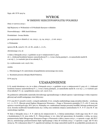 Sygn. akt: II W 424/14 WYROK W IMIENIU RZECZYPOSPOLITEJ POLSKIEJ Dnia 17 czerwca 2015 r. Sąd Rejonowy w Wołominie w II Wydziale Karnym w składzie: Przewodniczący – SSR Jacek Kulesza Protokolant - Iwona Morka po rozpoznaniu w dniach 27 .02. 2015 r,. 15. 04. 2015 r. , 17.06. 2015 r. w Wołominie sprawy S. B., syna K. i H. z d. M., urodz. (...) w S., obwinionego o to, że w dniu 2 listopada 2013 r. o godzinie 12:30 w miejscowości Z. przy ul. (...) dokonał kradzieży kamery samochodowej P. (...) wraz z kartą pamięci (...)z samochodu marki B. o nr rej. (...) o wartości 320 zł na szkodę P. P., tj. o wykroczenie z art. 119 § 1 kw; orzeka 1. Obwinionego S. B. uniewinnia od popełnienia zarzucanego mu czynu. 2. Kosztami procesu obciąża Skarb Państwa. II W 424/14 UZASADNIENIE S. B. został obwiniony o to, że w dniu 2 listopada 2013 r. o godzinie 12:30 w miejscowości Z. przy ul. (...) dokonał kradzieży kamery samochodowej P. (...) wraz z kartą pamięci(...)z samochodu marki B. o nr rej. (...) o wartości 320 zł na szkodę P. P., tj. o popełnienia czynu z art. 119 § 1 k.w. Na podstawie całokształtu materiału dowodowego zgromadzonego w aktach sprawy i ujawnionego w toku rozprawy głównej sąd ustalił następujący stan faktyczny: P. P. oraz M. P. zawarli w 2006 r. związek małżeński. Z ww. związku małżeńskiego mają oni jedno dziecko – urodzoną w (...) r. N. P.. Obecnie przed Sądem Okręgowym Warszawa – Praga w Warszawie pomiędzy P. P. a M. P. toczy się sprawa o rozwód pod sygn. III C 561/12. Pomiędzy ww. małżonkami istnieje poważny konflikt, którego podstawą jest m.in. kwestia możliwości kontaktowania się z córką oraz ustalenia miejsca zamieszkania N. P.. P. P. oraz M. P. nie zamieszkują wspólnie. W dniu 2 listopada 2013 r. P. P. udał się do miejscowości Z., w której zamieszkuje z kolei jego żona M. P. wraz z konkubentem S. B. oraz córka N. P.. Pokrzywdzony w ww. dniu był uprawniony do kontaktu z córką, na mocy postanowienia Sądu Okręgowego Warszawa-Praga w Warszawie z dnia 5 marca 2013 r., w sprawie o sygn. akt III C 561/12, zmienionego postanowieniem Sądu Apelacyjnego z dnia 18 września 2013 r. w sprawie o sygn. akt VI ACz 2005/13. We wskazanym dniu P. P. zaparkował należący do niego samochód marki B. na podjeździe posesji przy ul. (...) w miejscowości Z.. Następnie P. P. wysiadł z samochodu i zadzwonił za pomocą domofonu do ww. domu. Po chwili z budynku wyszedł obwiniony S. B. i udał się przed posesję. Po krótkiej wymianie zdań pomiędzy mężczyznami, P. P. użył wobec S. B. gazu łzawiącego. Następnie S. B. wrócił do budynku znajdującego się na wskazanej posesji, natomiast P. P. wsiadł do zaparkowanego przed posesją samochodu marki B.. Po chwili z ww. budynku ponownie wyszedł S. B. i podszedł do ogrodzenia posesji, nie wychodząc za nie, natomiast P. P. wysiadł z samochodu i również znalazł się przed bramą posesji, stojąc naprzeciw obwinionego. Pomiędzy mężczyznami doszło do wymiany zdań oraz wyzwisk, P. P. użył wobec S. B. gazu łzawiącego, a po chwili krzyczał m.in. „bandyto ty”, „bandyta ludzie, pomocy, bandyta, pomocy, bandyta”. Pomiędzy mężczyznami nadal trwała wymiana zdań. S. B. zbliżył się do ogrodzenia posesji i zasłaniając się jedną ręką, drugą ręką wykonał gwałtowny ruch w kierunku P. P.. Następnie P. P. próbował użyć wobec S. B. gazu łzawiącego. Po chwili P. P. wsiadł ponownie do samochodu i odjechał spod ww. posesji. Po kilkudziesięciu minutach do miejscowości Z. przyjechali funkcjonariusze policji, którzy uprzednio zostali poinformowani przez ww. mężczyznę o przedmiotowym zdarzeniu. Po poinformowaniu policjantów przez P. P. o zdarzeniu, podczas którego miało dojść do kradzieży z jego samochodu kamery rejestrującej obraz i odbyciu z nim rozmowy przez funkcjonariuszy policji, udali się oni do miejsca zamieszkania S. B.. Fragment ww. zdarzenia został zarejestrowany przez P. P. na nagraniu utrwalonym za pomocą telefonu komórkowego. Obwiniony S. B. w toku czynności wyjaśniających nie przyznał się do popełnienia zarzuconego mu czynu. Wskazał ponadto, iż zdarzenie, do jakiego doszło w dniu 2 listopada 2013 r., było rejestrowane przez P. P. za pomocą telefonu komórkowego. W toku rozprawy głównej obwiniony również nie przyznał się do popełnienia zarzuconego mu czynu oraz złożył wyjaśnienia. S. B. wyjaśnił, iż w dniu 2 listopada 2013 r. P. P. przyjechał samochodem do jego miejsca zamieszkania w miejscowości Z.. Ponadto, jak wskazał obwiniony, P. P. dzwonił domofonem do ww. domu, po czym obwiniony wyszedł przed posesję i powiedział ww. mężczyźnie, by ten nie nagrywał go telefonem komórkowym, ponieważ nie życzy sobie tego. Następnie, jak oświadczył obwiniony, P. P. najpierw stanął w pozycji bokserskiej, usiłując sprowokować obwinionego, a następnie pokrzywdzony użył gazu łzawiącego wobec S. B.. P. P. biegł za S. B., jednocześnie wpadając w rozpylony gaz łzawiący. Ponadto, jak wynika z relacji obwinionego, P. P. krzyczał wówczas: „biją, mordują”. Następnie obwiniony udał się do domu, aby obmyć twarz, po czym ponownie wyszedł z budynku, zaś pokrzywdzony wysiadł ze swojego samochodu, trzymając w rękach telefon komórkowy oraz gaz łzawiący, a ponadto bardzo głośno krzyczał. S. B. wskazał również, iż ww. zdarzenie obserwowała świadek M. P.. Ponadto obwiniony wskazał na sytuację osobistą oraz rodzinną M. P. oraz P. P.. Wskazał on, iż pomiędzy nim oraz M. P. a P. P. istnieje konflikt, którego podstawą jest m.in. kwestia możliwości kontaktu ww. osób z córką – N. P.. Analizując wyjaśnienia obwinionego S. B. należy zauważyć, że z racji swej roli procesowej, miał on interes w składaniu wyjaśnień dla siebie korzystnych. Jednakże w przekonaniu sądu całokształt materiału dowodowego zgromadzonego w niniejszej sprawie nie pozwal