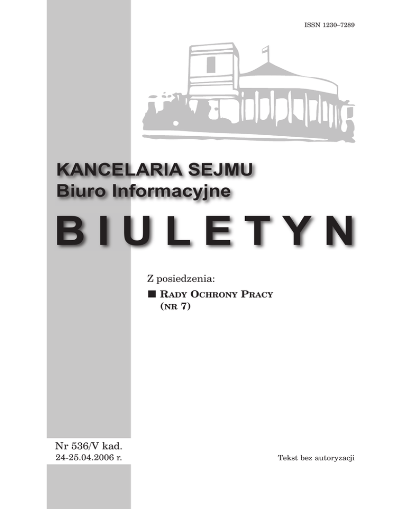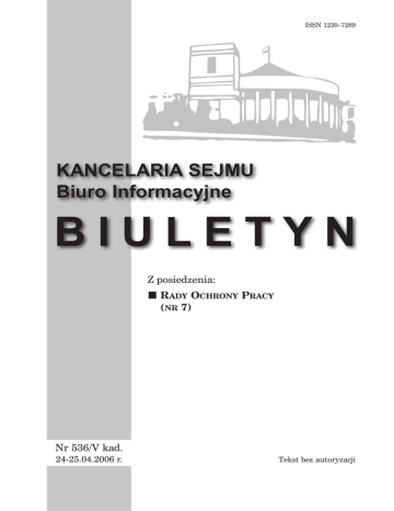 ISSN 1230–7289 KANCELARIA SEJMU Biuro Informacyjne BIULETYN Z posiedzenia: RADY OCHRONY PRACY (NR 7) Nr 536/V kad. 24-25.04.2006 r. Tekst bez autoryzacji Wydawca – Biuro Informacyjne Kancelarii Sejmu Skład komputerowy: Monika Głogowska Druk: Wydawnictwo Sejmowe – Wydział Poligrafii Oddano do druku – 20.06.2006 r. TEKST BEZ AUTORYZACJI Nr 536/V kad. Rada Ochrony Pracy (nr 7) 24-25 kwietnia 2006 r. Rada Ochrony Pracy, obradująca, pod przewodnictwem Stanisława Szweda, na uroczystym, wyjazdowym posiedzeniu w Ośrodku Szkolenia Państwowej Inspekcji Pracy we Wrocławiu, poświęconym obchodom Dnia Bezpieczeństwa i Ochrony Zdrowia w Pracy, zrealizowała następujący porządek dzienny: – przyjęcie projektów stanowisk Rady Ochrony Pracy w sprawach: – wykonywania przez pracodawców orzeczeń sądów pracy, – realizacji II etapu programu wieloletniego pn. Dostosowywanie warunków pracy w Polsce do standardów Unii Europejskiej w 2005 r.; – obchody „Światowego Dnia Pamięci Ofiar Wypadków przy Pracy. Nadzór społeczny a bezpieczne miejsca pracy – organizator NSZZ „Solidarność”; – wręczenie honorowej odznaki Za zasługi dla ochrony pracy; – wystąpienia okolicznościowe: – przewodniczącego Rady Ochrony Pracy, – marszałka Sejmiku Dolnośląskiego, – wojewody dolnośląskiego; – wysłuchanie referatów przedstawicieli: – Komisji Krajowej NSZZ „Solidarność”, – głównego inspektora pracy, – Instytutu Medycyny Pracy im. prof. J. Nofera z Łodzi; – dyskusja panelowa; – seminarium „Promocja standardów bezpieczeństwa pracy w budownictwie”; – bezpieczeństwo pracy w budownictwie w krajach Unii Europejskiej – geneza europejskiej kampanii prewencyjnej; – prezentacja raportu z realizacji projektu Promocja standardów bezpieczeństwa pracy w budownictwie; – dyskusja panelowa; – prezentacja wyników programu prewencyjnego dla małych zakładów budowlanych; – dobór i wykorzystanie narzędzi komunikacji społecznej w realizacji kampanii. Prezentacja doświadczeń zespołu zarządzającego projektem; – wykorzystanie metod samokontroli w podnoszeniu standardów bezpieczeństwa pracy w firmie budowlanej – studium przypadku; 3 NR 536/V KAD. RADA OCHRONY PRACY 24-25.04.2006 – rola związków zawodowych w promocji dobrych praktyk i standardów bezpiecznej pracy; – Prezentacja doświadczeń Okręgowego Inspektoratu Pracy w realizacji projektu Promocja standardów bezpieczeństwa pracy w budownictwie; – prezentacja efektów kampanii w budownictwie prowadzonej przez litewską inspekcję pracy; – prezentacja działań podejmowanych w związku z prowadzoną kampanią w budownictwie przez czeską inspekcję pracy; – Prezentacja efektów kampanii w budownictwie prowadzonej przez łotewską inspekcję pracy; – działania na rzecz poprawy bezpieczeństwa pracy i ochrony zdrowia w budownictwie w Bułgarii; – projekt Budować bezpiecznie ponad granicami – prezentacja doświadczeń Landu Brandenburgii; – prezentacja doświadczeń Okręgowego Inspektoratu Pracy w realizacji projektu Promocja standardów bezpieczeństwa pracy w budownictwie – materiały okręgowych inspektoratów pracy: Katowice, Łódź, Poznań, Warszawa; – podsumowanie i zakończenie seminarium i obrad Rady Ochrony Pracy. W posiedzeniu udział wzięli przedstawiciele: Państwowej Inspekcji Pracy z głównym inspektorem pracy Bożeną Borys-Szopą, Państwowej Wyższej Szkoły Zawodowej w Suwałkach z rektorem Michałem Bołtrykiem, firmy DELTA Technika Grzewcza – Bolesławiec z właścicielem Wiesławem Burłakiem, Głównej Inspekcji Pracy Bułgarii z sekretarzem Dimitarem Dimitrovem, Wyższego Urzędu Górniczego z prezesem Wojciechem Bradeckim, Urzędu Krajowego do spraw Ochrony Pracy Landu Brandenburgii, Zarządu Regionu Dolnośląskiego NSZZ „Solidarność” z zastępcą przewodniczącego Kazimierzem Kimso, BOT Kopalni Węgla Brunatnego Turów SA z prezesem zarządu Stanisławem Żubrem, Międzynarodowej Organizacji Pracy, Forum Związków Zawodowych, Związku Zawodowego „Budowlani”, Stowarzyszenia Pracowników Służby BHP, Budownictwa i Przemysłu Drzewnego NSZZ „Solidarność”, Okręgowego Inspektoratu Pracy w Ostrawie, Dolnośląskiej OPZZ z wiceprzewodniczącym Antonim Karasińskim, Ośrodka Szkolenia PIP we Wrocławiu z dyrektor Grażyną Panek, Łotewskiej Inspekcji Pracy, Wojewódzkiego Urzędu Pracy oraz główny inspektor transportu drogowego Seweryn Kaczmarek, wojewódzki inspektor nadzoru budowlanego Matylda Miller i główny państwowy inspektor pracy Litwy Mindaugas Pluktas. Przewodniczący Rady Ochrony Pracy Stanisław Szwed: Bardzo serdecznie witam wszystkich zgromadzonych. Projekt porządku dziennego został państwu doręczony. Czy ktoś z państwa ma uwagi? Nie słyszę. Stwierdzam, że Rada przyjęła projekt porządku dziennego. Nasze posiedzenie wyjazdowe jest szczególnie związane z obchodami Dnia Pamięci Ofiar Wypadków przy Pracy. Będziemy uczestnikami seminarium, dyskusji oraz wysłuchamy wielu ciekawych referatów. Zanim przejdziemy do realizacji porządku dziennego, to chcę w imieniu marszałka Sejmu wręczyć nominacje na członków Rady Ochrony Pracy dla pana Piotra Dudy, który jest przedstawicielem NSZZ „Solidarność” i zastąpi panią minister Bożenę Borys-Szopę w Radzie. 4 NR 536/V KAD. RADA OCHRONY PRACY 24-25.04.2006 Członek Rady Ochrony Pracy Piotr Duda: Bardzo się cieszę, że zostałem członkiem tak szacownego grona, choć trudno mi będzie, a właściwie jest to niemożliwe, zastąpić tak dobrze merytorycznie przygotowaną osobę jak pani minister Bożena Borys-Szopa. Postaram się swoją pracą wnieść nowe treści w prace Rady. Dziękuję bardzo za miłe przyjęcie. Przewodniczący Rady Ochrony Pracy Stanisław Szwed: Uzupełnię, że pan Piotr Duda pełni jednocześnie funkcję przewodniczącego śląsko-dąbrowskiej ”Solidarności”, największego regionu związkowego w 