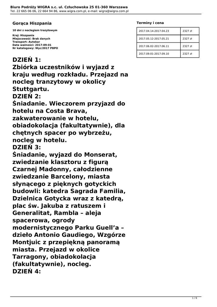 Biuro Podróży WIGRA s.c. ul. Człuchowska 25 01-360 Warszawa Tel. 22 665 06 06, 22 664 94 86, www.wigra.com.pl, e-mail: [email protected] Gorąca Hiszpania 10 dni z noclegiem trazytowym Kraj: Hiszpania Miejscowość: Brak danych Transport: Autokar Data ważności: 2017-09-01 Nr katalogowy: Wyc/2017 PBPO Terminy i cena 2017.04.14-2017.04.23 2327 zł 2017.05.12-2017.05.21 2327 zł 2017.06.02-2017.06.11 2327 zł 2017.09.01-2017.09.10 2327 zł DZIEŃ 1: Zbiórka uczestników i wyjazd z kraju według rozkładu. Przejazd na nocleg tranzytowy w okolicy Stuttgartu. DZIEŃ 2: Śniadanie. Wieczorem przyjazd do hotelu na Costa Brava, zakwaterowanie w hotelu, obiadokolacja (fakultatywnie), dla chętnych spacer po wybrzeżu, nocleg w hotelu. DZIEŃ 3: Śniadanie, wyjazd do Monserat, zwiedzanie klasztoru z figurą Czarnej Madonny, całodzienne zwiedzanie Barcelony, miasta słynącego z pięknych gotyckich budowli: katedra Sagrada Familia, Dzielnica Gotycka wraz z katedrą, plac św. Jakuba z ratuszem i Generalitat, Rambla – aleja spacerowa, ogrody modernistycznego Parku Guell’a – dzieło Antonio Gaudiego, Wzgórze Montjuic z przepiękną panoramą miasta. Przejazd w okolice Tarragony, obiadokolacja (fakultatywnie), nocleg. DZIEŃ 4: 1/6 Biuro Podróży WIGRA s.c. ul. Człuchowska 25 01-360 Warszawa Tel. 22 665 06 06, 22 664 94 86, www.wigra.com.pl, e-mail: [email protected] Śniadanie, zwiedzanie Tarragony: Mur Cyklopów, Balkon Europy, katedra. Przejazd do Walencji. Zwiedzanie katedry ze skarbcem św. Gralla, Kaplica Królewska, secesyjne budynki giełdy, hali targowej, dworca, Plac Ratuszowy. Spacer i wypoczynek na Wybrzeżu Kwiatu Pomarańczy, obiadokolacja (fakultatywnie), nocleg w hotelu. DZIEŃ 5: Śniadanie, wyjazd do dzielnicy Troglodytów Guadix, przejad do Granady, wieczór flamenco (fakultatywnie), spacer po arabskiej dzielnicy Albaycin, obiadokolacja (fakultatywnie), nocleg. DZIEŃ 6: Śniadanie, zwiedzanie Granady położonej u podnórzy Sierra Nevada: katedra z Kaplicą Królewską, budowle Maurów – Alhambra, najsłynniejsze zabytki mauretańskie w Europie, rezydencja arabskich władców Grenady.Przejazd do Sewilli, zwiedzanie katedry z grobowcem Kolumba, La Giralda – minaret i Santa Cruz z dzielnicą żydowską. Obiadokolacja (fakultatywnie), nocleg w hotelu w okolicy Toledo. DZIEŃ 7: Śniadanie, zwiedzanie Toledo: katedra i kościół San Tome z arcydziełem El Greco „Pogrzeb hrabiego Orgaza” Przejazd do 2/6 Biuro Podróży WIGRA s.c. ul. Człuchowska 25 01-360 Warszawa Tel. 22 665 06 06, 22 664 94 86, www.wigra.com.pl, e-mail: [email protected] Madrytu: Palacio Real - rezydencja królewska, Plac Hiszpański z pomnikiem Don Kichota i Sancho Pansy, Paseo del Prado – zielona promenada z przepięknymi fontannami, muzeum Prado, Puerta del Sol - centralny plac miasta, obiadokolacja (fakultatywnie), przejazd do hotelu, nocleg. DZIEŃ 8: Śniadanie, przejazd do Saragossy, zwiedzanie: bazylika Nuestra Senora del Pilar, kościół La Magdalena z najpiękniejszą wieżą w Saragossie. Przejazd w okolicę Lyonu, obiadokolacja (fakultatywnie), nocleg. DZIEŃ 9: Śniadanie, wyjazd w kierunku Polski, nocny przejazd przez Niemcy. DZIEŃ 10: Przyjazd do Polski, powrót do poszczególnych miejscowości. ZAREZERWUJ JUŻ DZIŚ, TEL. 22 665 06 06, 22 664 94 86 DOPŁATY OPCJONALNE: Dopłata do pokoju 1 – os.: 790 zł Dopłata do 8 obiadokolacji (bez napojów): 480 zł CENA IMPREZY OBEJMUJE: - przejazd autokarem (klimatyzacja, dvd, barek, wc) 3/6 Biuro Podróży WIGRA s.c. ul. Człuchowska 25 01-360 Warszawa Tel. 22 665 06 06, 22 664 94 86, www.wigra.com.pl, e-mail: [email protected] - 9 noclegów w hotelach**/*** w pokojach 2 – osobowych z łazienkami - 9 śniadań w formie bufetu - program turystyczny - opiekę pilota - ubezpieczenie Signal Iduna (KL 10.000 EUR, NNW 15.000 PLN, bagaż 1.000 PLN) DODATKOWO PŁATNE: - pakiet do realizacji programu: 110 EUR (rezerwacje i wstępy do zwiedzanych obiektów, usługi przewodnickie, udział w wieczorze flamenco, zestaw słuchawkowy Tour Guide) płatny obligatoryjnie pilotowi wycieczki. WAŻNE INFORMACJE: 1.Wycieczki będą realizowane w zależności od ilości uczestników w grupie: wygodnymi autokarami lub wygodnymi busami. 2.Niektóre połączenia krajowe mogą być realizowane innymi środkami transportu niż autokar (bus, samochód osobowy, autokar liniowy, pociąg). Trasy antenowe obsługiwane są bez pilota. 3.Wyjazd *antenkowy za dopłatą z wybranego miasta organizowany przy minimum 6 os. wsiadających. W przypadku braku wymaganego min. 6 osób PBP OLSZTYN ma prawo anulować wyjazd z danej 4/6 Biuro Podróży WIGRA s.c. ul. Człuchowska 25 01-360 Warszawa Tel. 22 665 06 06, 22 664 94 86, www.wigra.com.pl, e-mail: [email protected] miejscowości. Anulacja wyjazdu nie upoważnia do bezkosztowej rezygnacji z wycieczki. W takim przypadku Klient wybiera wyjazd z innej miejscowości gwarantowanej. 4.Podczas przejazdów krajowych w ramach niektórych wycieczek możliwe są przesiadki. 5.Godziny i miejsca wsiadania mogą ulec zmianie, po wcześniejszym poinformowaniu Klienta. 6.Pakiet do realizacji programu (rezerwacje i wstępy do zwiedzanych obiektów, usługi przewodnickie, bilety komunikacji miejskiej, opłaty klimatyczne oraz koszty zestawu słuchawkowego Tour Guide lub inne) nie jest ujęty w cenie imprezy wyrażonej w PLN. Cena pakietu do realizacji programu podana jest przy opisach poszczególnych wycieczek. Obligatoryjny koszt pakietu dotyczący realizacji programu jest kalkulowany przy grupie min. 40 osób. Przy mniejszej ilości uczestników cena pakietu zostanie przeliczona na odpowiednią ilość osób w grupie i podana do wiadomości uczestników przed wycieczką. Cena pakietu może być podwyższona maksymalnie o 25% podanej ceny w EUR/GBP/inna waluta. Powyższa zmiana nie upoważnia Klienta do rezygnacji z uczestnictwa w wycieczce. 5/6 Biuro Podróży WIGRA s.c. ul. Człuchowska 25 01-360 Warszawa Tel. 22 665 06 06, 22 664 9