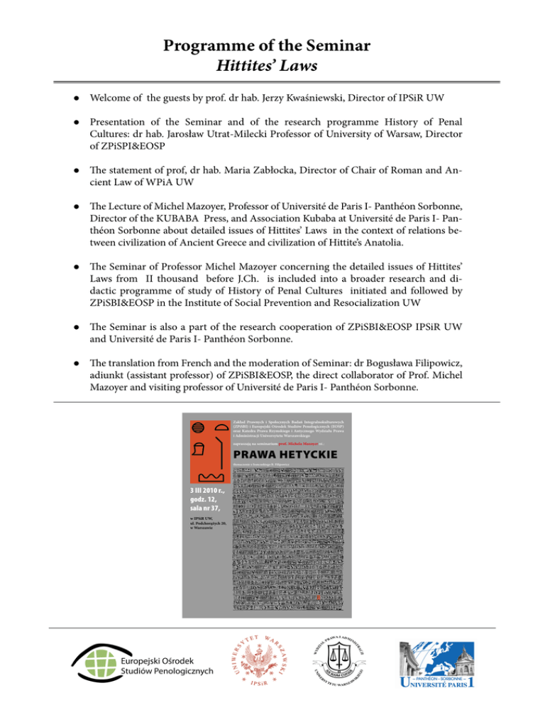 Programme of the Seminar Hittites’ Laws Welcome of the guests by prof. dr hab. Jerzy Kwaśniewski, Director of IPSiR UW Presentation of the Seminar and of the research programme History of Penal Cultures: dr hab. Jarosław Utrat-Milecki Professor of University of Warsaw, Director of ZPiSPI&EOSP The statement of prof, dr hab. Maria Zabłocka, Director of Chair of Roman and Ancient Law of WPiA UW The Lecture of Michel Mazoyer, Professor of Université de Paris I- Panthéon Sorbonne, Director of the KUBABA Press, and Association Kubaba at Université de Paris I- Panthéon Sorbonne about detailed issues of Hittites’ Laws in the context of relations between civilization of Ancient Greece and civilization of Hittite’s Anatolia. The Seminar of Professor Michel Mazoyer concerning the detailed issues of Hittites’ Laws from II thousand before J.Ch. is included into a broader research and didactic programme of study of History of Penal Cultures initiated and followed by ZPiSBI&EOSP in the Institute of Social Prevention and Resocialization UW The Seminar is also a part of the research cooperation of ZPiSBI&EOSP IPSiR UW and Université de Paris I- Panthéon Sorbonne. The translation from French and the moderation of Seminar: dr Bogusława Filipowicz, adiunkt (assistant professor) of ZPiSBI&EOSP, the direct collaborator of Prof. Michel Mazoyer and visiting professor of Université de Paris I- Panthéon Sorbonne. Zakład Prawnych i Społecznych Badań Integralnokulturowych (ZPiSBI) i Europejski Ośrodek Studiów Penologicznych (EOSP) oraz Katedra Prawa Rzymskiego i Antycznego Wydziału Prawa i Administracji Uniwersytetu Warszawskiego zapraszają na seminarium prof. Michela Mazoyer nt.: Prawa hetyckie tłumaczenie z francuskiego B. Filipowicz 3 III 2010 r., godz. 12, sala nr 37, w IPSiR UW, ul. Podchorążych 20, w Warszawie