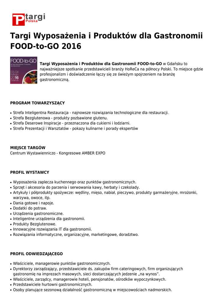 Targi Wyposażenia i Produktów dla Gastronomii FOOD-to-GO 2016 Targi Wyposażenia i Produktów dla Gastronomii FOOD-to-GO w Gdańsku to najważniejsze spotkanie przedstawicieli branży HoReCa na północy Polski. To miejsce gdzie profesjonalizm i doświadczenie łączy się ze świeżym spojrzeniem na branżę gastronomiczną. PROGRAM TOWARZYSZĄCY ● ● ● ● Strefa Inteligentna Restauracja - najnowsze rozwiązania technologiczne dla restauracji. Strefa Bezglutenowa - produkty pozbawione glutenu. Strefa Deserowe Inspiracje - przeznaczona dla cukierni i lodziarni. Strefa Prezentacji i Warsztatów - pokazy kulinarne i porady ekspertów MIEJSCE TARGÓW Centrum Wystawienniczo - Kongresowe AMBER EXPO PROFIL WYSTAWCY ● ● ● ● ● ● ● ● ● ● Wyposażenia zaplecza kuchennego oraz punktów gastronomicznych. Sprzęt i akcesoria do parzenia i serwowania kawy, herbaty i czekolady. Artykuły i półprodukty spożywcze: wędliny, mięso, nabiał, pieczywo, produkty garmażeryjne, mrożonki, warzywa, owoce, itp. Dania gotowe i napoje. Dodatki do potraw. Urządzenia gastronomiczne. Inteligentne urządzenia dla gastronomii. Produkty Bezglutenowe. Innowacyjne rozwiązania IT dla gastronomii. Rozwiązania informatyczne, organizacyjne, marketingowe, doradztwo. PROFIL ODWIEDZAJĄCEGO ● ● ● ● ● Właściciele, managerowie punktów gastronomicznych. Dyrektorzy zarządzający, przedstawiciele ds. zakupów firm cateringowych, firm organizujących gastronomię na imprezach masowych, sieci dostarczających jedzenie „na wynos”. Właściciele, zarządcy, managerowie hoteli, pensjonatów, ośrodków wypoczynkowych. Przedstawiciele hurtowni gastronomicznych. Osoby planujące sezonową działalność gastronomiczną w miejscowościach nadmorskich. Miejsce targów Gdańsk Żaglowa 11 Organizator Targi w Krakowie Kraków Galicyjska 9 12 644 59 32 www.targi.krakow.pl [email protected]