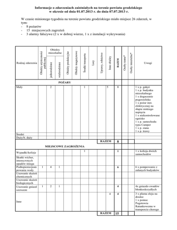 Informacje o zdarzeniach zaistniałych na terenie powiatu grodziskiego w okresie od dnia 01.07.2013 r. do dnia 07.07.2013 r. Osoby śmiertelne* Osoby ranne* RAZEM Inne obiekty Uprawy, rolnictwo Lasy Środki transportu Obiekty magazynowe Obiekty produkcyjne wielorodzinne Obiekty mieszkalne jednorodzinne Rodzaj zdarzenia Obiekty użyteczności publicznej W czasie minionego tygodnia na terenie powiatu grodziskiego miało miejsce 26 zdarzeń, w tym: - 8 pożarów - 15 miejscowych zagrożeń - 3 alarmy fałszywe (2 x w dobrej wierze, 1 x z instalacji wykrywania) Uwagi POŻARY Mały 2 1 5 8 1 x p. gałęzi 1 x p. budynku mieszkalnego 1 x dogaszanie pogorzeliska 1 x pożar inst. elektrycznej na słupie niskiego napięcia 1 x niekontrolowane ognisko 1 x p. samochodu typu Camper 1 x p. siana 1 x p. trawy Średni Duży/b. duży RAZEM 8 MIEJSCOWE ZAGROŻENIA 1 Wypadki/kolizje Skutki wichur, intensywnych opadów śniegu Podtopienia/pom powania wody Usuwanie skażeń chemicznych Usuwanie skażeń biologicznych Usuwanie gniazd szerszeni 1 1 x kolizja dwóch samochodów 1 4 1 6 6 x pompowanie z zalanych budynków 1 2 1 4 4x gniazdo owadów błonkoskrzydłych 4 4 3 x plama oleju na drodze 1 x pomoc Pogotowiu Ratunkowemu w transporcie chorego RAZEM 15 Inne