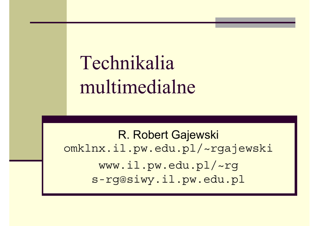 Technikalia multimedialne R. Robert Gajewski omklnx.il.pw.edu.pl/~rgajewski www.il.pw.edu.pl/~rg [email protected] Historyczne alternatywy ! Folie i rzutnik ! Slajdy ! duży nakład pracy, przy przygotowywaniu ! Monitor o dużej przekątnej ekranu ! Duża waga i małe audytoria ! Panel ciekłokrystaliczny LCD i rzutnik ! 2 11 Wysoka jasność rzutnika – 4000 lumenów ©2004 R. Robert ‘RoG@j’ Gajewski Projektory multimedialne ! Projektor podłączony jest do źródła sygnału wizyjnego (komputer, magnetowid, odtwarzacz DVD). ! Wady i zalety 3 11 ! Przenośność ! ! Duże rozmiary obrazu ! ! Niższa jakość (rozdzielczość) " ©2004 R. Robert ‘RoG@j’ Gajewski Projektory LCD ! LCD – Liquid Cristal Display - wyświetlacz ciekłokrystaliczny, czyli... ! TFT Display – Thin Film Transistor Display – wyświetlacz ciekłokrystaliczny z wykorzystaniem tranzystorów cienkowarstwowych z aktywną matrycą – powszechnie wykorzystywany w komputerach przenośnych. 4 11 ©2004 R. Robert ‘RoG@j’ Gajewski TFT ! TFT - cienka folia z maleńkimi tranzystorami umieszczona między dwoma przezroczystymi warstwami. ! Pod wpływem napięcia przyłożonego do tranzystora zaczyna on świecić z dużą jasnością i kontrastem. ! Piksel logiczny składa się z trzech pikseli fizycznych – RGB. 5 11 ©2004 R. Robert ‘RoG@j’ Gajewski Pojedyncza matryca TFT • Matryca odpowiedzialna jest za stworzenie kompletnego obrazu. • Tworzone obrazy są stosunkowo ciemne A – lampa B – kondensor C – matryca TTF D – obiektyw 6 11 ©2004 R. Robert ‘RoG@j’ Gajewski Trzy matryce polisilikonowe ! Każda z matryc odpowiada za jeden z kolorów podstawowych RGB. ! Istnieją trzy niezależne wyświetlacze, po jednym dla każdego koloru. ! Światło rozszczepiane jest na trzy wiązki, które osobno przechodzą przez odpowiednie wyświetlacze. ! Następnie wiązki są łączone... 7 11 ©2004 R. Robert ‘RoG@j’ Gajewski Trzy matryce polisilikonowe 8 11 A – lampa B – zwierciadło półprzepuszczalne C – zwierciadło odbijające D, E, F – panele ciekłokrystaliczne G – obiektyw ©2004 R. Robert ‘RoG@j’ Gajewski Technologia DLP ! DLP – Digital Light Processing – technologia opracowana przez Texas Instruments. ! W projektorze specjalny układ przetwarza sygnał wizyjny z komputera lub magnetowidu na sygnał cyfrowy. ! Układ ten to DMD – Digital Micromirror Device. 9 11 ©2004 R. Robert ‘RoG@j’ Gajewski Układ DMD (1) ! Składa się z kilkuset tysięcy mikroskopijnych lusterek ! Lusterka w zależności od nachylenia mogą w różnym stopniu odbijać światło. ! Światło z żarówki metalowo-halidowej lub UHP przechodzi najpierw przez specjalny obrotowy filtr RGB, gdzie zabarwia się na jeden z podstawowych kolorów. 10 11 ©2004 R. Robert ‘RoG@j’ Gajewski Układ DMD (2) ! W tym czasie lusterka ustawiają się tak, że tworzą matrycę dla tego koloru. ! Po odbiciu się światło dociera do obiektywu a następnie na ekran. ! Ułamek sekundy później filtr przestawia się na kolejny kolor podstawowy. ! Mieszanie „warstw” następuje tak szybko, że oko nie rozpoznaje oszustwa warstw monochromatycznych. 11 11 ©2004 R. Robert ‘RoG@j’ Gajewski Pojedynczy układ DMD 12 11 ©2004 R. Robert ‘RoG@j’ Gajewski Projektory DLP ! Technika DLP pozwala uzyskać bardzo jasny i kontrastowy obraz, lepszy niż z projektorów LCD. ! Niektóre projektory wykorzystują trzy układy DMD odpowiedzialne za trzy kolory podstawowe RGB. 13 11 ©2004 R. Robert ‘RoG@j’ Gajewski Trzy układy DMD 14 11 ©2004 R. Robert ‘RoG@j’ Gajewski Projektory CRT ! Wyświetlają one obraz przy użyciu stanowiących rodzaj kineskopu lamp projekcyjnych CRT (Cathode Ray Tube). ! Każda z lamp niezależnie wyświetla obraz w jednym z trzech kolorów podstawowych. ! Obraz jest jasny i kontrastowy i teoretycznie o dowolnej rozdzielczości, ale urządzenie do projekcji waży kilkadziesiąt kilogramów. 15 11 ©2004 R. Robert ‘RoG@j’ Gajewski Parametry projektorów (1) ! Rozdzielczość VGA (640#480) ! SVGA (800#600) ! XGA (1024#768) ! SXGA (1280#1024) ! UXGA (1600#1200) ! 16 11 ©2004 R. Robert ‘RoG@j’ Gajewski Parametry projektorów (2) ! Rozszerzanie lub kompresja ! Siła światła – ANSI lumeny ! Rodzaj lampy ! Halogenowe (niska jasność, krótka żywotność, żółte światło) ! Metalowo-halidowe (2000 godzin i silne chłodzenie) ! UHP (żywotność 8000 godzin, słabsze chłodzenie) 17 11 ©2004 R. Robert ‘RoG@j’ Gajewski Monitory plazmowe ! Panele PDP (Plasma Display Panel). Między dwoma płytami znajduje się gaz ! Dolna płyta pokryta jest elektrodami i luminoforem jak w kineskopach ! Prąd powoduje przejście gazu w stan plazmy. ! Emitowane jest promieniowanie ultrafioletowe, które pobudza luminofor do świecenia. ! Przekątna 40”-60” ! 18 11 ©2004 R. Robert ‘RoG@j’ Gajewski Świecące ściany ! Połączenie 4, 9 lub 16 monitorów o przekątnej 28”-40”. ! Wyświetlacze z diod LCD Modularna budowa pozwalająca regulować rozdzielczość i wielkość. ! Ułatwienie wymiany uszkodzonych modułów. ! Wysoka cena. ! 19 11 ©2004 R. Robert ‘RoG@j’ Gajewski Microsoft Power Point ! Część pakietu MS Office. ! Niewielkie możliwości edycyjne ograniczone do warstwy slajdu. ! Plus to spora liczba szablonów i dobry kreator. ! Możliwość prezentacji w sieci lokalnej i eksport do formatu HTML (Internet) ! Dołączanie narracji dźwiękowej. 20 11 ©2004 R. Robert ‘RoG@j’ Gajewski Corel Presentations ! Część pakietu Corel Perfect Office. ! Zintegrowany edytor grafiki bitmapowej i wektorowej oraz symulacja 3-D. ! Brak możliwości synchronizacji animacji z dźwiękiem. ! Słaba opcja cofania operacji. ! Kompresja prezentacji do pliku *.exe. 21 11 ©2004 R. Robert ‘RoG@j’ Gajewski Lotus Freelance Graphics ! Część pakietu Lotus Smart Suite. ! Zintegrowane narzędzia pracy grupowej. ! Duży zestaw funkcji animacyjnych. ! Brak możliwości anulowania pojed