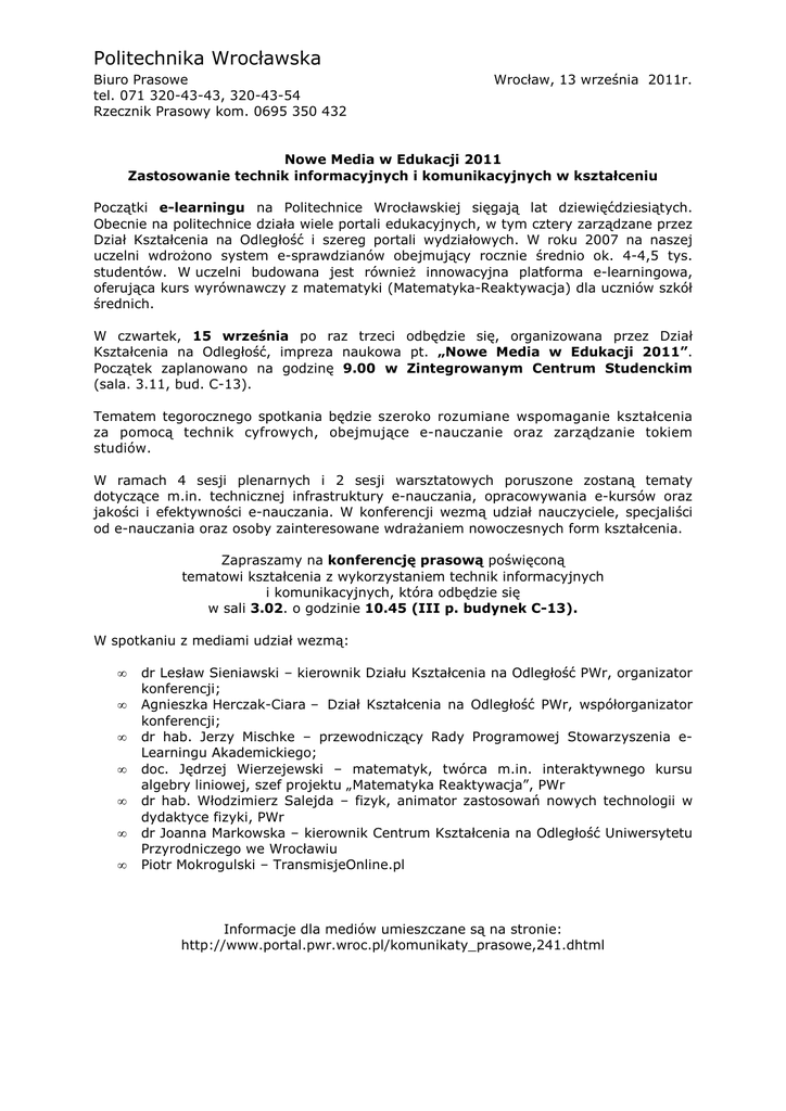 Politechnika Wrocławska Biuro Prasowe tel. 071 320-43-43, 320-43-54 Rzecznik Prasowy kom. 0695 350 432 Wrocław, 13 września 2011r. Nowe Media w Edukacji 2011 Zastosowanie technik informacyjnych i komunikacyjnych w kształceniu Początki e-learningu na Politechnice Wrocławskiej sięgają lat dziewięćdziesiątych. Obecnie na politechnice działa wiele portali edukacyjnych, w tym cztery zarządzane przez Dział Kształcenia na Odległość i szereg portali wydziałowych. W roku 2007 na naszej uczelni wdrożono system e-sprawdzianów obejmujący rocznie średnio ok. 4-4,5 tys. studentów. W uczelni budowana jest również innowacyjna platforma e-learningowa, oferująca kurs wyrównawczy z matematyki (Matematyka-Reaktywacja) dla uczniów szkół średnich. W czwartek, 15 września po raz trzeci odbędzie się, organizowana przez Dział Kształcenia na Odległość, impreza naukowa pt. „Nowe Media w Edukacji 2011”. Początek zaplanowano na godzinę 9.00 w Zintegrowanym Centrum Studenckim (sala. 3.11, bud. C-13). Tematem tegorocznego spotkania będzie szeroko rozumiane wspomaganie kształcenia za pomocą technik cyfrowych, obejmujące e-nauczanie oraz zarządzanie tokiem studiów. W ramach 4 sesji plenarnych i 2 sesji warsztatowych poruszone zostaną tematy dotyczące m.in. technicznej infrastruktury e-nauczania, opracowywania e-kursów oraz jakości i efektywności e-nauczania. W konferencji wezmą udział nauczyciele, specjaliści od e-nauczania oraz osoby zainteresowane wdrażaniem nowoczesnych form kształcenia. Zapraszamy na konferencję prasową poświęconą tematowi kształcenia z wykorzystaniem technik informacyjnych i komunikacyjnych, która odbędzie się w sali 3.02. o godzinie 10.45 (III p. budynek C-13). W spotkaniu z mediami udział wezmą: • • • • • • • dr Lesław Sieniawski – kierownik Działu Kształcenia na Odległość PWr, organizator konferencji; Agnieszka Herczak-Ciara – Dział Kształcenia na Odległość PWr, współorganizator konferencji; dr hab. Jerzy Mischke – przewodniczący Rady Programowej Stowarzyszenia eLearningu Akademickiego; doc. Jędrzej Wierzejewski – matematyk, twórca m.in. interaktywnego kursu algebry liniowej, szef projektu „Matematyka Reaktywacja”, PWr dr hab. Włodzimierz Salejda – fizyk, animator zastosowań nowych technologii w dydaktyce fizyki, PWr dr Joanna Markowska – kierownik Centrum Kształcenia na Odległość Uniwersytetu Przyrodniczego we Wrocławiu Piotr Mokrogulski – TransmisjeOnline.pl Informacje dla mediów umieszczane są na stronie: http://www.portal.pwr.wroc.pl/komunikaty_prasowe,241.dhtml