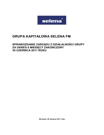 GRUPA KAPITAŁOWA SELENA FM SPRAWOZDANIE ZARZĄDU Z DZIAŁALNOŚCI GRUPY ZA OKRES 6 MIESIĘCY ZAKOŃCZONY 30 CZERWCA 2011 ROKU Wrocław, 26 sierpnia 2011 roku Grupa Kapitałowa Selena FM Sprawozdanie Zarządu z działalności Grupy za okres 6 miesięcy zakończony 30 czerwca 2011 roku SPIS TREŚCI SPRAWOZDANIE Z DZIAŁALNOŚCI .............................................................................................3 1. Wybrane dane finansowe ..................................................................................................3 1.1 Dane finansowe Grupy Kapitałowej ..............................................................................3 1.2 Dane finansowe Jednostki Dominującej .......................................................................3 2. Informacje o Grupie Kapitałowej.......................................................................................4 2.1 Działalność Grupy..........................................................................................................4 2.2 Jednostka Dominująca ..................................................................................................4 2.3 Zarząd .............................................................................................................................4 2.4 Struktura Grupy .............................................................................................................5 2.5 Istotne wydarzenia .........................................................................................................5 3. Omówienie sytuacji finansowej ........................................................................................7 3.1 Wyniki finansowe ...........................................................................................................7 3.2 Sytuacja majątkowo-finansowa................................................................................... 10 3.3 Przepływy pieniężne .................................................................................................... 11 3.4 Sezonowość działalności ............................................................................................ 12 3.5 Opis czynników ryzyka i zagrożeń .............................................................................. 12 4. Pozostałe informacje ....................................................................................................... 13 4.1 Realizacja prognoz ...................................................................................................... 13 4.2 Udzielone poręczenia, gwarancje, pozycje pozabilansowe ....................................... 13 4.3 Sprawy sporne ............................................................................................................. 14 4.4 Transakcje z jednostkami powiązanymi ..................................................................... 14 4.5 Główni akcjonariusze Jednostki Dominującej............................................................ 14 4.6 Emisja papierów wartościowych................................................................................. 14 4.7 Informacje dotyczące zadeklarowanej lub wypłaconej dywidendy ........................... 14 4.8 Akcje posiadane przez osoby zarządzające i nadzorujące ........................................ 15 4.9 Programy wynagrodzeń oparte na kapitale ................................................................ 15 4.10 Informacje dotyczące badania sprawozdania finansowego ...................................... 15 OŚWIADCZENIE ZARZĄDU O RZETELNOŚCI SPRAWOZDAŃ FINANSOWYCH....................... 16 OŚWIADCZENIE ZARZĄDU O WYBORZE PODMIOTU UPRAWNIONEGO DO BADANIA .......... 16 2/16 Grupa Kapitałowa Selena FM Sprawozdanie Zarządu z działalności Grupy za okres 6 miesięcy zakończony 30 czerwca 2011 roku SPRAWOZDANIE Z DZIAŁALNOŚCI 1. Wybrane dane finansowe 1.1 Dane finansowe Grupy Kapitałowej tys. zł tys. euro 6 m-cy 6 m-cy 6 m-cy 6 m-cy zakończonych zakończonych zakończonych zakończonych 30 czerwca 30 czerwca 30 czerwca 30 czerwca 2011 2010 2011 2010 Przychody netto ze sprzedaży Zysk (strata) z działalności operacyjnej Zysk (strata) brutto Zysk (strata) netto Zysk (strata) netto przypadający udziałom kontrolującym Przepływy pieniężne netto z działalności operacyjnej Przepływy pieniężne netto z działalności inwestycyjnej Przepływy pieniężne netto z działalności finansowej Liczba akcji Zysk (strata) na jedną akcję zwykłą (w zł/szt. / euro/szt.) Suma aktywów Zobowiązania długoterminowe Zobowiązania krótkoterminowe Kapitał własny Kapitał zakładowy 1.2 432 169 -7 060 -10 128 -3 626 -3 971 -62 124 -41 221 122 243 22 724 000 -0,17 367 656 11 448 19 910 17 381 17 227 -1 508 -34 820 15 651 22 724 000 0,76 108 933 -1 780 -2 553 -914 -1 001 -15 659 -10 390 30 813 22 724 000 -0,04 91 818 2 859 4 972 4 341 4 302 -377 -8 696 3 909 22 724 000 0,19 30 czerwca 2011 31 grudnia 2010 30 czerwca 2011 31 grudnia 2010 771 234 54 747 368 260 348 227 1 136 603 354 61 779 182 935 358 640 1 136 193 457 13 733 92 374 87 349 285 152 351 15 600 46 192 90 559 287 Dane finansowe Jednostki Dominującej Przychody netto ze sprzedaży Zysk (strata) z działalności operacyjnej Zysk (strata) brutto Zysk (strata) netto Przepływy pieniężne netto z działalności operacyjnej Przepływy pieniężne netto z działalności inwestycyjnej Przepływy pieniężne netto z działalności finansowej tys. zł tys. euro 6 m-cy 6 m-cy 6 m-cy 6 m-cy zakończonych zakończonych zakończonych zakończonych 30 czerwca 30 czerwca 30 czerwca 30 czerwca 2011 2010 2011 2010 141 871 4 593 35 760 1 147 -8 582 -4 972 -2 163 -1 242 27 572 168 333 6 950 42 039 28 399 168 668 7 158 42 123 -41 098 -1 708 68 599 -4 055 -17 660 12 -10 359 -431 17 291 -1 013 -4 410 3 Suma aktywów Zobowiązania Kapitał własny Kapitał zakładowy 30 czerwca 2011 453 799 176 630 277 169 1 136 31 grudnia 2010 259 453 4 51