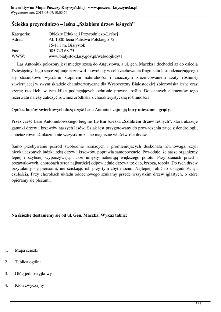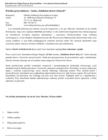 Interaktywna Mapa Puszczy Knyszyńskiej - www.puszcza-knyszynska.pl Wygenerowano: 2017-03-07/10:03:54 Ścieżka przyrodniczo – leśna „Szlakiem drzew leśnych” Kategoria: Adres: Fax: WWW: Obiekty Edukacji Przyrodniczo-Leśnej Al. 1000-lecia Państwa Polskiego 75 15-111 m. Białystok 085 743 68 75 www.bialystok.lasy.gov.pl/web/dojlidy/1 Las Antoniuk położony jest miedzy szosą do Augustowa, a ul. gen. Maczka i dochodzi aż do osiedla Dziesięciny. Jego serce zajmuje rezerwat, powołany w celu zachowania fragmentu lasu odznaczającego się stosunkowo wysokim stopniem naturalności i znacznym zróżnicowaniem szaty roślinnej zawierającej w swym składzie charakterystyczne dla Wysoczyzny Białostockiej zbiorowiska leśne oraz szereg rzadkich, w tym kilka podlegających ochronie prawnej roślin. Do cennych elementów tego rezerwatu należy zaliczyć również źródliska z charakterystyczną roślinnością. Oprócz borów świerkowych dużą część Lasu Antoniuk zajmują bory mieszane i grądy. Przez część Lasu Antoniukowskiego biegnie 1,5 km ścieżka „Szlakiem drzew leśnych”, która ukazuje gatunki drzew i krzewów naszych lasów. Szlak jest przygotowany do prowadzenia zajęć z dendrologii, chociaż również ukazuje nie wszystkim znane magiczne właściwości drzew. Samo przebywanie pośród swobodnie rosnących i promieniujących doskonałą równowagą, czyli nieokaleczonych ludzką ręką drzew i krzewów, poprawia samopoczucie. Powoduje, że nasze organizmy lepiej i szybciej wypoczywają, nasze umysły nabierają większego polotu. Przy stanach przed i pozawałowych, chorobach serca najbardziej odpowiednie drzewa to: dąb, brzoza, topola. Do tych drzew przytulamy się piersiami, nie ściskając ich przy tym zbyt mocno. Najlepiej robić to z łagodnością i czułością. Przy chorobach układu oddechowego szukamy przede wszystkim drzew iglastych, o które opieramy się plecami. Na ścieżkę dostaniemy się od ul. Gen. Maczka. Wykaz tablic: 1. Mapa ścieżki 2. Tablica ogólna 3. Głóg jednoszyjkowy 4. Klon zwyczajny 1/2 Interaktywna Mapa Puszczy Knyszyńskiej - www.puszcza-knyszynska.pl Wygenerowano: 2017-03-07/10:03:54 5. Grusza dzika 6. Grab zwyczajny 7. Leszczyna pospolita 8. Dąb szypułkowy 9. Lipa drobnolistna 10. Wiąz szypułkowy 11. Buk zwyczajny 12. Topola osika 13. Modrzew europejski 14. Sosna zwyczajna 15. Brzoza brodawkowata 16. Wiśnia ptasia 17. Świerk pospolity 18. Robinia akacjowa 2/2 Powered by TCPDF (www.tcpdf.org)