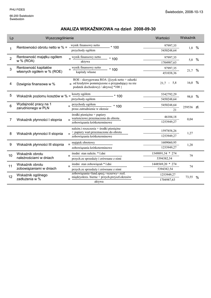 ANALIZA WSKAŹNIKOWA na dzień 2008-09-30