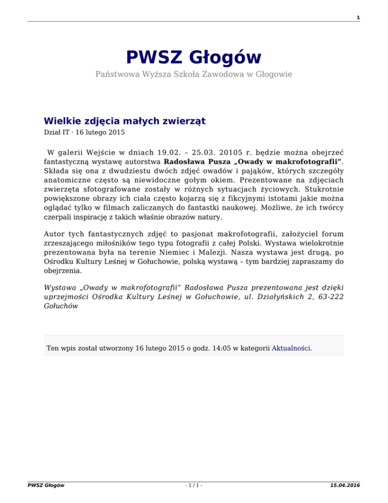 1 PWSZ Głogów Państwowa Wyższa Szkoła Zawodowa w Głogowie Wielkie zdjęcia małych zwierząt Dział IT · 16 lutego 2015 W galerii Wejście w dniach 19.02. – 25.03. 20105 r. będzie można obejrzeć fantastyczną wystawę autorstwa Radosława Pusza „Owady w makrofotografii”. Składa się ona z dwudziestu dwóch zdjęć owadów i pająków, których szczegóły anatomiczne często są niewidoczne gołym okiem. Prezentowane na zdjęciach zwierzęta sfotografowane zostały w różnych sytuacjach życiowych. Stukrotnie powiększone obrazy ich ciała często kojarzą się z fikcyjnymi istotami jakie można oglądać tylko w filmach zaliczanych do fantastki naukowej. Możliwe, że ich twórcy czerpali inspirację z takich właśnie obrazów natury. Autor tych fantastycznych zdjęć to pasjonat makrofotografii, założyciel forum zrzeszającego miłośników tego typu fotografii z całej Polski. Wystawa wielokrotnie prezentowana była na terenie Niemiec i Malezji. Nasza wystawa jest drugą, po Ośrodku Kultury Leśnej w Gołuchowie, polską wystawą – tym bardziej zapraszamy do obejrzenia. Wystawa „Owady w makrofotografii” Radosława Pusza prezentowana jest dzięki uprzejmości Ośrodka Kultury Leśnej w Gołuchowie, ul. Działyńskich 2, 63-222 Gołuchów Ten wpis został utworzony 16 lutego 2015 o godz. 14:05 w kategorii Aktualności. PWSZ Głogów -1/1- 15.04.2016