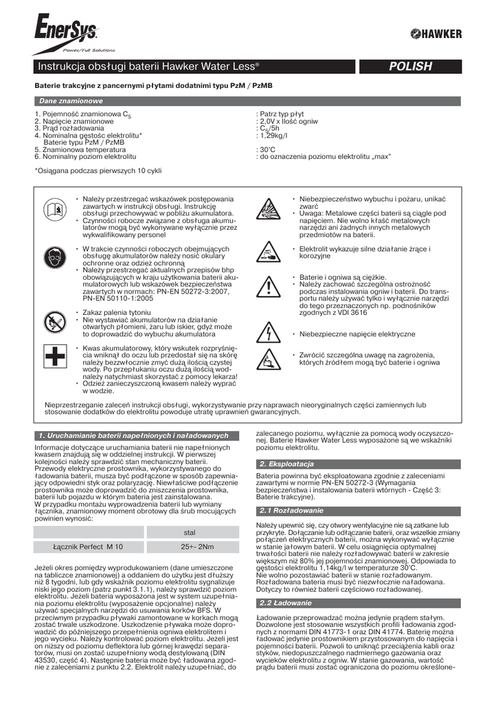 POLISH Instrukcja obsługi baterii Hawker Water Less® Baterie trakcyjne z pancernymi płytami dodatnimi typu PzM / PzMB Dane znamionowe 1. Pojemność znamionowa C5 2. Napięcie znamionowe 3. Prąd rozładowania 4. Nominalna gęstośc elektrolitu* Baterie typu PzM / PzMB 5. Znamionowa temperatura 6. Nominalny poziom elektrolitu : Patrz typ płyt : 2,0V x Ilość ogniw : C5/5h : 1,29kg/l : 30°C : do oznaczenia poziomu elektrolitu „max” *Osiągana podczas pierwszych 10 cykli • Należy przestrzegać wskazówek postępowania zawartych w instrukcji obsługi. Instrukcję obsługi przechowywać w pobliżu akumulatora. • Czynności robocze związane z obsługa akumu latorów mogą być wykonywane wyłącznie przez wykwalifikowany personel • Niebezpieczeństwo wybuchu i pożaru, unikać zwarć • Uwaga: Metalowe części baterii są ciągle pod napięciem. Nie wolno kłaść metalowych narzędzi ani żadnych innych metalowych przedmiotów na baterii. • W trakcie czynności roboczych obejmujących obsługę akumulatorów należy nosić okulary ochronne oraz odzież ochronną • Należy przestrzegać aktualnych przepisów bhp obowiązujących w kraju użytkowania baterii aku mulatorowych lub wskazówek bezpieczeństwa zawartych w normach: PNEN 502723:2007, PNEN 501101:2005 • Elektrolit wykazuje silne działanie żrące i korozyjne • Zakaz palenia tytoniu • Nie wystawiać akumulatorów na działanie otwartych płomieni, żaru lub iskier, gdyż może to doprowadzić do wybuchu akumulatora • Kwas akumulatorowy, który wskutek rozpryśnię cia wniknął do oczu lub przedostał się na skórę należy bezzwłocznie zmyć dużą ilością czystej wody. Po przepłukaniu oczu dużą ilością wod należy natychmiast skorzystać z pomocy lekarza! • Odzież zanieczyszczoną kwasem należy wyprać w wodzie. • Baterie i ogniwa są ciężkie. • Należy zachować szczególna ostrożność podczas instalowania ogniw i baterii. Do trans portu należy używać tylko i wyłącznie narzędzi do tego przeznaczonych np. podnośników zgodnych z VDI 3616 • Niebezpieczne napięcie elektryczne • Zwrócić szczególna uwagę na zagrożenia, których źródłem mogą być baterie i ogniwa Nieprzestrzeganie zaleceń instrukcji obsługi, wykorzystywanie przy naprawach nieoryginalnych części zamiennych lub stosowanie dodatków do elektrolitu powoduje utratę uprawnień gwarancyjnych. 1. Uruchamianie baterii napełnionych i naładowanych Informacje dotyczące uruchamiania baterii nie napełnionych kwasem znajdują się w oddzielnej instrukcji. W pierwszej kolejności należy sprawdzić stan mechaniczny baterii. Przewody elektryczne prostownika, wykorzystywanego do ładowania baterii, musza być podłączone w sposób zapewnia jący odpowiedni styk oraz polaryzację. Niewłaściwe podłączenie prostownika może doprowadzić do zniszczenia prostownika, baterii lub pojazdu w którym bateria jest zainstalowana. W przypadku montażu wyprowadzenia baterii lub wymiany łącznika, znamionowy moment obrotowy dla śrub mocujących powinien wynosić: stal Łącznik Perfect M 10 25+ 2Nm Jeżeli okres pomiędzy wyprodukowaniem (dane umieszczone na tabliczce znamionowej) a oddaniem do użytku jest dłuższy niż 8 tygodni, lub gdy wskaźnik poziomu elektrolitu sygnalizuje niski jego poziom (patrz punkt 3.1.1), należy sprawdzić poziom elektrolitu. Jeżeli bateria wyposażona jest w system uzupełnia nia poziomu elektrolitu (wyposażenie opcjonalne) należy używać specjalnych narzędzi do usuwania korków BFS. W przeciwnym przypadku pływaki zamontowane w korkach mogą zostać trwale uszkodzone. Uszkodzenie pływaka może dopro wadzić do późniejszego przepełnienia ogniwa elektrolitem i jego wycieku. Należy kontrolować poziom elektrolitu. Jeżeli jest on niższy od poziomu deflektora lub górnej krawędzi separa torów, musi on zostać uzupełniony wodą destylowaną (DIN 43530, część 4). Następnie bateria może być ładowana zgod nie z zaleceniami z punktu 2.2. Elektrolit należy uzupełniać, do zalecanego poziomu, wyłącznie za pomocą wody oczyszczo nej. Baterie Hawker Water Less wyposażone są we wskaźniki poziomu elektrolitu. 2. Eksploatacja Bateria powinna być eksploatowana zgodnie z zaleceniami zawartymi w normie PNEN 502723 (Wymagania bezpieczeństwa i instalowania baterii wtórnych Część 3: Baterie trakcyjne). 2.1 Rozładowanie Należy upewnić się, czy otwory wentylacyjne nie są zatkane lub przykryte. Dołączanie lub odłączanie baterii, oraz wszelkie zmiany połączeń elektrycznych baterii, można wykonywać wyłącznie w stanie jałowym baterii. W celu osiągnięcia optymalnej trwałości baterii nie należy rozładowywać baterii w zakresie większym niż 80% jej pojemności znamionowej. Odpowiada to gęstości elektrolitu 1,14kg/l w temperaturze 30°C. Nie wolno pozostawiać baterii w stanie rozładowanym. Rozładowana bateria musi być niezwłocznie naładowana. Dotyczy to również baterii częściowo rozładowanej. 2.2 Ładowanie Ładowanie przeprowadzać można jedynie prądem stałym. Dozwolone jest stosowanie wszystkich profili ładowania zgod nych z normami DIN 417731 oraz DIN 41774. Baterię można ładować jedynie prostownikiem przystosowanym do napięcia i pojemności baterii. Pozwoli to uniknąć przeciążenia kabli oraz styków, niedopuszczalnego nadmiernego gazowania oraz wycieków elektrolitu z ogniw. W stanie gazowania, wartość prądu baterii musi zostać ograniczona do poziomu określone go przez normę PNEN 502723. W przypadku, gdy prostownik nie był zakupiony łącznie z baterią, należy zlecić serwisowi producenta baterii określenie przydatności prostownika. Podczas ładowania należy zapewnić odpowiednią wentylację baterii. W trakcie ładowania należy otworzyć drzwi, otworzyć albo zdjąć pokrywę skrzyni baterii, lub osłony komory, w której zamontowana jest bateria. Jeżeli konstrukcja wózka uniemożliwia zapewnienie odpowiednie