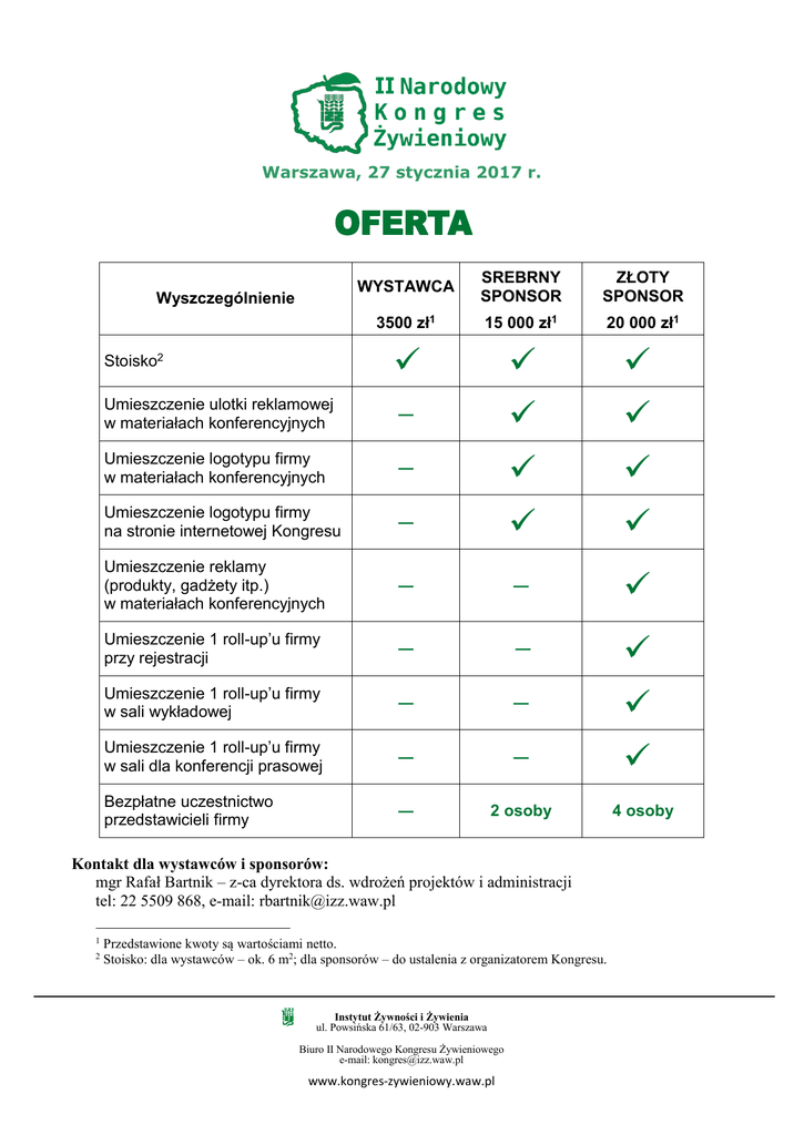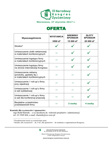Warszawa, 27 stycznia 2017 r. WYSTAWCA SREBRNY SPONSOR ZŁOTY SPONSOR 3500 zł1 15 000 zł1 20 000 zł1 Stoisko2 Umieszczenie ulotki reklamowej w materiałach konferencyjnych ― Umieszczenie logotypu firmy w materiałach konferencyjnych ― Umieszczenie logotypu firmy na stronie internetowej Kongresu ― Umieszczenie reklamy (produkty, gadżety itp.) w materiałach konferencyjnych ― ― Umieszczenie 1 roll-up’u firmy przy rejestracji ― ― Umieszczenie 1 roll-up’u firmy w sali wykładowej ― ― Umieszczenie 1 roll-up’u firmy w sali dla konferencji prasowej ― ― Bezpłatne uczestnictwo przedstawicieli firmy ― 2 osoby Wyszczególnienie Kontakt dla wystawców i sponsorów: mgr Rafał Bartnik – z-ca dyrektora ds. wdrożeń projektów i administracji tel: 22 5509 868, e-mail: [email protected] 1 2 Przedstawione kwoty są wartościami netto. Stoisko: dla wystawców – ok. 6 m2; dla sponsorów – do ustalenia z organizatorem Kongresu. Instytut Żywności i Żywienia ul. Powsińska 61/63, 02-903 Warszawa Biuro II Narodowego Kongresu Żywieniowego e-mail: [email protected] www.kongres-zywieniowy.waw.pl 4 osoby