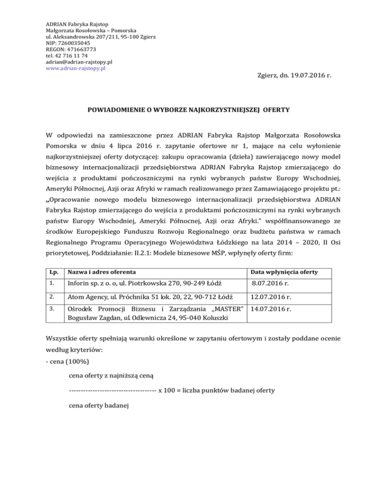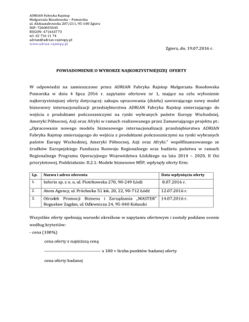 ADRIAN Fabryka Rajstop Małgorzata Rosołowska – Pomorska ul. Aleksandrowska 207/211, 95-100 Zgierz NIP: 7260035045 REGON: 471663773 tel. 42 716 11 74 [email protected] www.adrian-rajstopy.pl Zgierz, dn. 19.07.2016 r. POWIADOMIENIE O WYBORZE NAJKORZYSTNIEJSZEJ OFERTY W odpowiedzi na zamieszczone przez ADRIAN Fabryka Rajstop Małgorzata Rosołowska Pomorska w dniu 4 lipca 2016 r. zapytanie ofertowe nr 1, mające na celu wyłonienie najkorzystniejszej oferty dotyczącej: zakupu opracowania (dzieła) zawierającego nowy model biznesowy internacjonalizacji przedsiębiorstwa ADRIAN Fabryka Rajstop zmierzającego do wejścia z produktami pończoszniczymi na rynki wybranych państw Europy Wschodniej, Ameryki Północnej, Azji oraz Afryki w ramach realizowanego przez Zamawiającego projektu pt.: ,,Opracowanie nowego modelu biznesowego internacjonalizacji przedsiębiorstwa ADRIAN Fabryka Rajstop zmierzającego do wejścia z produktami pończoszniczymi na rynki wybranych państw Europy Wschodniej, Ameryki Północnej, Azji oraz Afryki.” współfinansowanego ze środków Europejskiego Funduszu Rozwoju Regionalnego oraz budżetu państwa w ramach Regionalnego Programu Operacyjnego Województwa Łódzkiego na lata 2014 – 2020, II Osi priorytetowej, Poddziałanie: II.2.1: Modele biznesowe MŚP, wpłynęły oferty firm: Lp. Nazwa i adres oferenta Data wpłynięcia oferty 1. Inforin sp. z o. o, ul. Piotrkowska 270, 90-249 Łódź 8.07.2016 r. 2. Atom Agency, ul. Próchnika 51 lok. 20, 22, 90-712 Łódź 12.07.2016 r. 3. Ośrodek Promocji Biznesu i Zarządzania „MASTER” 14.07.2016 r. Bogusław Zagdan, ul. Odlewnicza 24, 95-040 Koluszki Wszystkie oferty spełniają warunki określone w zapytaniu ofertowym i zostały poddane ocenie według kryteriów: - cena (100%) cena oferty z najniższą ceną ------------------------------------- x 100 = liczba punktów badanej oferty cena oferty badanej ADRIAN Fabryka Rajstop Małgorzata Rosołowska – Pomorska ul. Aleksandrowska 207/211, 95-100 Zgierz NIP: 7260035045 REGON: 471663773 tel. 42 716 11 74 [email protected] www.adrian-rajstopy.pl Lp. Nazwa i adres oferenta Ilość otrzymanych punktów 1. Inforin sp. z o. o, ul. Piotrkowska 270, 90-249 Łódź 100 pkt. 2. Atom Agency, ul. Próchnika 51 lok. 20, 22, 90-712 Łódź 97,25 pkt. 3. Ośrodek Promocji Biznesu i Zarządzania „MASTER” 94,64 pkt. Bogusław Zagdan, ul. Odlewnicza 24, 95-040 Koluszki Oferta firmy Inforin sp. z o.o. otrzymała najwyższą liczbę punktów (100 pkt.) i została uznana za najkorzystniejszą.