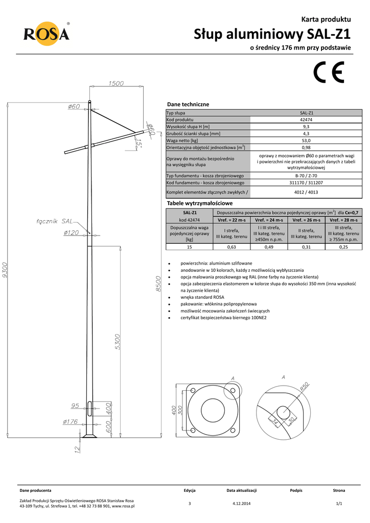 Karta produktu Słup aluminiowy SAL-Z1 o średnicy 176 mm przy podstawie Dane techniczne Typ słupa Kod produktu Wysokośd słupa H *m+ Grubośd ścianki słupa *mm+ Waga netto [kg] Orientacyjna objętośd jednostkowa *m3] SAL-Z1 42474 9,3 4,3 53,0 0,98 oprawy z mocowaniem Ø60 o parametrach wagi i powierzchni nie przekraczających danych z tabeli wytrzymałościowej Oprawy do montażu bezpośrednio na wysięgniku słupa Typ fundamentu - kosza zbrojeniowego Kod fundamentu - kosza zbrojeniowego B-70 / Z-70 311170 / 311207 Komplet elementów złącznych zwykłych / 4012 / 4013 Tabele wytrzymałościowe SAL-Z1 kod 42474 Dopuszczalna powierzchnia boczna pojedynczej oprawy [m2] dla Cx=0,7 Vref. = 22 m-s Vref. = 24 m-s Vref. = 26 m-s Vref. = 28 m-s Dopuszczalna waga pojedynczej oprawy [kg] I strefa, III kateg. terenu I i III strefa, III kateg. terenu ≥450m n.p.m. II strefa, III kateg. terenu III strefa, III kateg. terenu ≥ 755m n.p.m. 15 0,63 0,49 0,31 0,25 powierzchnia: aluminium szlifowane anodowanie w 10 kolorach, każdy z możliwością wybłyszczania opcja malowania proszkowego wg RAL (inne farby na życzenie klienta) opcja zabezpieczenia elastomerem w kolorze słupa do wysokości 350 mm (inna wysokośd na życzenie klienta) wnęka standard ROSA pakowanie: włóknina polipropylenowa możliwośd mocowania zakooczeo świecących certyfikat bezpieczeostwa biernego 100NE2 Dane producenta Zakład Produkcji Sprzętu Oświetleniowego ROSA Stanisław Rosa 43-109 Tychy, ul. Strefowa 1, tel. +48 32 73 88 901, www.rosa.pl Edycja Data aktualizacji 3 4.12.2014 Podpis Strona 1/1