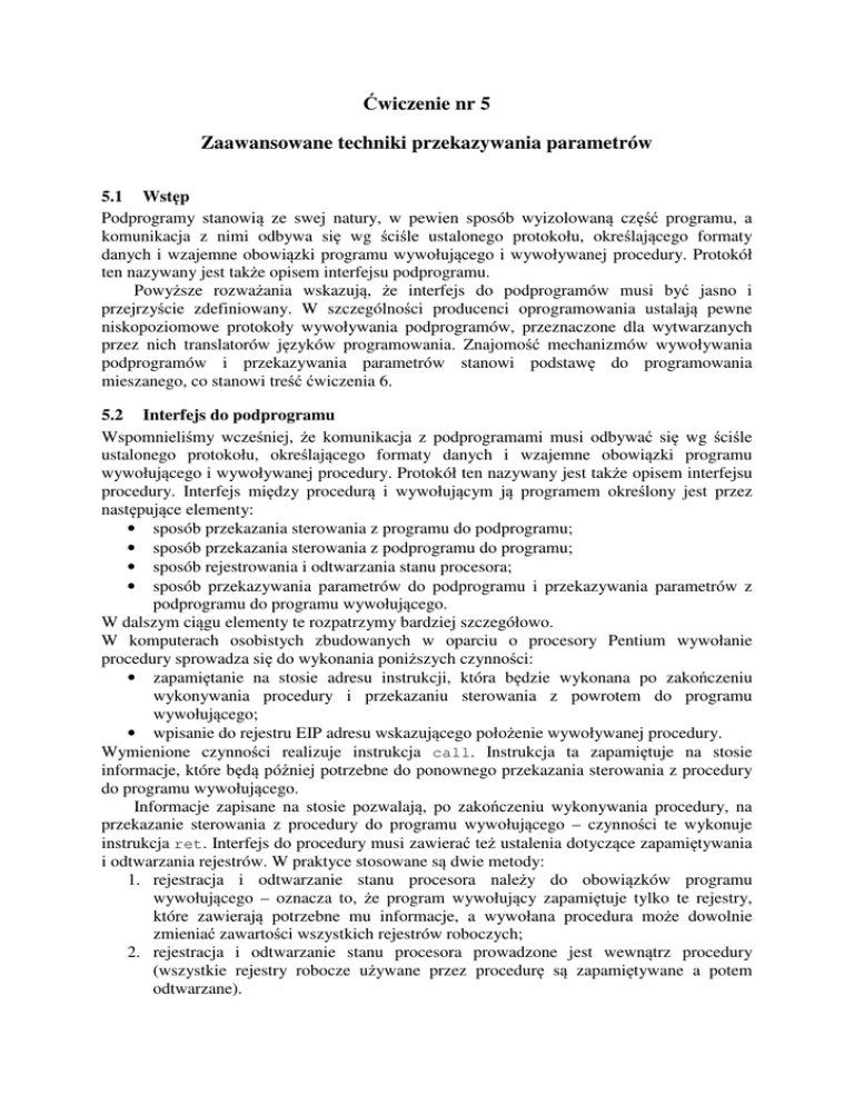 Ćwiczenie nr 5 Zaawansowane techniki przekazywania parametrów 5.1 Wstęp Podprogramy stanowią ze swej natury, w pewien sposób wyizolowaną część programu, a komunikacja z nimi odbywa się wg ściśle ustalonego protokołu, określającego formaty danych i wzajemne obowiązki programu wywołującego i wywoływanej procedury. Protokół ten nazywany jest także opisem interfejsu podprogramu. Powyższe rozważania wskazują, że interfejs do podprogramów musi być jasno i przejrzyście zdefiniowany. W szczególności producenci oprogramowania ustalają pewne niskopoziomowe protokoły wywoływania podprogramów, przeznaczone dla wytwarzanych przez nich translatorów języków programowania. Znajomość mechanizmów wywoływania podprogramów i przekazywania parametrów stanowi podstawę do programowania mieszanego, co stanowi treść ćwiczenia 6. 5.2 Interfejs do podprogramu Wspomnieliśmy wcześniej, że komunikacja z podprogramami musi odbywać się wg ściśle ustalonego protokołu, określającego formaty danych i wzajemne obowiązki programu wywołującego i wywoływanej procedury. Protokół ten nazywany jest także opisem interfejsu procedury. Interfejs między procedurą i wywołującym ją programem określony jest przez następujące elementy: • sposób przekazania sterowania z programu do podprogramu; • sposób przekazania sterowania z podprogramu do programu; • sposób rejestrowania i odtwarzania stanu procesora; • sposób przekazywania parametrów do podprogramu i przekazywania parametrów z podprogramu do programu wywołującego. W dalszym ciągu elementy te rozpatrzymy bardziej szczegółowo. W komputerach osobistych zbudowanych w oparciu o procesory Pentium wywołanie procedury sprowadza się do wykonania poniższych czynności: • zapamiętanie na stosie adresu instrukcji, która będzie wykonana po zakończeniu wykonywania procedury i przekazaniu sterowania z powrotem do programu wywołującego; • wpisanie do rejestru EIP adresu wskazującego położenie wywoływanej procedury. Wymienione czynności realizuje instrukcja call. Instrukcja ta zapamiętuje na stosie informacje, które będą później potrzebne do ponownego przekazania sterowania z procedury do programu wywołującego. Informacje zapisane na stosie pozwalają, po zakończeniu wykonywania procedury, na przekazanie sterowania z procedury do programu wywołującego – czynności te wykonuje instrukcja ret. Interfejs do procedury musi zawierać też ustalenia dotyczące zapamiętywania i odtwarzania rejestrów. W praktyce stosowane są dwie metody: 1. rejestracja i odtwarzanie stanu procesora należy do obowiązków programu wywołującego – oznacza to, że program wywołujący zapamiętuje tylko te rejestry, które zawierają potrzebne mu informacje, a wywołana procedura może dowolnie zmieniać zawartości wszystkich rejestrów roboczych; 2. rejestracja i odtwarzanie stanu procesora prowadzone jest wewnątrz procedury (wszystkie rejestry robocze używane przez procedurę są zapamiętywane a potem odtwarzane). Zauważmy, że metoda (2) centralizuje zapamiętywanie rejestrów, podczas gdy metoda (1) wymaga zapamiętywania i odtwarzania rejestrów, odpowiednio, przed i po każdym wywołaniu podprogramu. Jeśli procedura wywoływana jest wielokrotnie, to kod programu w przypadku (1) będzie wyraźnie dłuższy. Z kolei w metodzie (2) zapamiętywane i odtwarzane mogą być także i te rejestry, których zawartość nie ma znaczenia dla programu wywołującego. Wydaje się, że metoda (2) stosowana jest częściej. Ostatnim elementem składającym się na opis interfejsu podprogramu są zasady przekazywania parametrów do i z procedury. O ile poprzednio omówione elementy są w zasadzie stałe dla różnych systemów programowania komputerów, to sposób przekazywania parametrów różni się dość znacznie w poszczególnych systemach. Używane są dwa podstawowe sposoby przekazywania parametrów: • przekazywanie przez wartość (ang. call by value), co oznacza, że do podprogramu przekazywana jest bezpośrednio wartość parametru, którym może być liczba, tablica liczb, łańcuch znaków, itp.; • przekazywanie przez adres (ang. call by location), co oznacza, że do podprogramu przekazywany jest adres lokacji pamięci, w której znajduje się wartość podawana do podprogramu. Przekazywanie adresu zmiennej zamiast jej wartości nieznacznie wydłuża kod procedury – trzeba bowiem wprowadzić dodatkowe rozkazy, które wyznaczą wartość zmiennej w oparciu o podany adres. Jednak taki sposób przekazywania ma sporo zalet, szczególnie gdy parametrem jest tablica – można wówczas zamiast przekazywania wartości poszczególnych elementów tablicy podać tylko adres jej pierwszego elementu. Ponadto, przy przekazywaniu „przez adres” podprogram uzyskuje bezpośredni dostęp do zmiennej w programie wywołującym. Pozwala to m.in. na wpisanie wyniku uzyskanego w trakcie wykonywania podprogramu bezpośrednio do tej zmiennej. Parametry te, zarówno w postaci jawnych wartości, jak też i adresów mogą być przekazywane do podprogramu różnymi drogami. I tak parametry podprogramów systemowych BIOSu i DOSu przekazuje się najczęściej poprzez rejestry robocze. Najbardziej rozpowszechnione jest jednak przekazywanie parametrów przez stos: program wywołujący wpisuje wymagane parametry na stos, po czym wykonuje instrukcję call. Znane jest także przekazywanie parametrów „przez ślad”, czyli przez obszary pamięci znajdujące się bezpośrednio za instrukcją call. Wreszcie można przekazywać parametry przez zarezerwowane obszary pamięci o ustalonych adresach. Dla każdej z wymienionych dróg przekazywania parametrów trzeba poczynić ustalenia dotyczące przekazywania parametrów w rejestrach roboczych, określić kto jest odpowiedzialny (podprogram czy program wywołujący) za usunięcie wykorzystanych parametrów ze stosu, i podać ewentualnie inne ograniczenia. 5.3 Technika prz